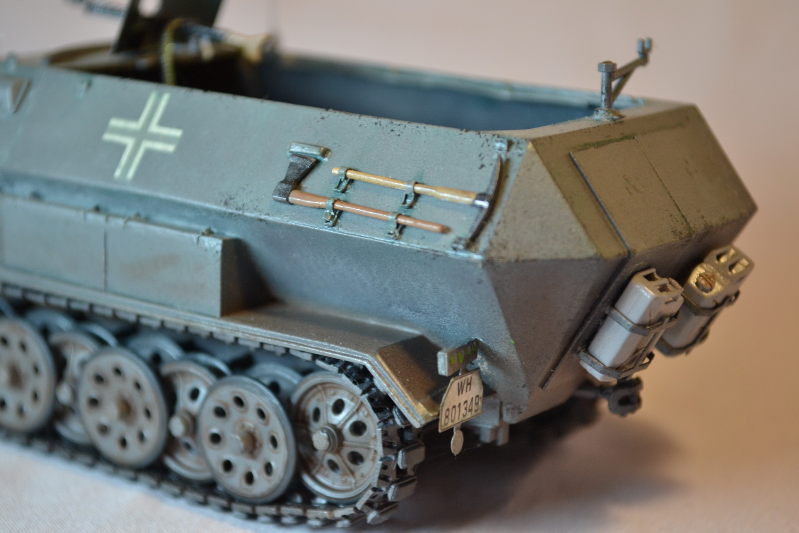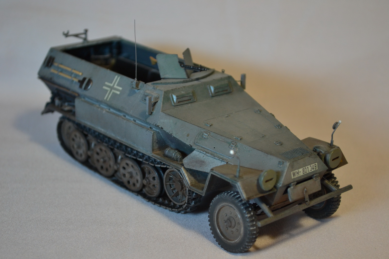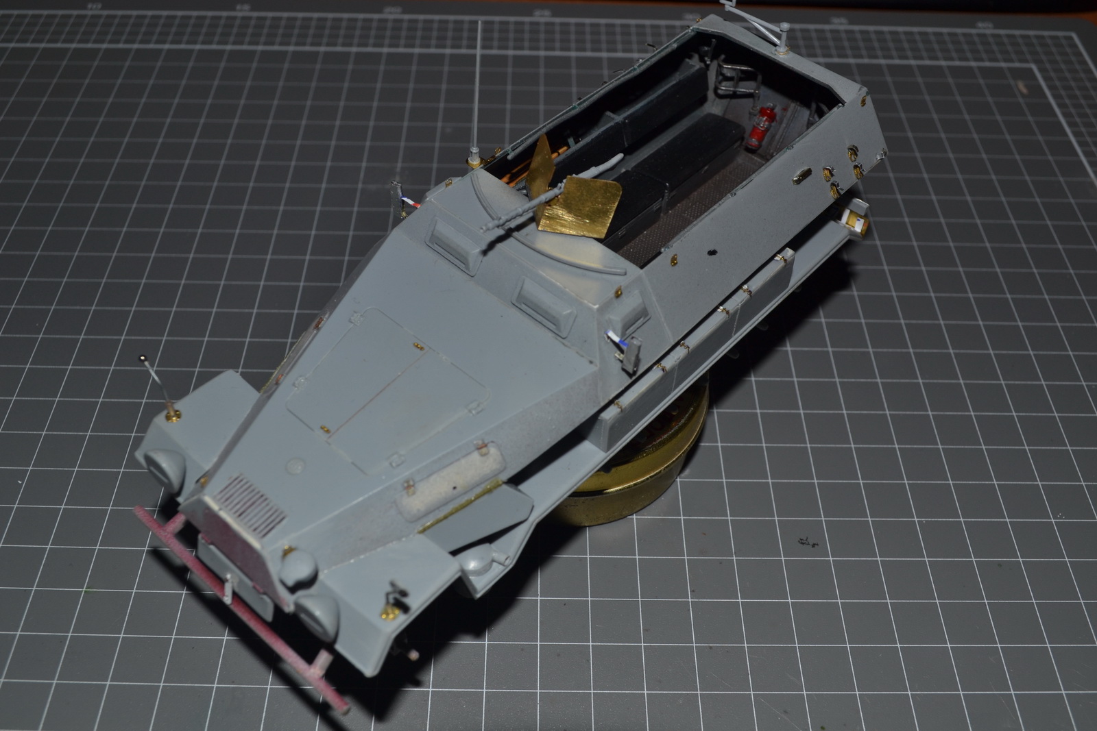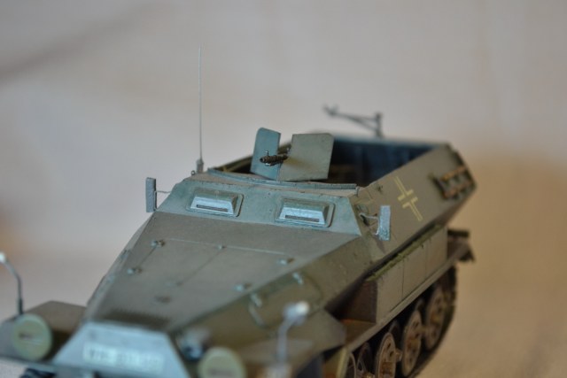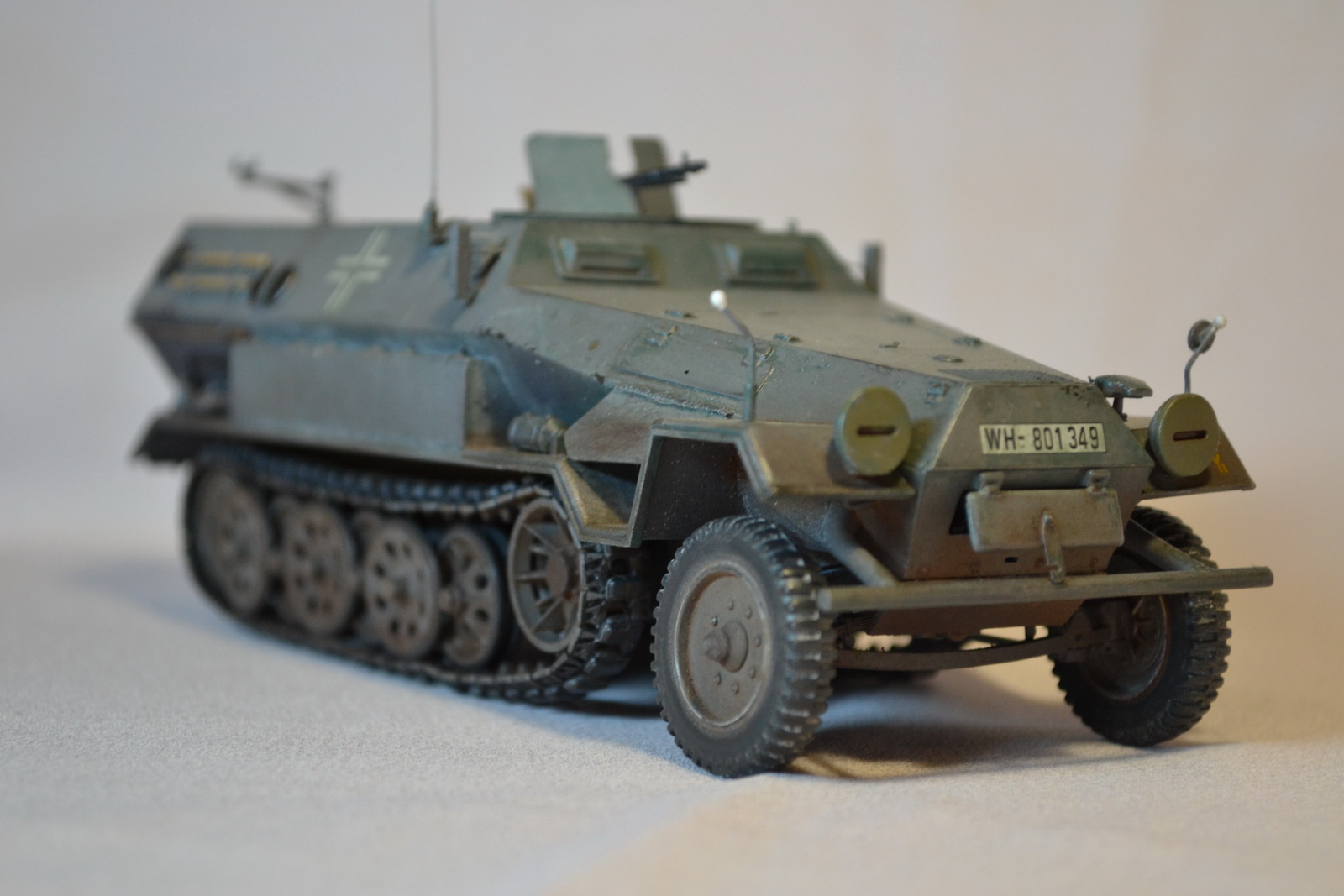 Мой почтение каропчанам) Представляю на Ваш строгий суд замученный мной БТР. Исходная «каропка» - известный набор от Звезды 3572. Так как, у исходника был установлен ряд отличий от реальных прототипов мода ausf. B, то большинство узлов и украшений были доработаны с помощью фольги, проволоки, литников и набора травления от Мира Моделей ММТ35003 1/35 фтд Sd.Kfz.251/3. С прицелом на будущую диораму посадил за баранку «Ганса» (опять-таки от Звезды набор 3585) – пришлось его долго вгонять в габариты (при том, что весь фарш салона, включая рулевое колесо, на момент подгонки был удален). На мой взгляд, сей «Ганс» явно крупноват.
