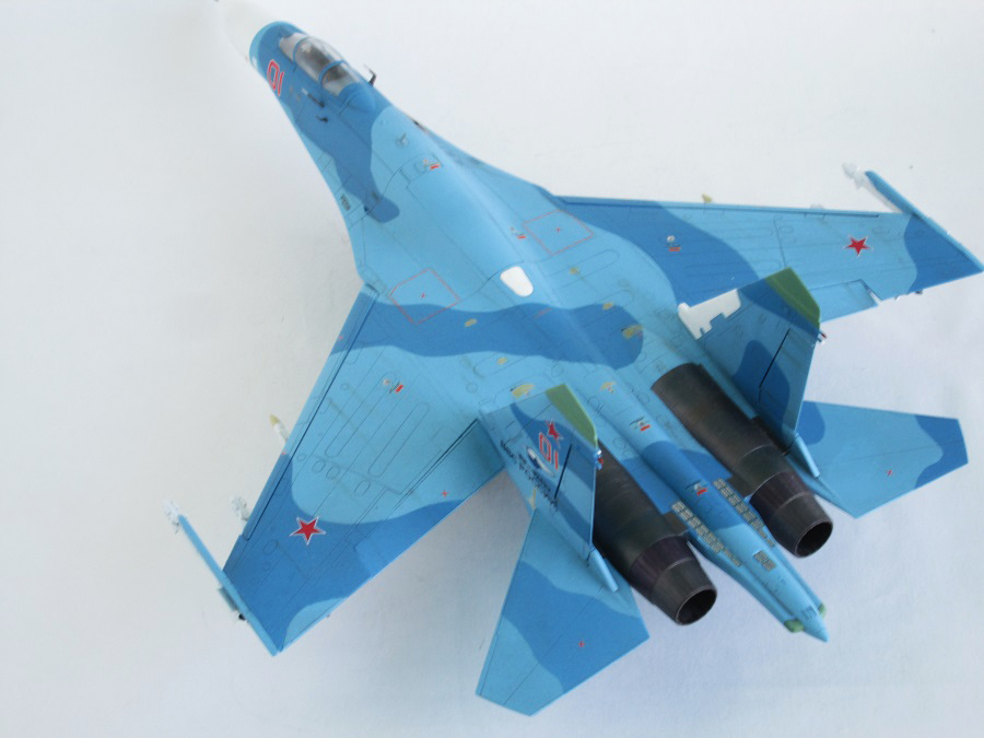 Дмитрий,приветствую! Модель получилась!Красиво и без фанатизма. Единственно,что мне показалось не совсем правдоподобным, ну 48м как то не естественно,это незаконченные сопла.То есть тонировка самих лепестков.Они сливаются в общую массу.И граница жаропрочной обшивки двигателя и фюзеля не совсем та,и не так выражены лючки на ней.При общем обозрении это тёмным пятном выделяется.Попробуйте поиграться графитным карандашом и уховёрткой.Понравится вскроете гл. лаком и всё или футурой.Ах,да.Немножко нос на миллиметр-полтора поднять бы,такой эффект,как будто на тормоз нажали а пилота то нет.