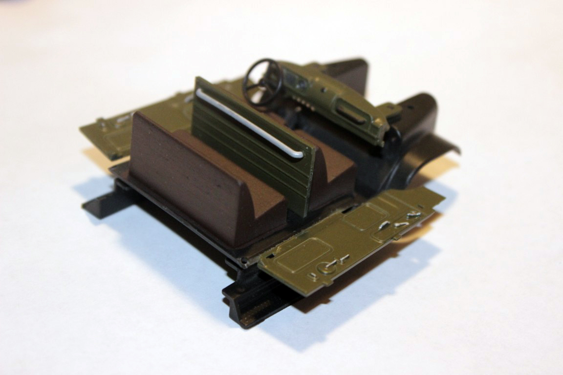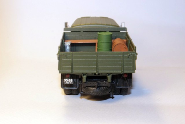 Лавка кузове, так же бочки для оживления кузова, фляги; нарощены борта - боковые на одну доску, передний на две; второй люк над водителем; дублеры убраны; укорочен задний свес рамы; фонари заменены на раннего - ФП101 круглые. Машина с экипажем помогает где то в Ленинграде и области.