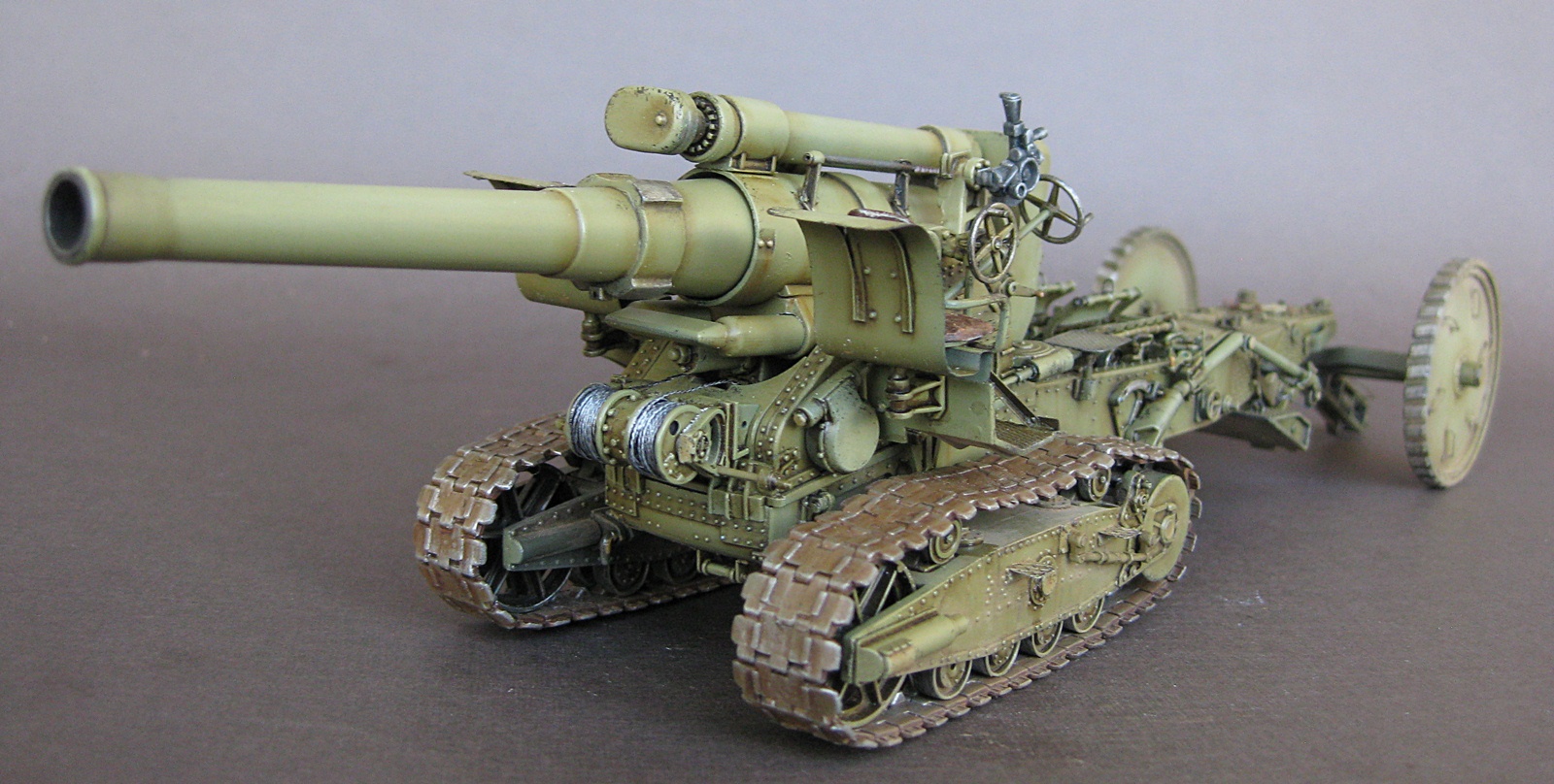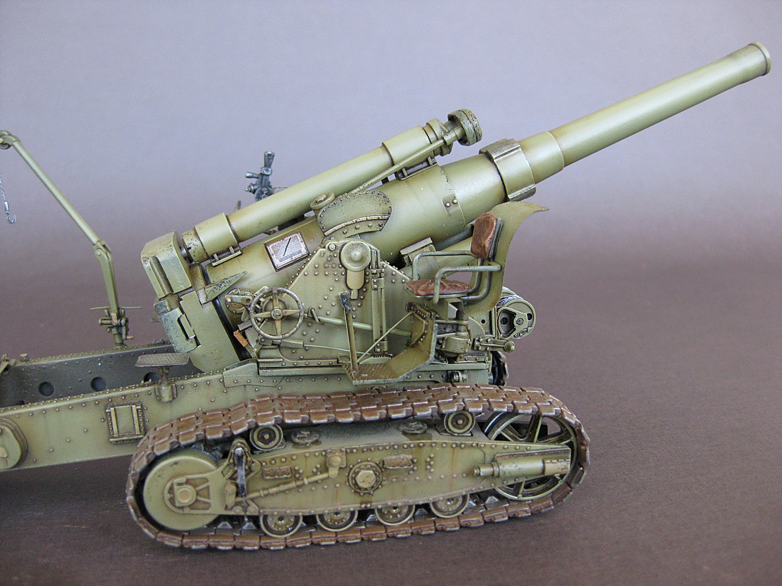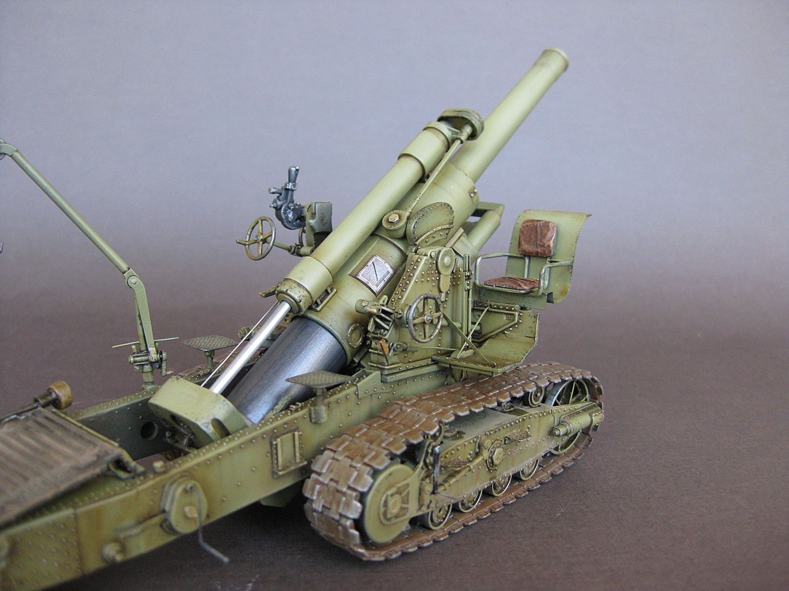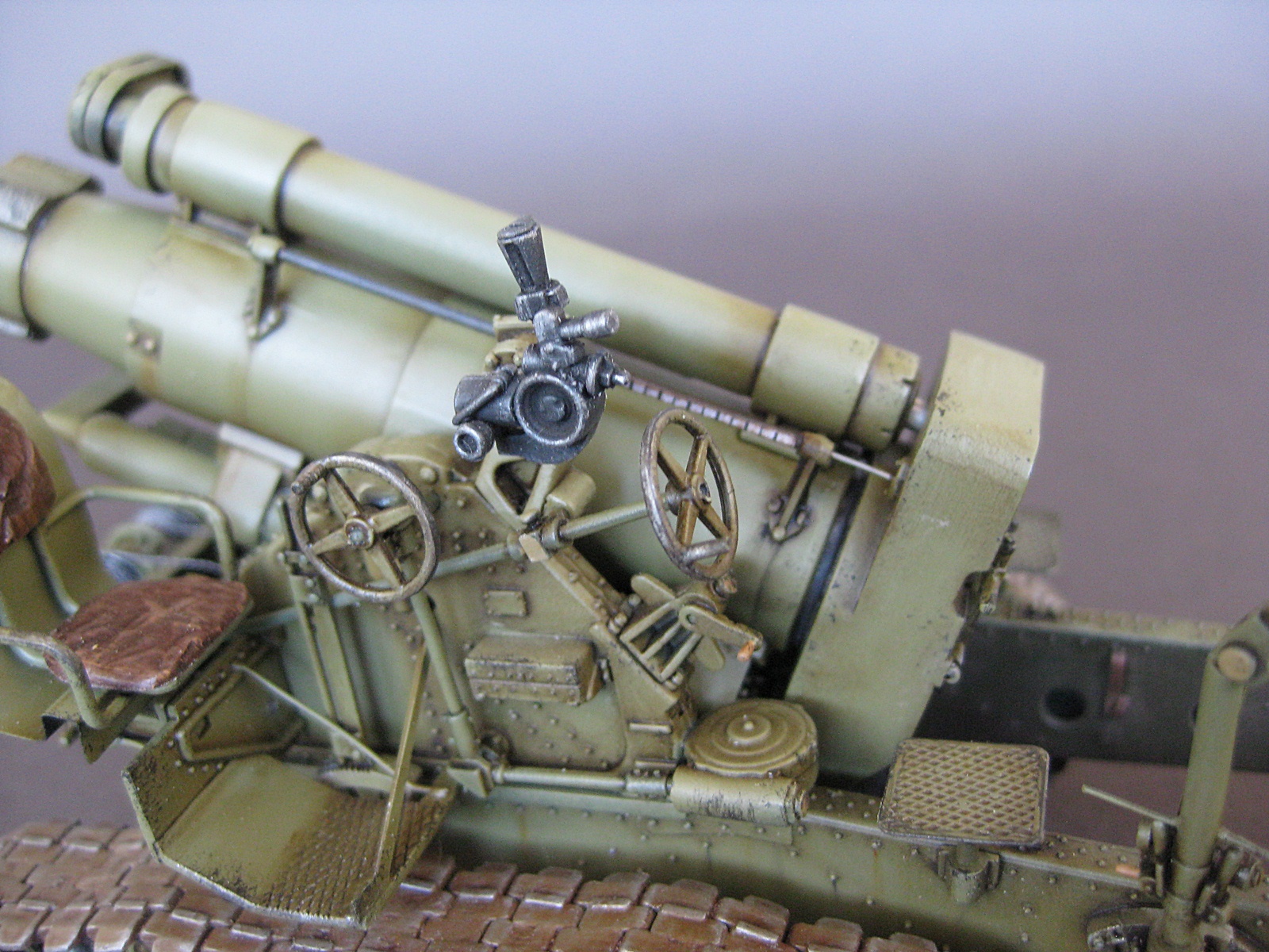 - В данном случае за основу был взят набор от "трумпетер"Бр-2, а именно станина,система наведения,передок и кзенник.От ВЭ-ходовая,снарядные тележки,ствол и ручки наведения.Сам изготовил внутрению часть ствола,заменил и доделал различные ручки,дработал кран и сидения.Ствол отводится назад.