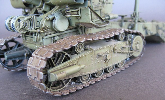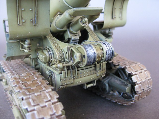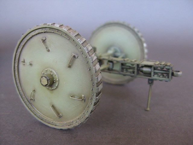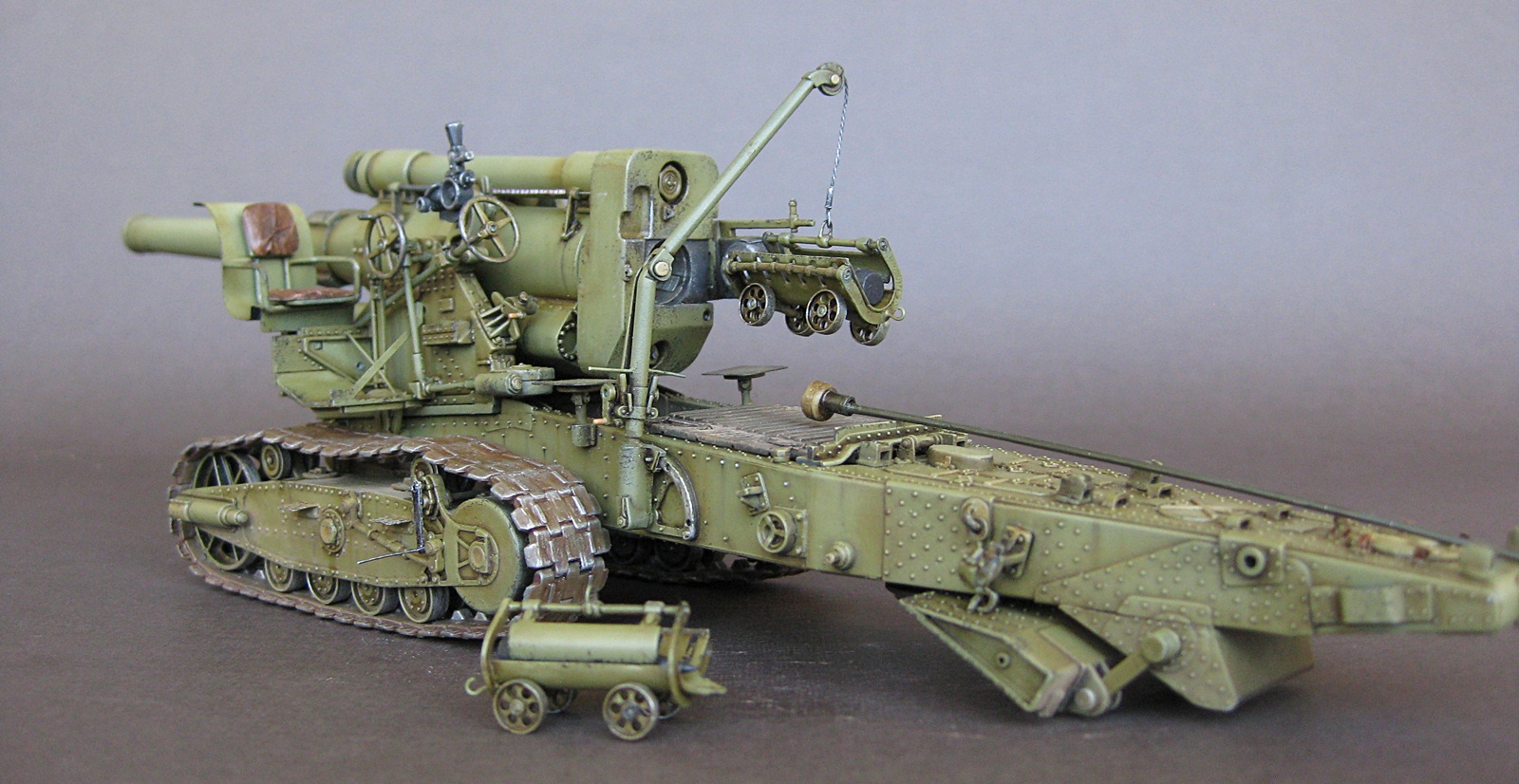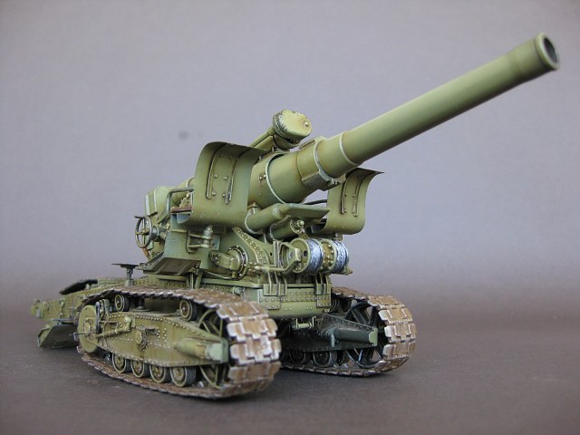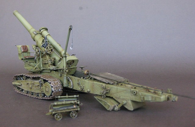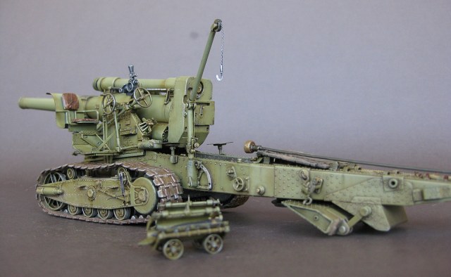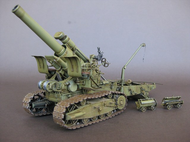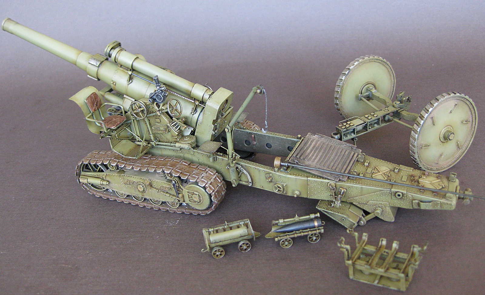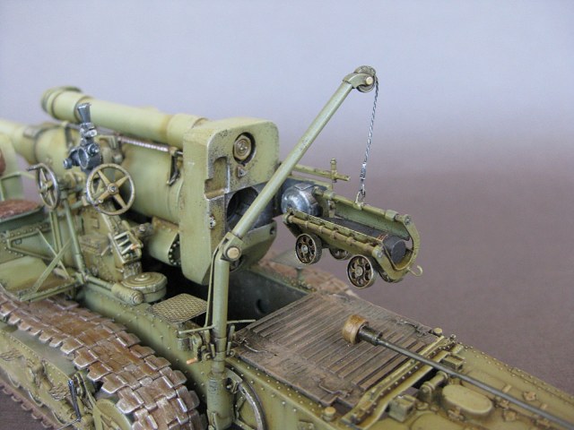 - В данном случае за основу был взят набор от "трумпетер"Бр-2, а именно станина,система наведения,передок и кзенник.От ВЭ-ходовая,снарядные тележки,ствол и ручки наведения.Сам изготовил внутрению часть ствола,заменил и доделал различные ручки,дработал кран и сидения.Ствол отводится назад.
