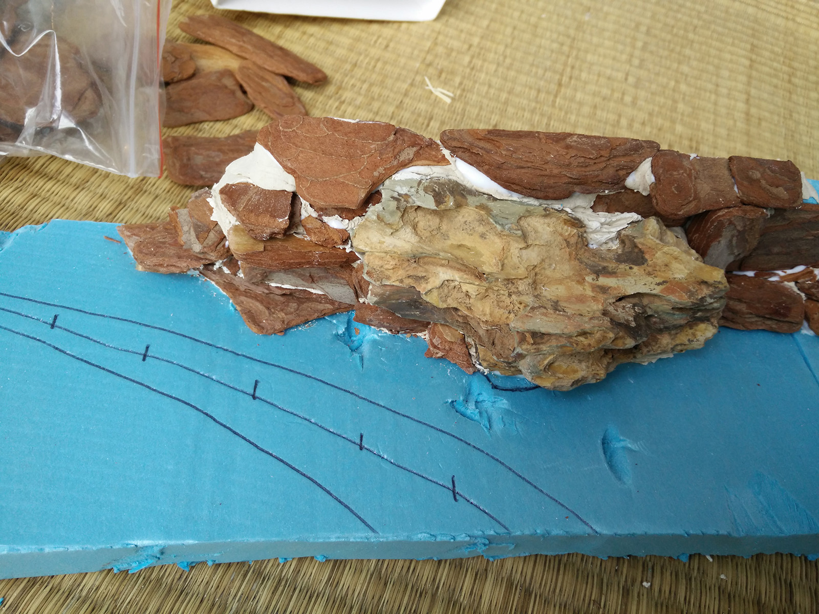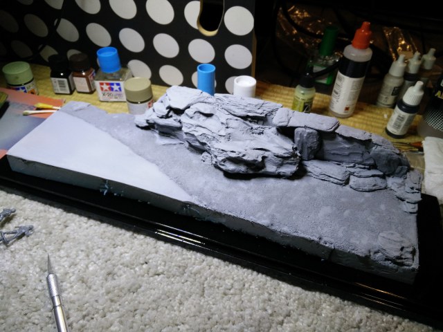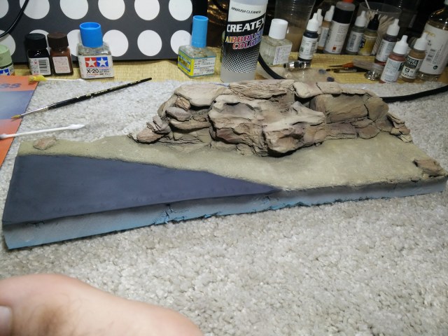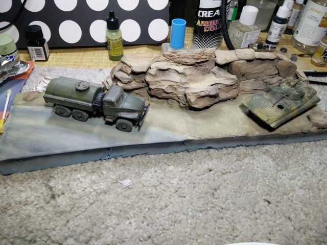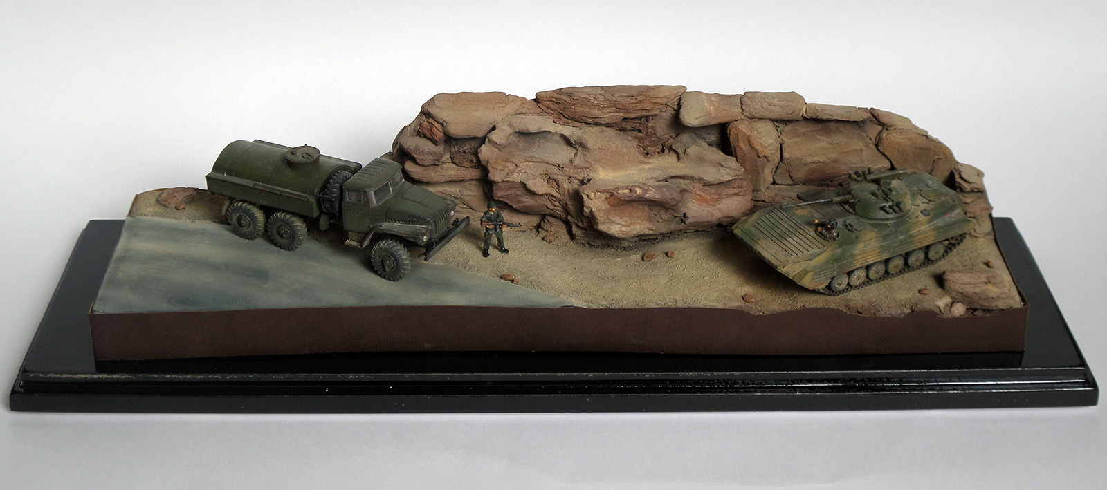 Основа для диорамы была изготовлена из пенопласта и цемента. После я оклеил ее поверхность песком и окрасил. Камни сделаны из мелких натуральных камней и деревянной щепы. При работе я опирался на архивные фотографии и книги о войне в Афганистане, что касается ландшафта, то я использовал современные фото и технику выветривания.