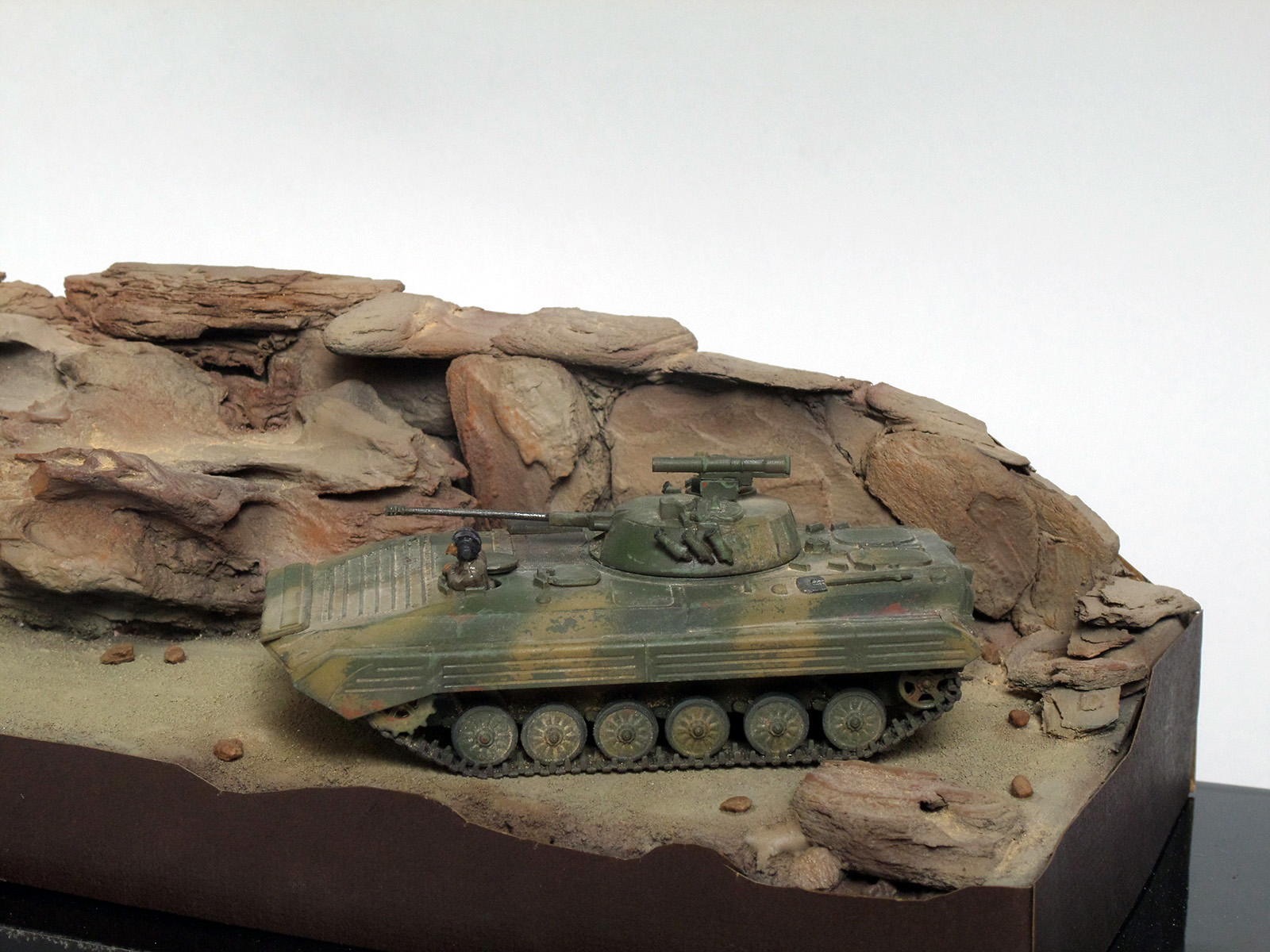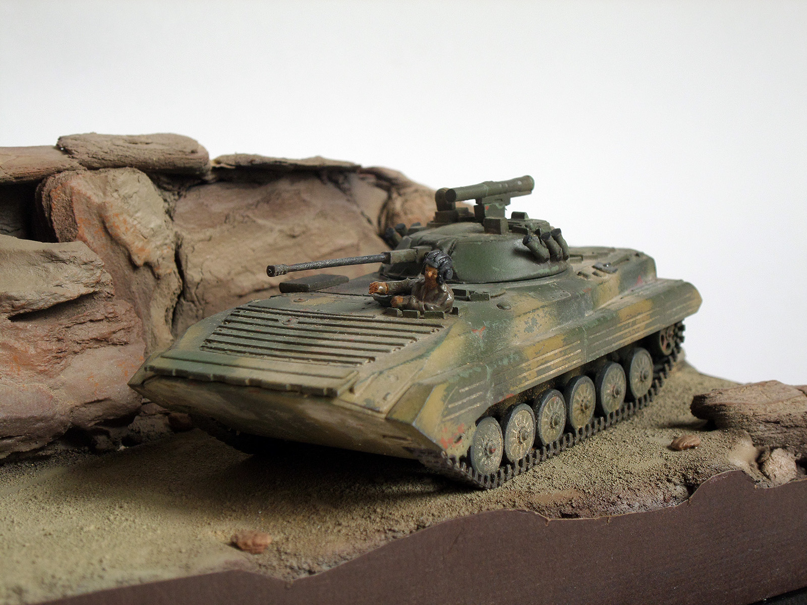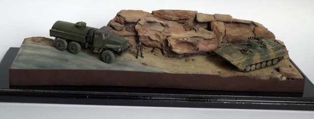 В данной работе я использовал БМП компании ACE, бензовоз из очень детального комплекта компании ICM, а также фигуры от Orion. Что касается цвета, то мною были выбраны краски компаний MIG, Tamiya и Vallejo. Также я впервые использовал жидкость для сколов и остался доволен. После покраски БМП я понял, что песочный цвет оказался слишком желтым, поэтому пришлось немного поиграть с цветами и устранить желтизну. Выветривание было сделано с эмалями Тамия и моей собственной пастелью.