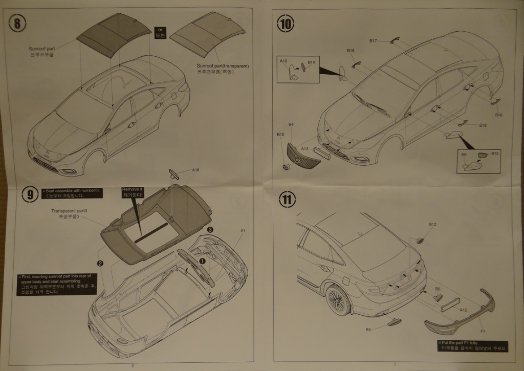 Пиветствую Вас дорогие Каропчане и представляю вашему вниманию творение от ACADEMY машинку Hyundai AZERA. В кортонной коробке лежит инструкция по сборке, салон автомобиля, днище автомобиля, 2 литника чёрного цвета с деталями внутренней отделки, литник деталей хром, 4 литничка остекленения и оптики, 2 варианта крыши (с люком и без), резина и оси для колёс, 2 листочка:1 с наклейками и 1 с декалями. В целом качество отливки деталей выполнен очень хорошо, облоя и утяжин не обнаружено. А вот по самой модели в общем и по детализации как-то не очень.
