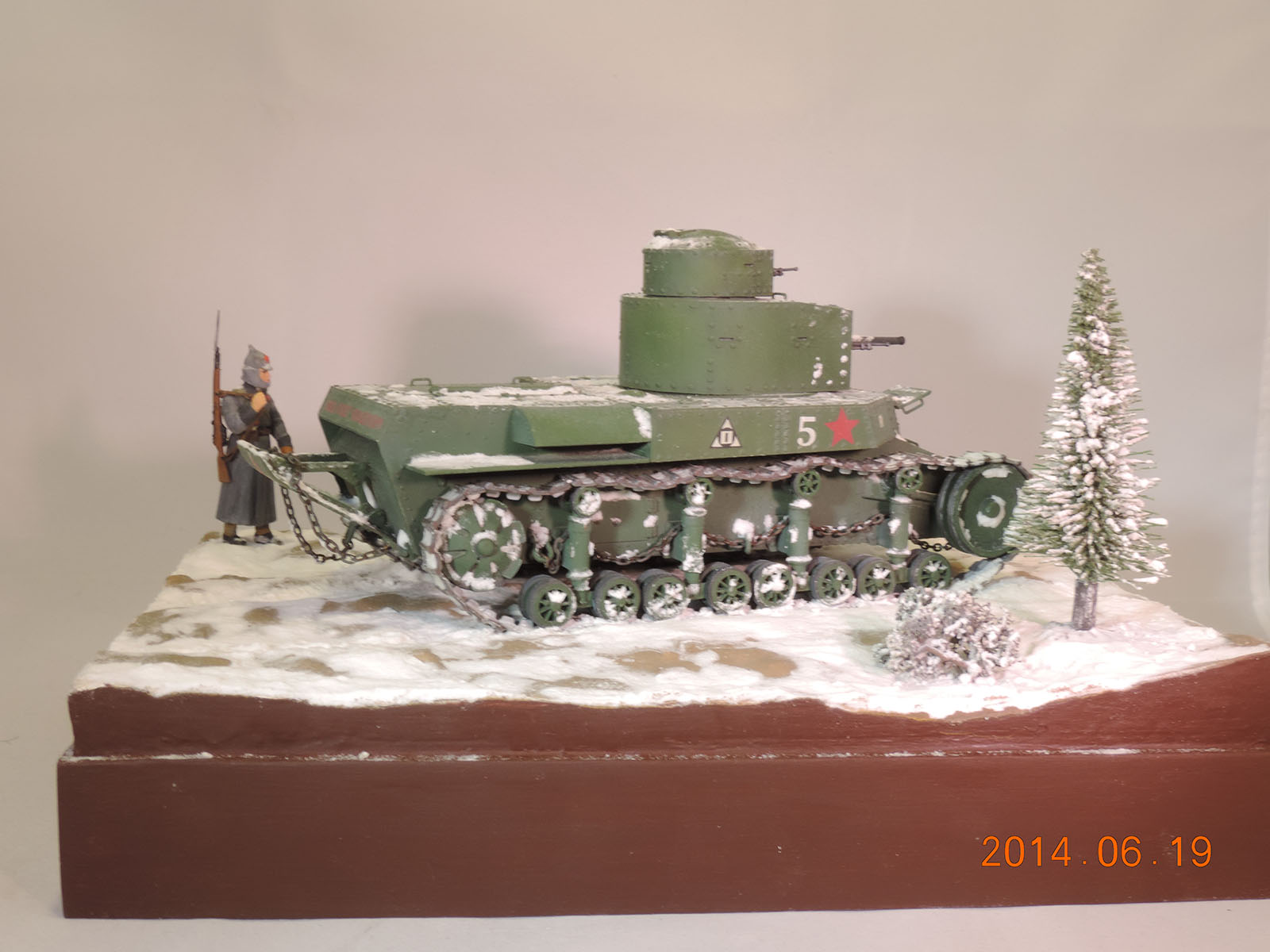 Да, сам танк обработан по минимуму, но есть там смывка и немного фильтров, ну очень немного. Основное в этой диораме был снег и именно первый. Еще красноармеец, на которого ушло времени больше чем на танк. Это, скорее всего, моя вершина в раскраске фигурок. То что на него никто не обратил внимание - это для меня и плохо и хорошо. Плохо тем, что вершина именно моего творчества в раскраске фигурок в объективном постороннем восприятии таковой не является. А хорошо тем, что он не настолько плох чтобы привлекать внимание своей косячностью.