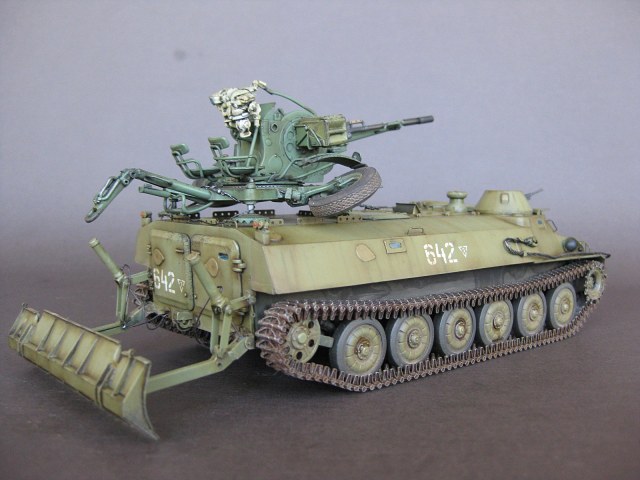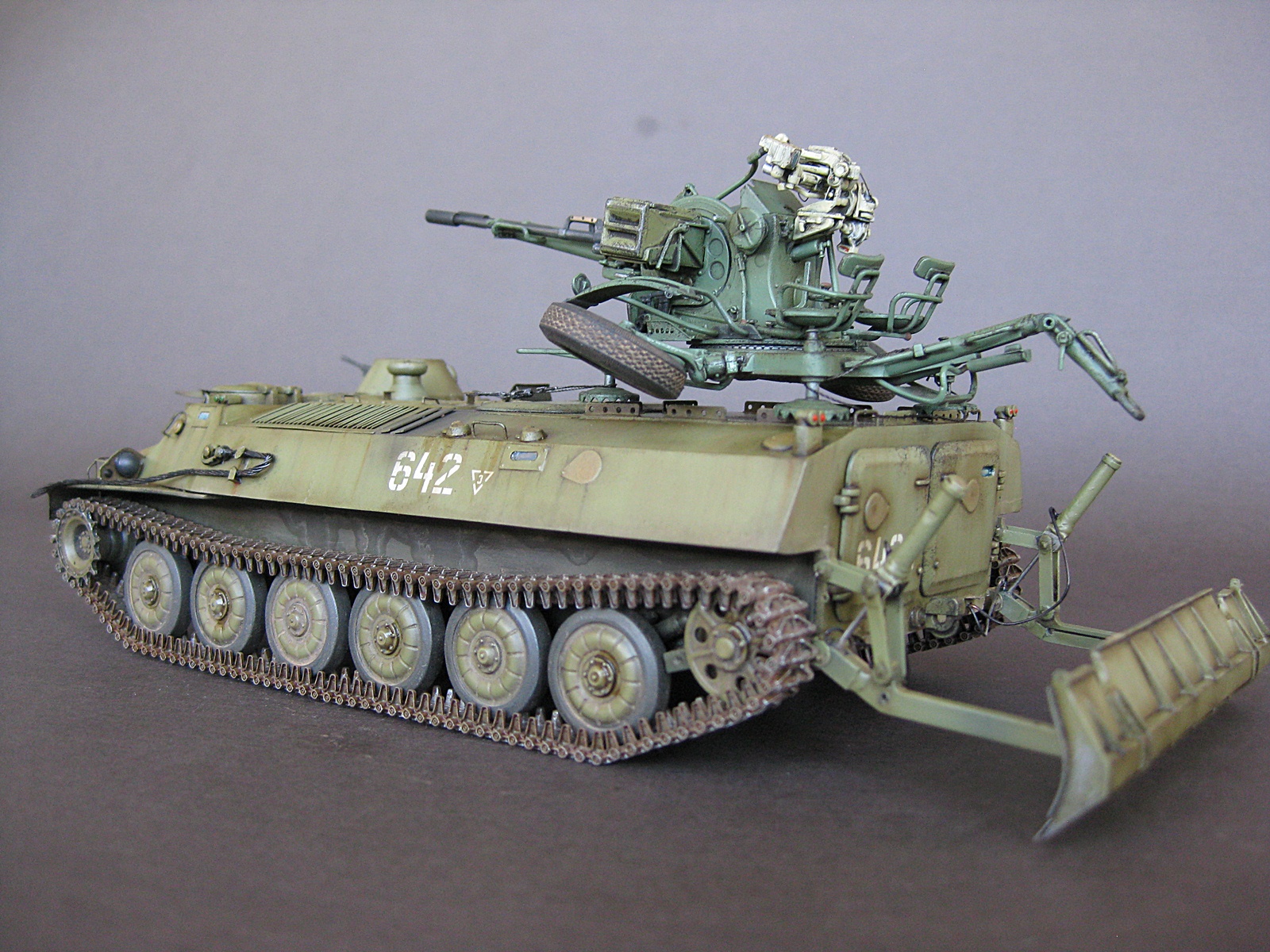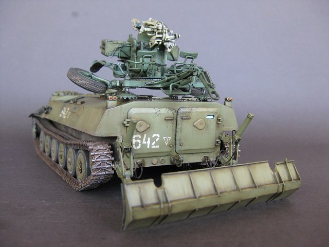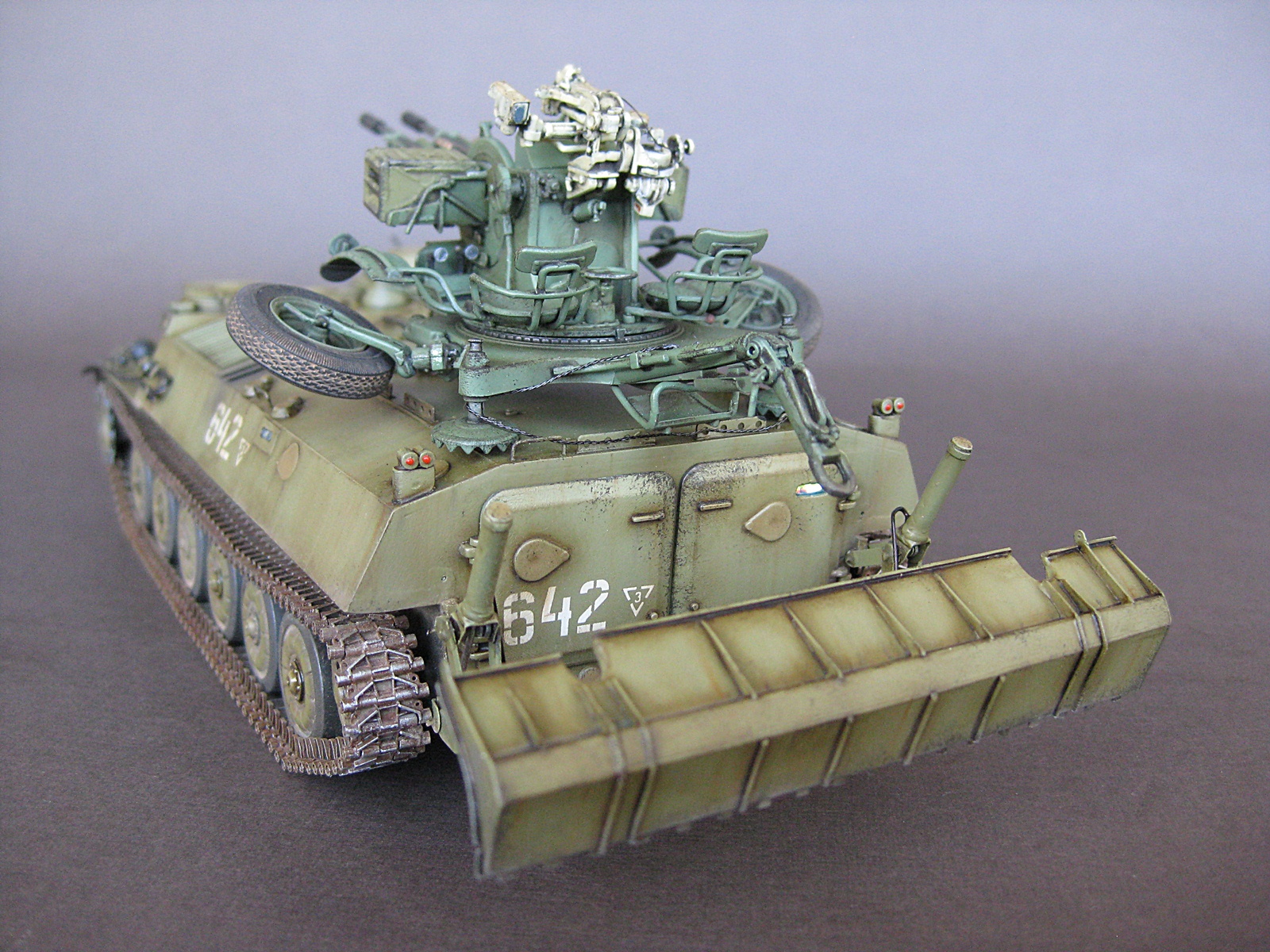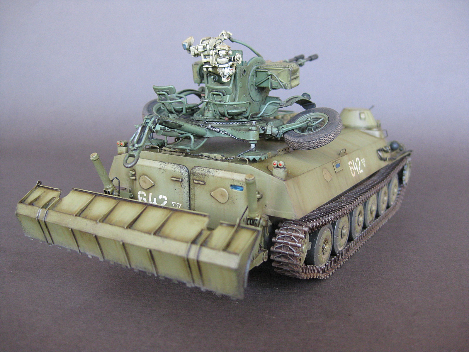 - Добрый вечер.Идея построить эту модель была давно.Главной особенностью молели является рабочее оборудование для самоокапывания.Производитель не дает поршней и несколько тяг которые пришлось изготвливать заново.Отвал нуждается в доработке.Траки из набора заменил на смоляные от Мастер клаб.Добавил травление от АСЕ.Зенитку закрепил тросами(хотя как она крепится на самом деле я не видел).