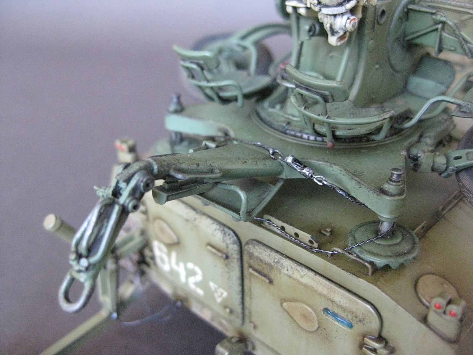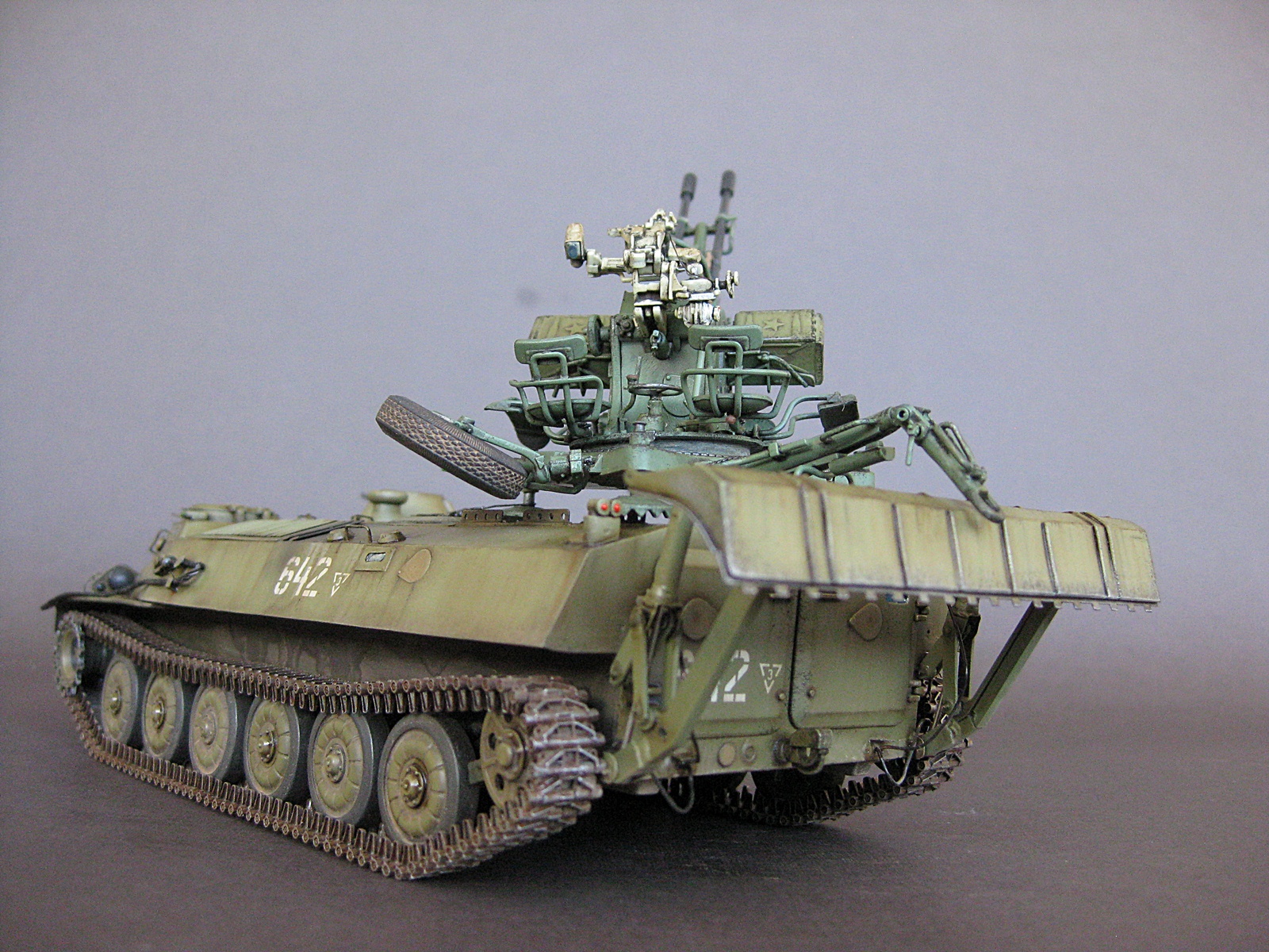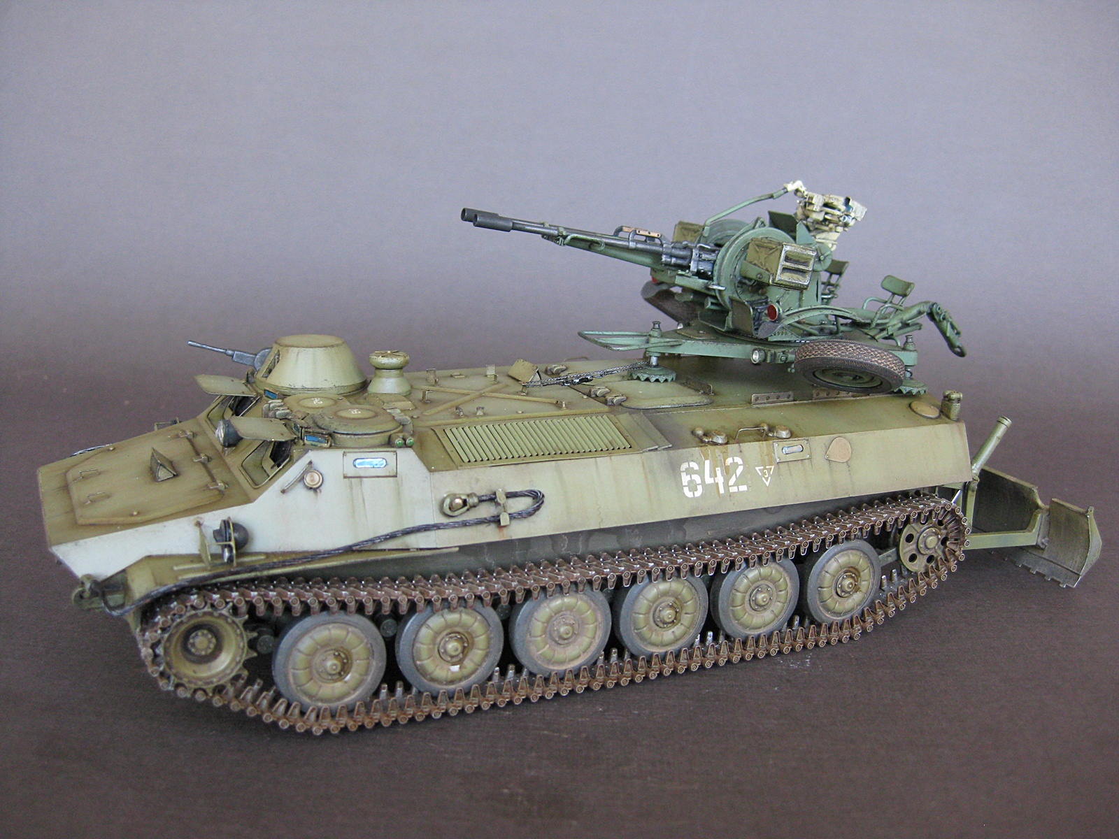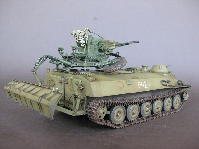- Добрый вечер.Идея построить эту модель была давно.Главной особенностью молели является рабочее оборудование для самоокапывания.Производитель не дает поршней и несколько тяг которые пришлось изготвливать заново.Отвал нуждается в доработке.Траки из набора заменил на смоляные от Мастер клаб.Добавил травление от АСЕ.Зенитку закрепил тросами(хотя как она крепится на самом деле я не видел).