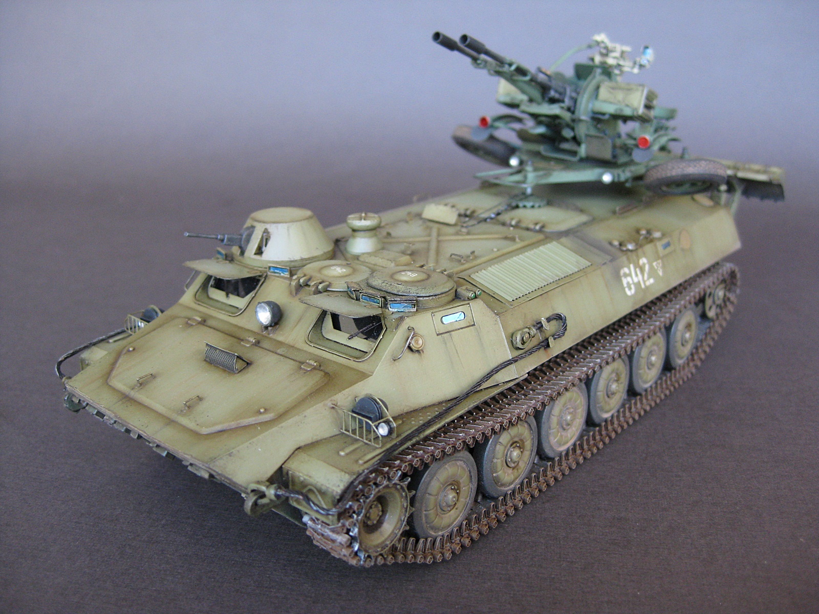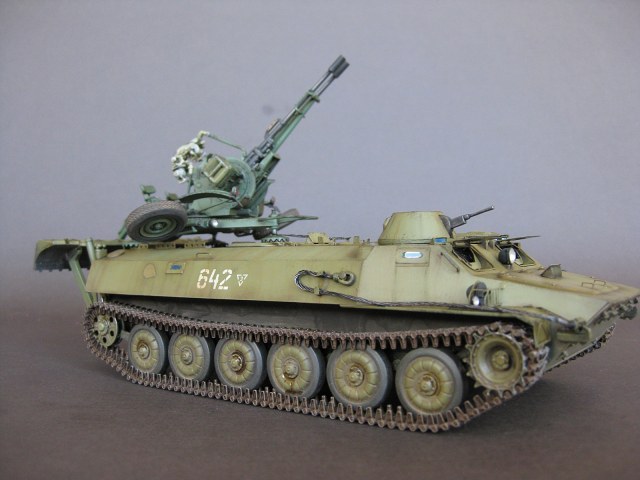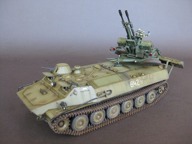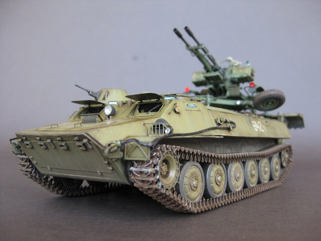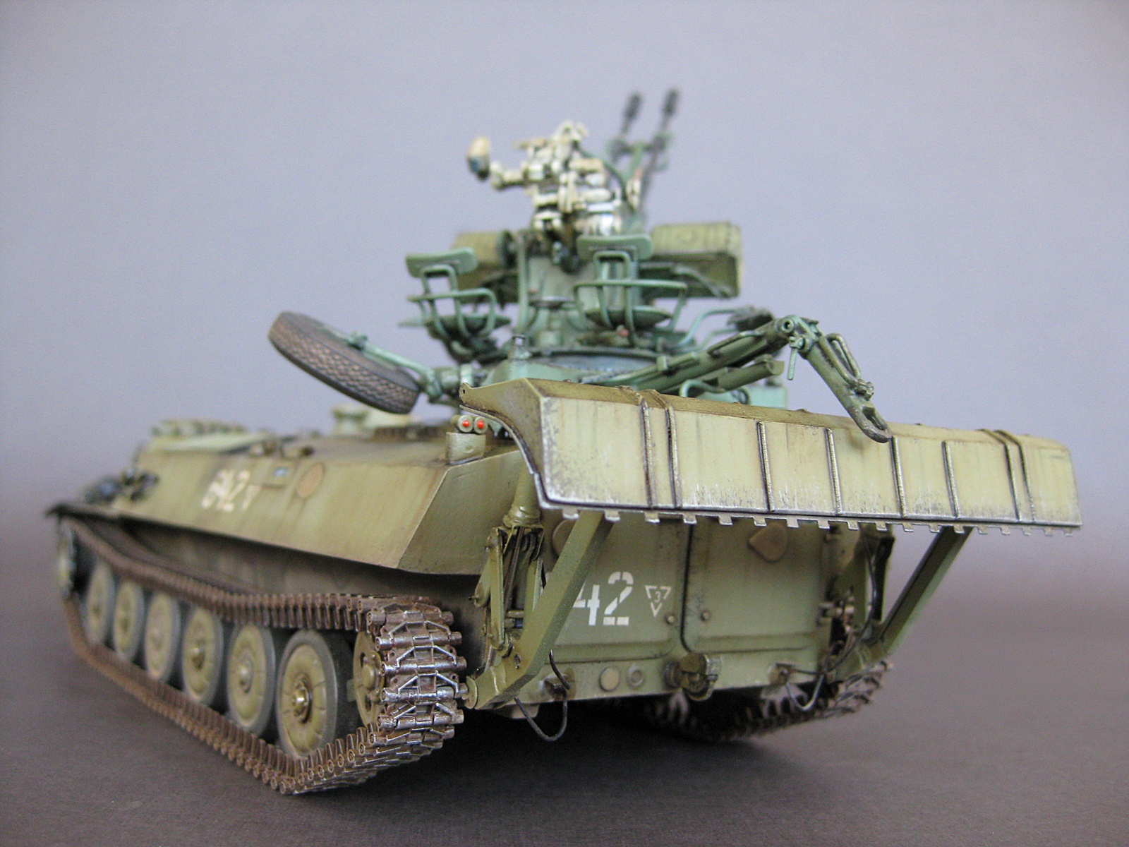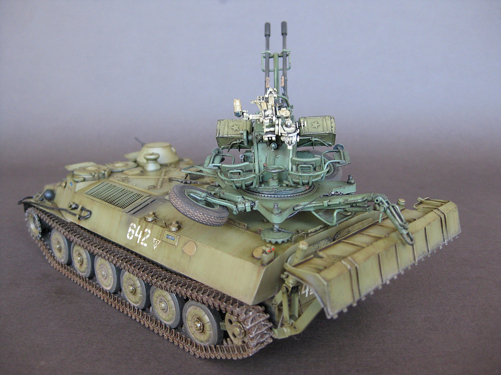 - Добрый вечер.Идея построить эту модель была давно.Главной особенностью молели является рабочее оборудование для самоокапывания.Производитель не дает поршней и несколько тяг которые пришлось изготвливать заново.Отвал нуждается в доработке.Траки из набора заменил на смоляные от Мастер клаб.Добавил травление от АСЕ.Зенитку закрепил тросами(хотя как она крепится на самом деле я не видел).