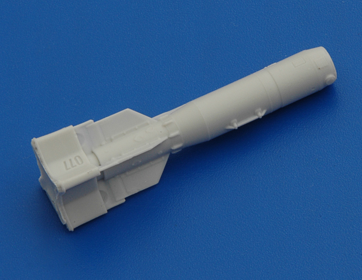 Комплект деталей позволяет собрать две авиабомбы. Детали отлиты из светло-серой полиуретановой смолы. Корпус бомбы, элементы подвески и перья стабилизаторов отлиты в одну деталь. Головная часть выполнена отдельно. Небольшая фототравленная пластина имитирует сопловую часть турбогенераторного источника электроснабжения. Все просто и достаточно технологично.