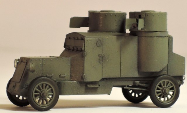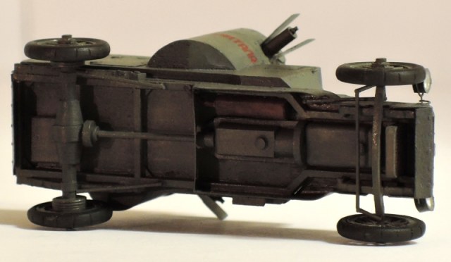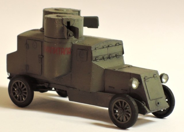 Исходный набор содержит отливки из смолы, плату фототравления и декаль на два варианта. Рама, мотор, рессоры, глушитель отлиты одной деталью. Передок рамы шире требуемого на 20%, что критично. Поэтому из неё были отделены детали мотора и глушителя. Рама изготовлена заново из листового пластика, листы бронировки из бумаги с циакрином, наклеена клёпка ф0,3мм из скотча. Изготовлен заново передний мост с тягами. Рессоры и радиатор заимствованы и доработаны от грузовиков ЗИС Зебрано. Дополнена, отсутствовавшая клёпка на башнях. Фары: рассверлена смоляная деталь из набора, закрыта прозрачным пластиком. Окраска замешанным на глаз Аканом.