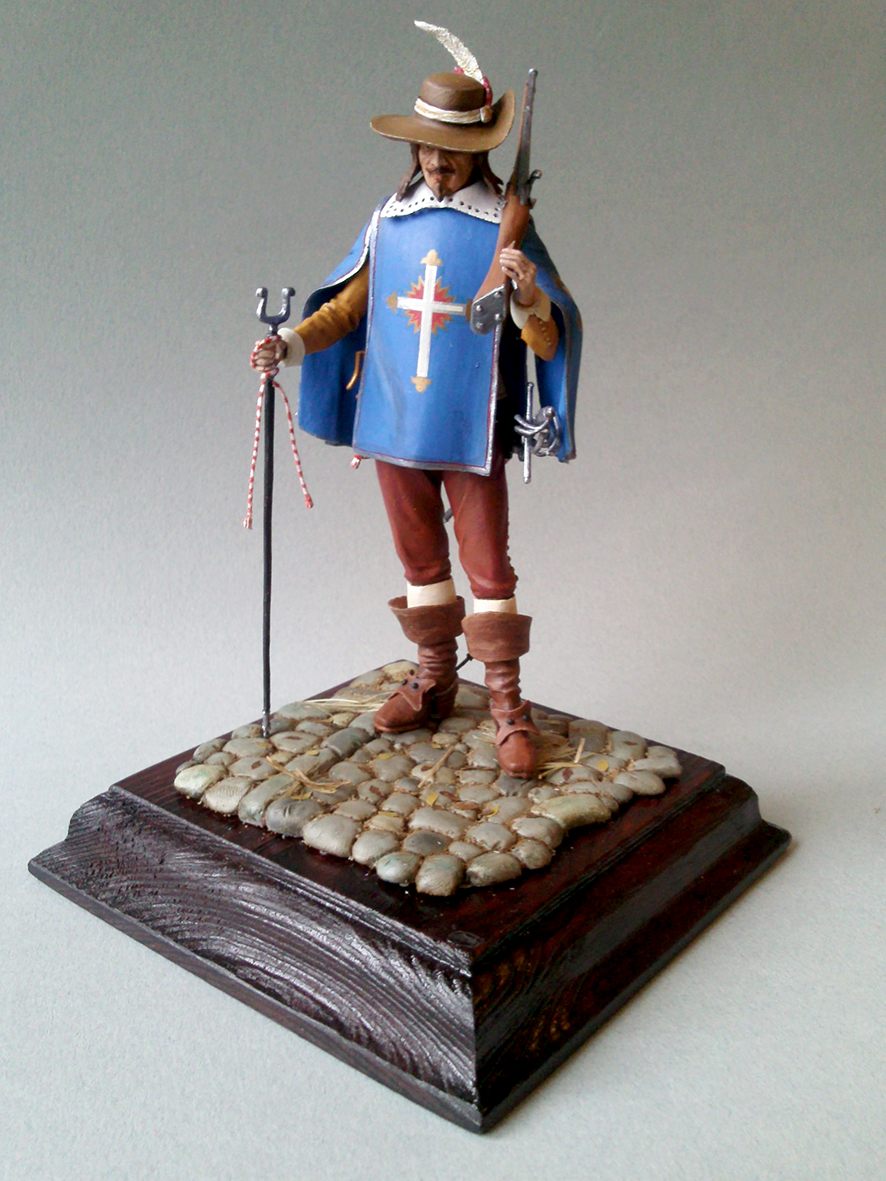 Мушкетёр поразил своей вычурной красотой. В силу причин- мне не пришлось детально прокрашивать "китель" (всё скрыл плащ), и вешать кинжал. Но даже того что есть- всё вполне смотрибельно.