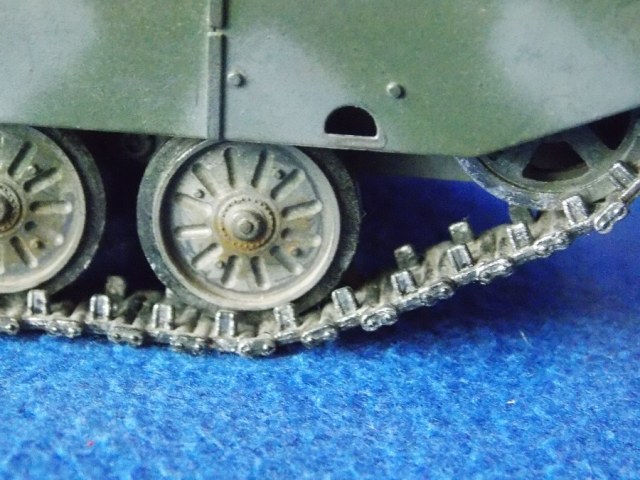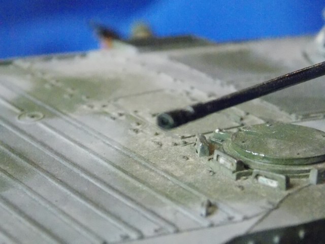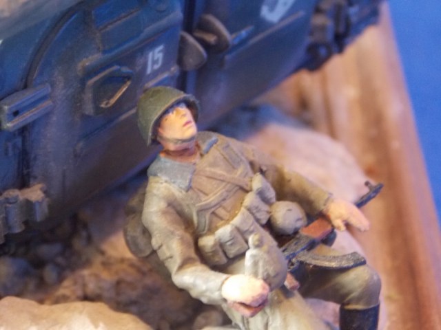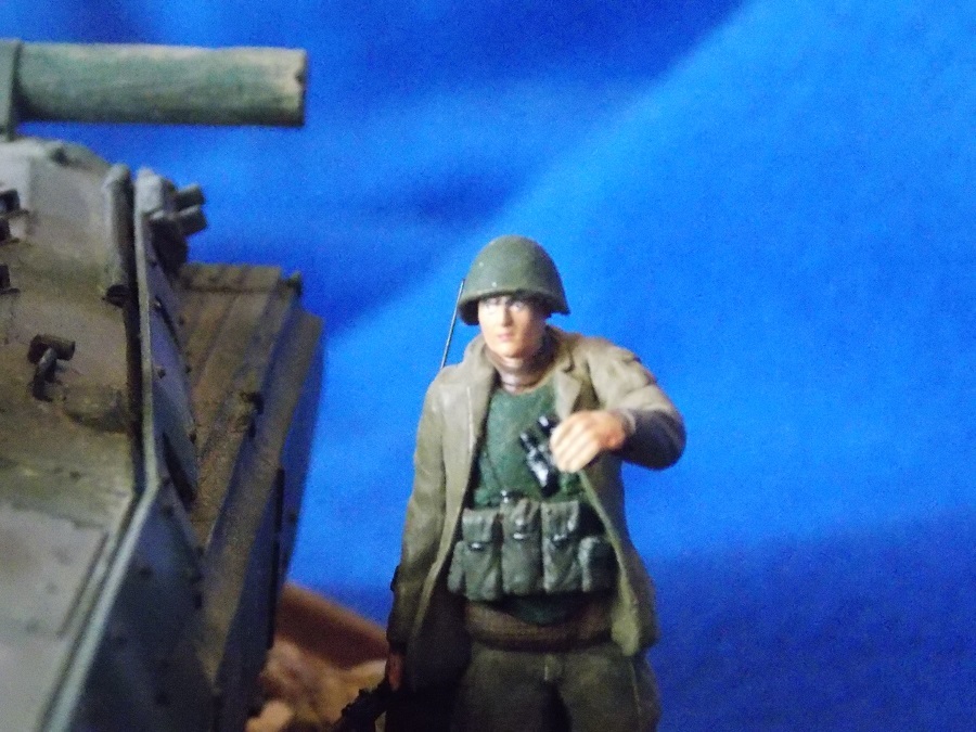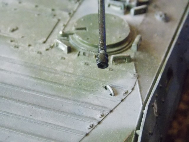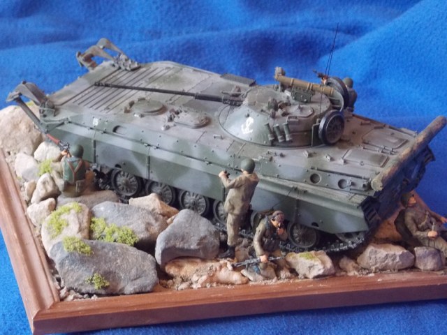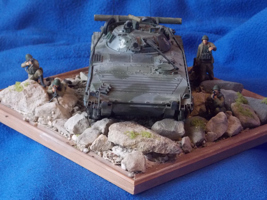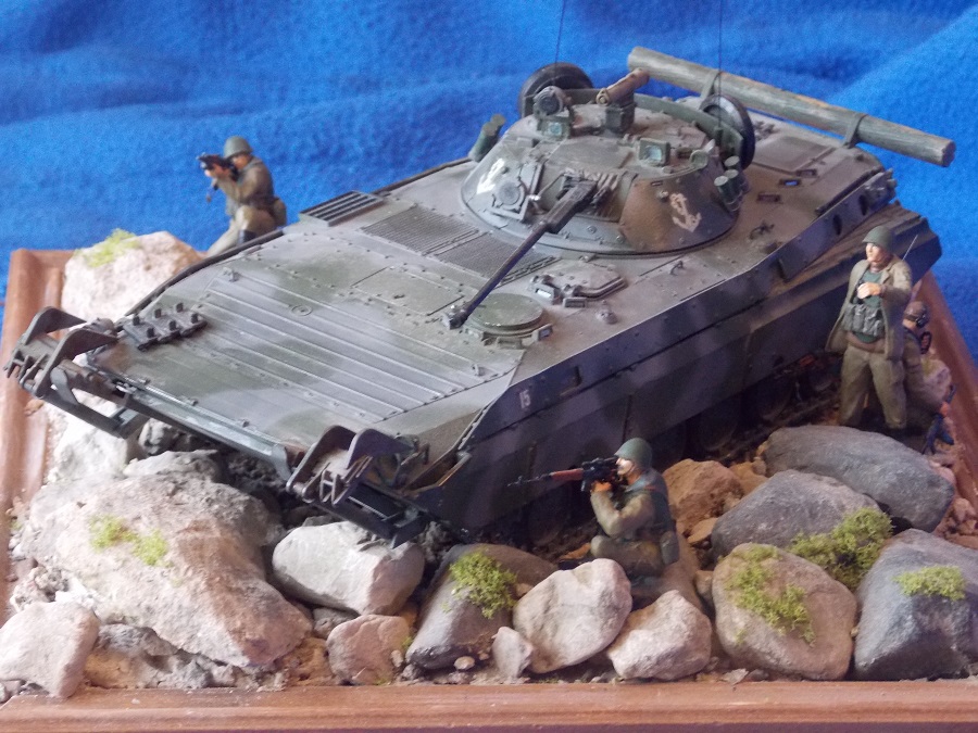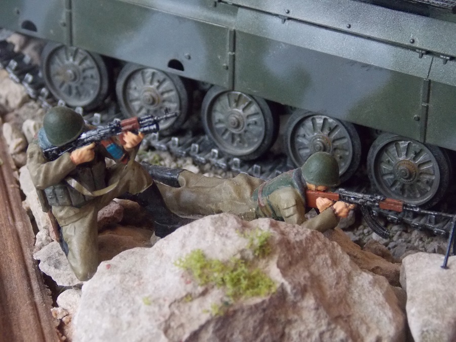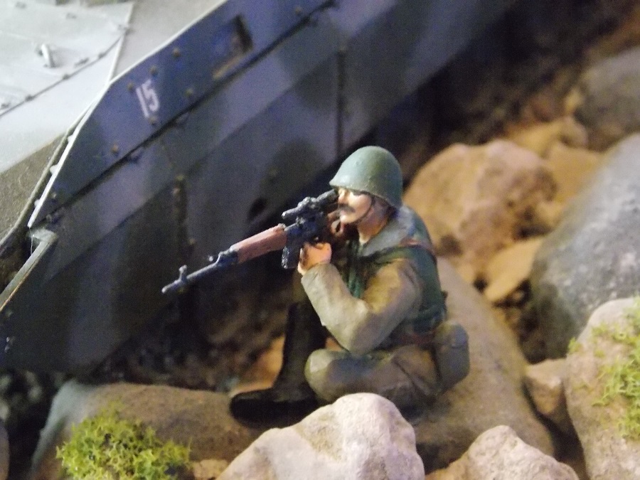 Может, Ногу свело? Есть такой косяк, Михаил. У этой диорамы был долгий путь, часть камешков в процессе перестановок с места на место отклеилась. Надо будет их подклеить. Пылюка, кстати, по бортам БМП подобтерлась по этой же причине.