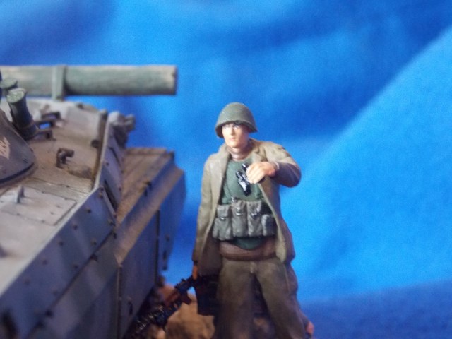 Ну что ж, Глеб, давайте по порядку. БМП совсем необязательно было заезжать со стороны "обкуренного" солдата через здоровый валун. Она могла заехать со стороны автоматчика и пулеметчика, а затем развернуться на месте. У гусеничной техники есть такое свойство - разворот на месте. Что там курил боец - это может только медэкспертиза установить, а я ставил себе задачу показать уставшего от тряски по горной дороге парня, пьющего воду из фляги. Гусеница может висеть в воздухе, потому что трак может опираться на камень с внутренней стороны. Здесь не песок или земля, а камни. Полного прилегания, как на мягком грунте, быть не может. "Командир дал указание снайперу осмотреть окрестности в прицел" - что здесь не так? Сам командир осматривает всю местность в бинокль, а снайпер, как наиболее подкованный солдат по возможным "душманским" нычкам, целенаправлено осматривает вероятные места залегания вражеских стрелков - кустарник, груды камней. Камуфляж и декали были взяты из инструкции звезды ( а там он только с одной стороны машины показан), причем, вид с другого борта делался по аналогии, за неимением реального фото. По поводу неточности маркировки бмп - это скорее собирательный тематический образ, чем какая то конкретная машина. В описании композиции, если вы обратили внимание, я никаких конкретных ссылок на какой то номер части не делаю. Афганистан, 80-е - вот и вся привязка. Не являюсь глубоко сведующим человеком в истории афганской компании, глубоко матчасть не копал. По росписи фигурок согласен с вашей оценкой. Это от недостатка опыта. более-менее прорисованных солдатиков ( с глазами, губами и т.д.) в моей практике всего то штук 10 - 12. Про ПТУР я уже написал в предисловии к композиции, он оставлен из эстетических соображений. Так же принимаю критику по слишком новому виду БМП. Борта были гораздо сильнее запылены, но из за частых перестановок пыль подобтерлась... Восстановлю запыленность и приложу фото. Спасибо за внимание к моей диораме!