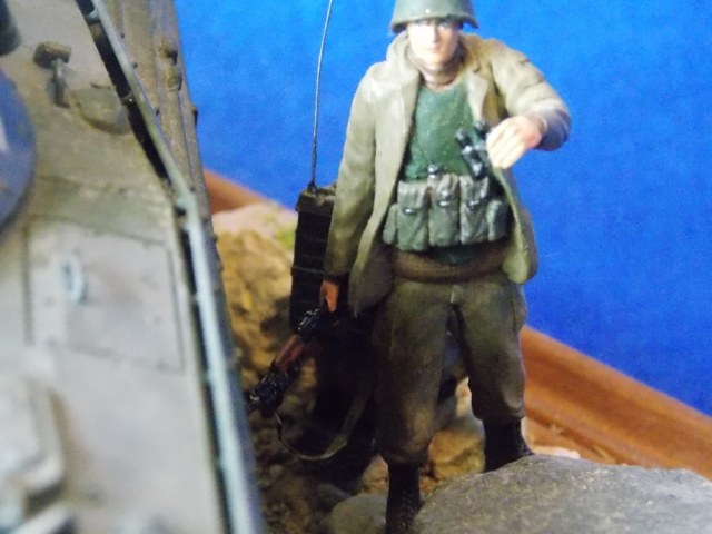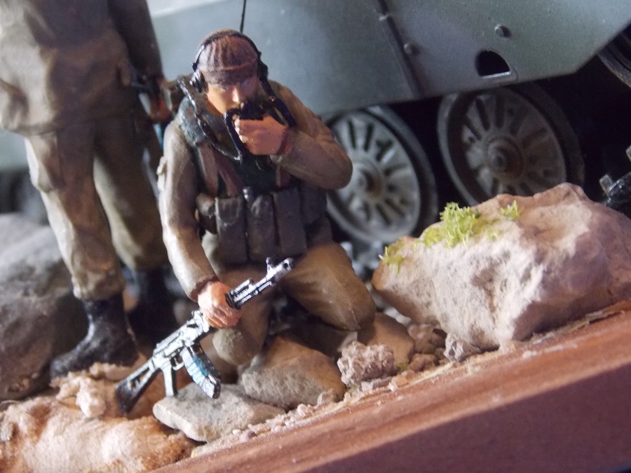 Представляю вашему вниманию диораму на афганскую тему. Краткое описание сюжета: БМП с мотострелками производит осмотр местности. Боя еще нет, но командиру что – то показалось подозрительным и он дал указание стрелкам залечь, а снайперу осмотреть окрестности в прицел. Радист связывается со штабом. Выйти на связь из БМП не получилось, поэтому он задействовал свою переносную радиостанцию.