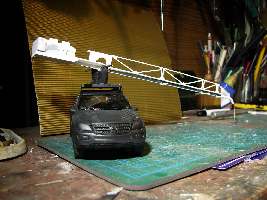 Мачта сделана из разных профилей и проволоки.Из-за неправильного решения применить проволоку,стрела,после натягивания проволоки,лишилась подвижности.((В добавок,пролитая капля супер клея,склеила вращающуюся станину-намертво.(С другой стороны-никто ее крутить не будет.)