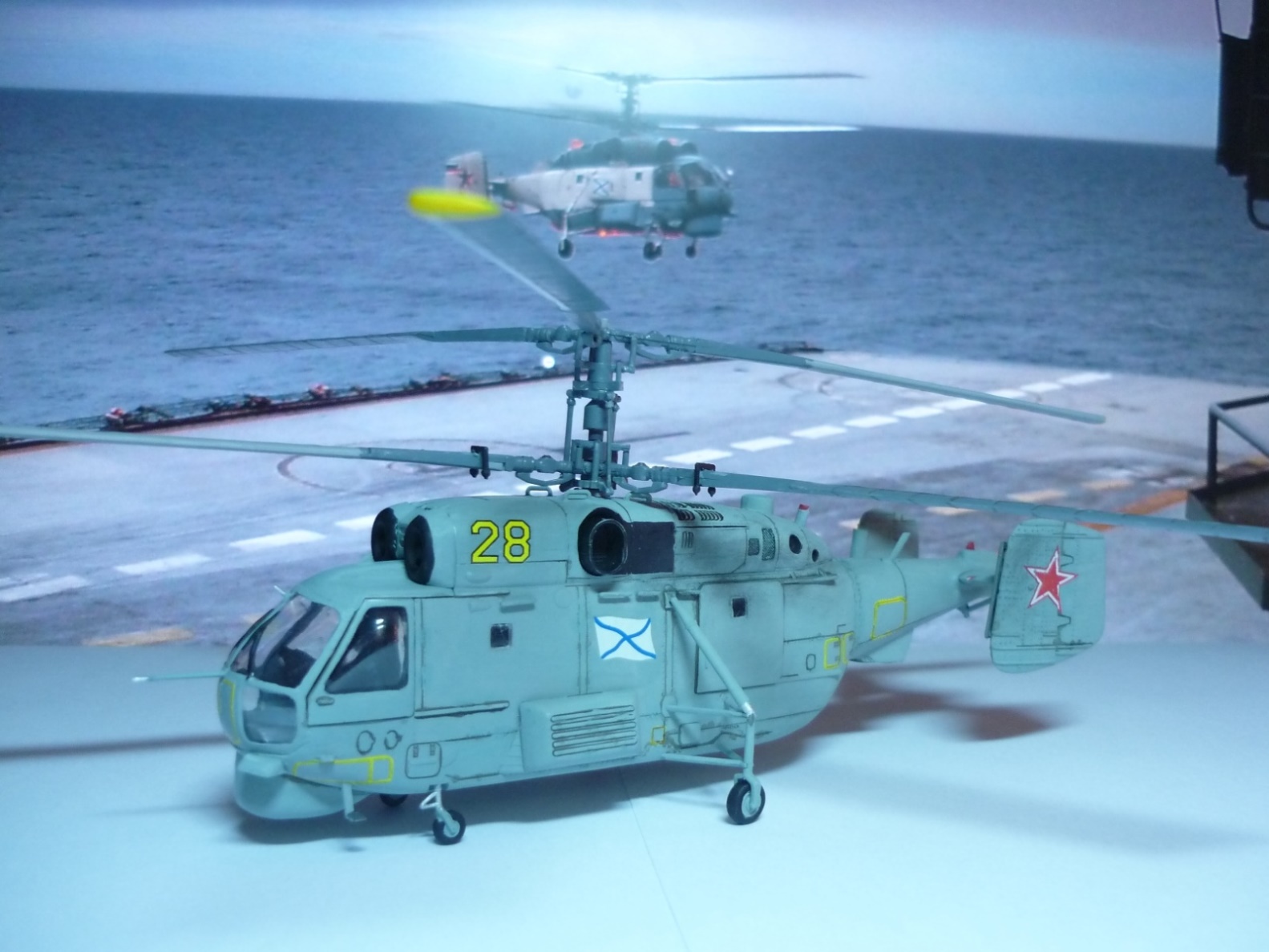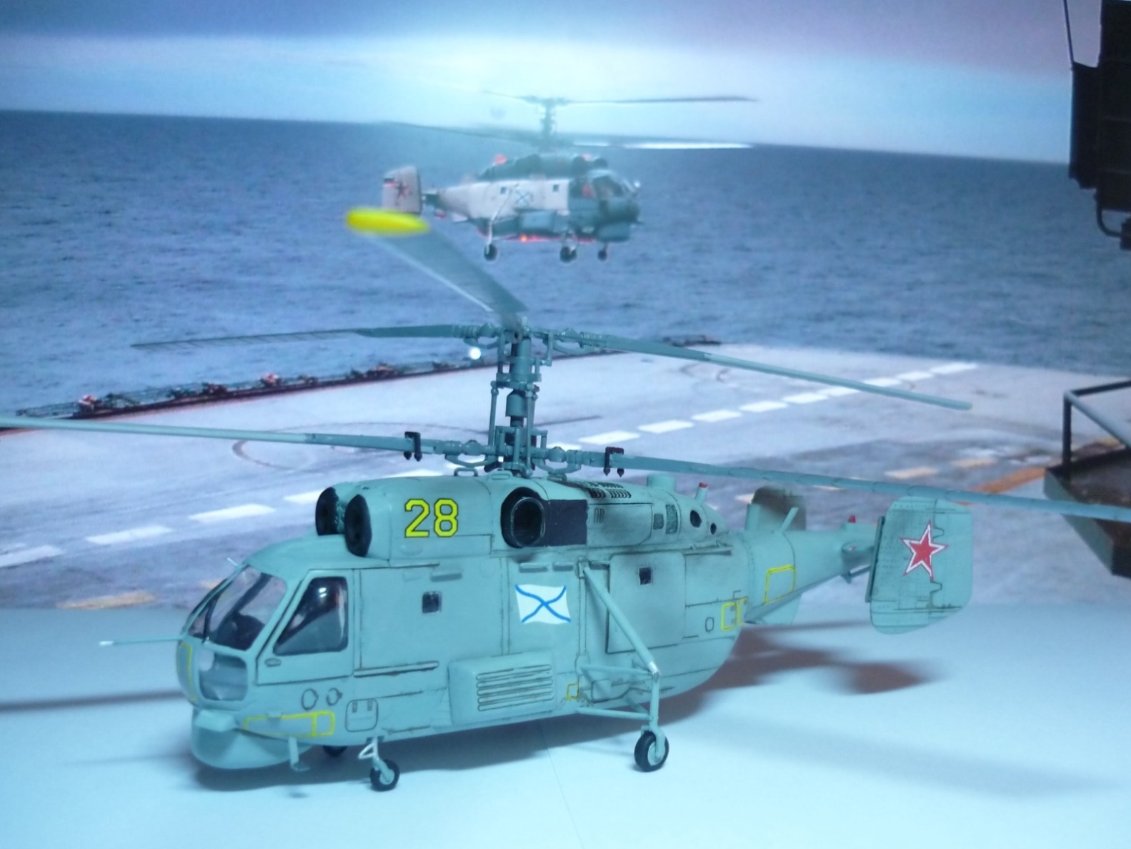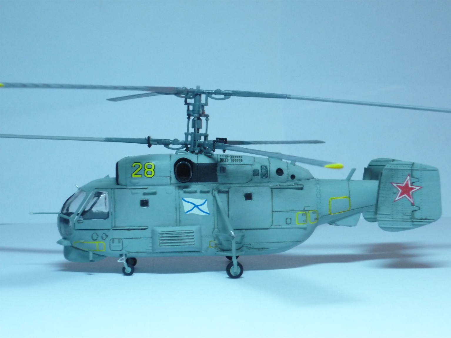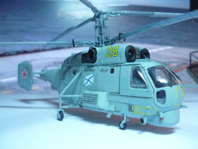 С фоном хороший ход, а вот по модели ошибки стандартные: противофлаттерные грузы на лопастях не на своем месте, по правому борту заднее окно не заделано (эти ошибки озвучены на каропке наверное в каждой второй модели), звезды на "шайбах" наклеены криво, насчет толщины поручней у многих вопросы возникают. Потратьте время на изучение на сайте комментариев к чужим подобным собранным моделям, многих ошибок сумеете избежать. С фотографиями и описанием пожадничали, и в синеву фото сильно ушли. Ну а покрашено и собрано неплохо, плоской модель не смотрится.