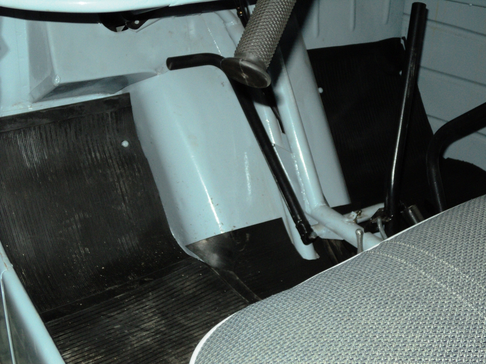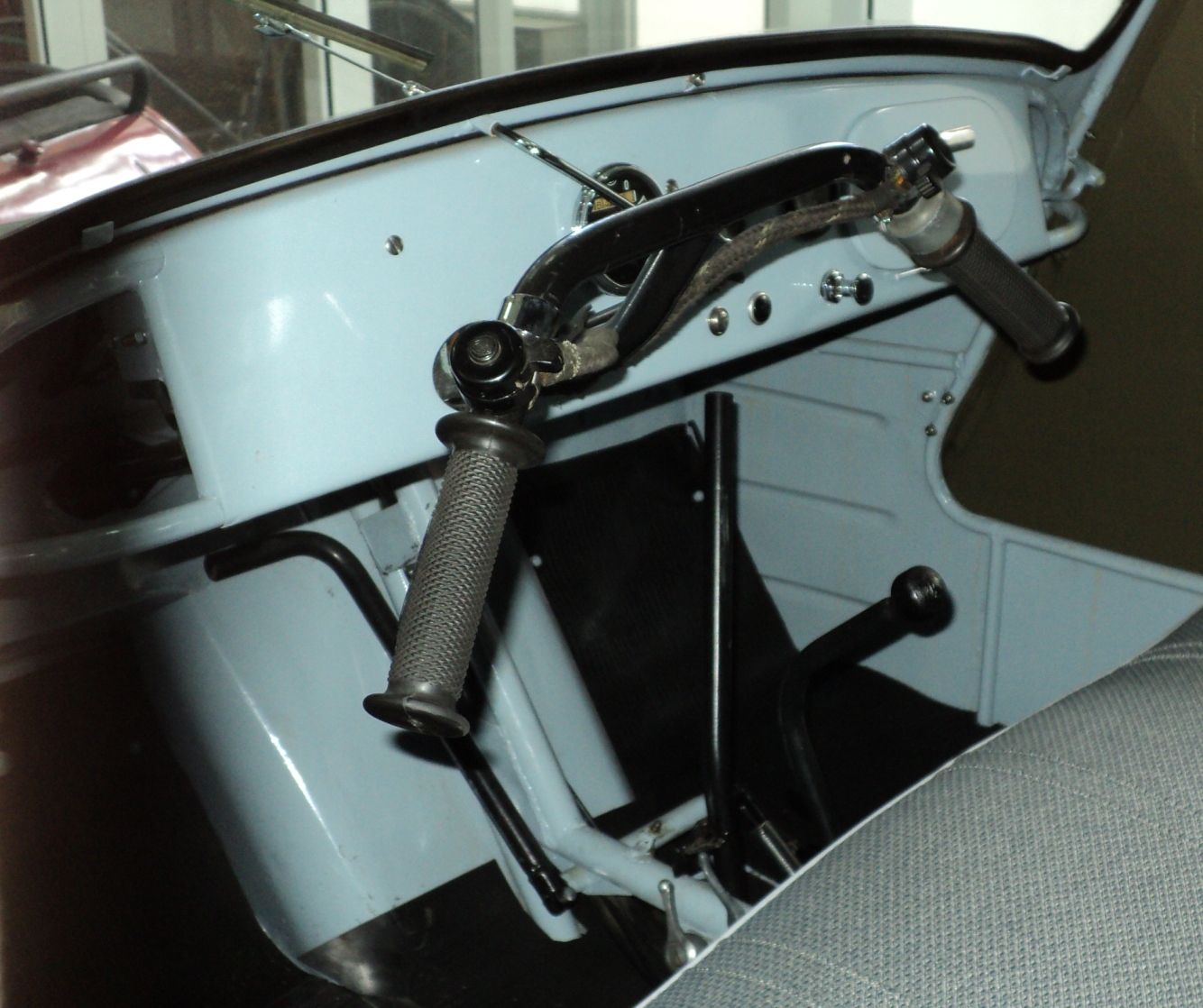 Как видно на фото, вместо привычного автомобильного руля на СМЗ стоял руль от мотороллера, причём выпускались модификации, позволяющие управлять ею исключительно руками, либо одной левой рукой (СМЗ С-1ОЛ), либо одной правой (СМЗ С-1ЛО).