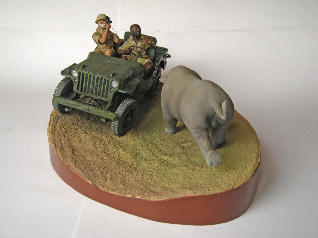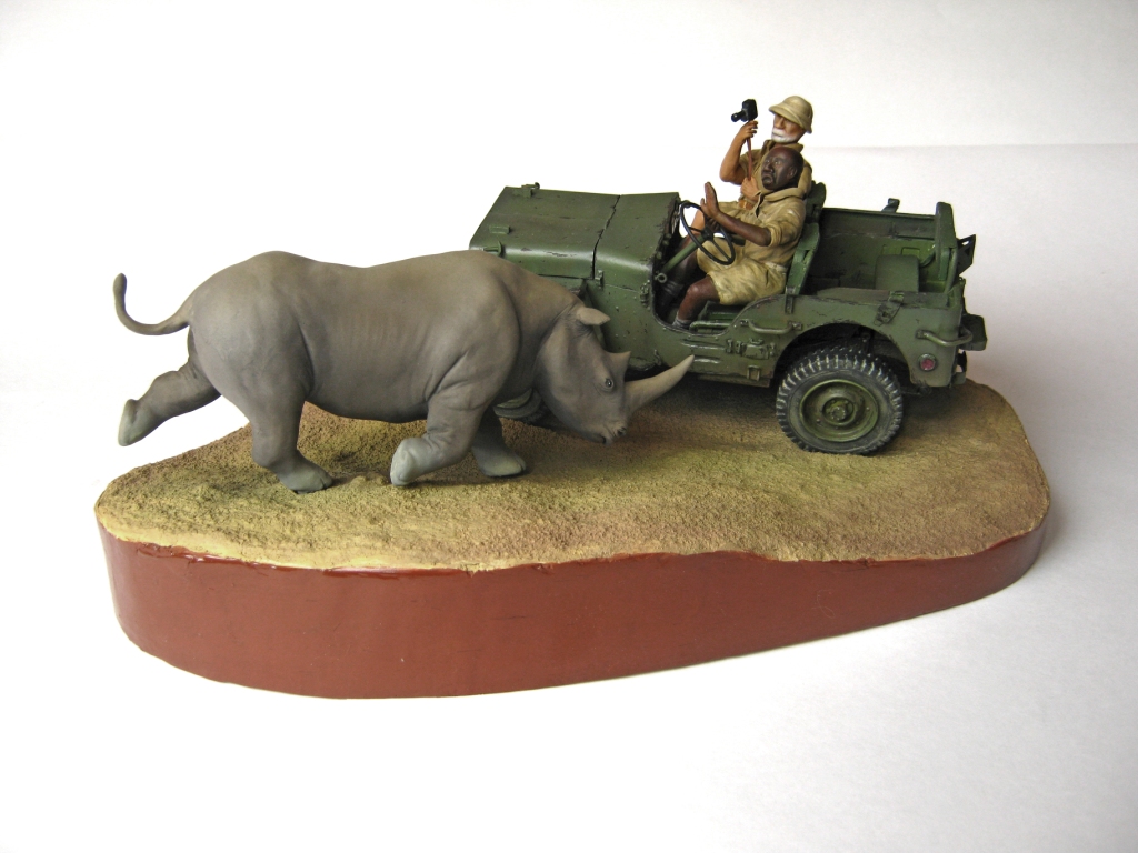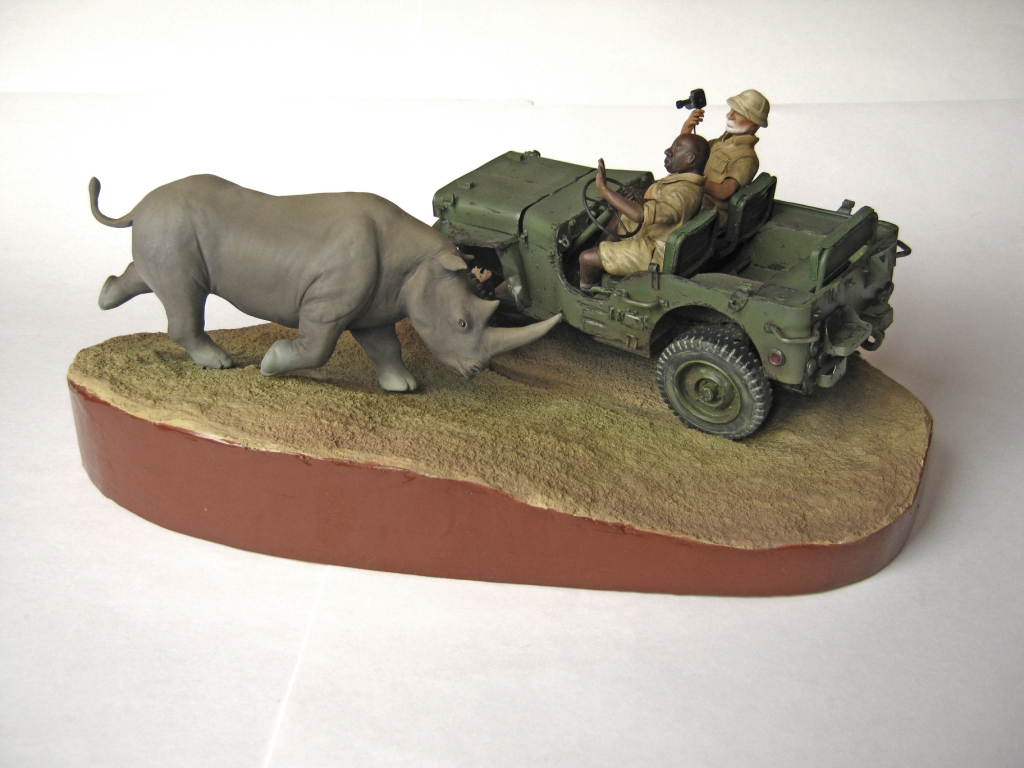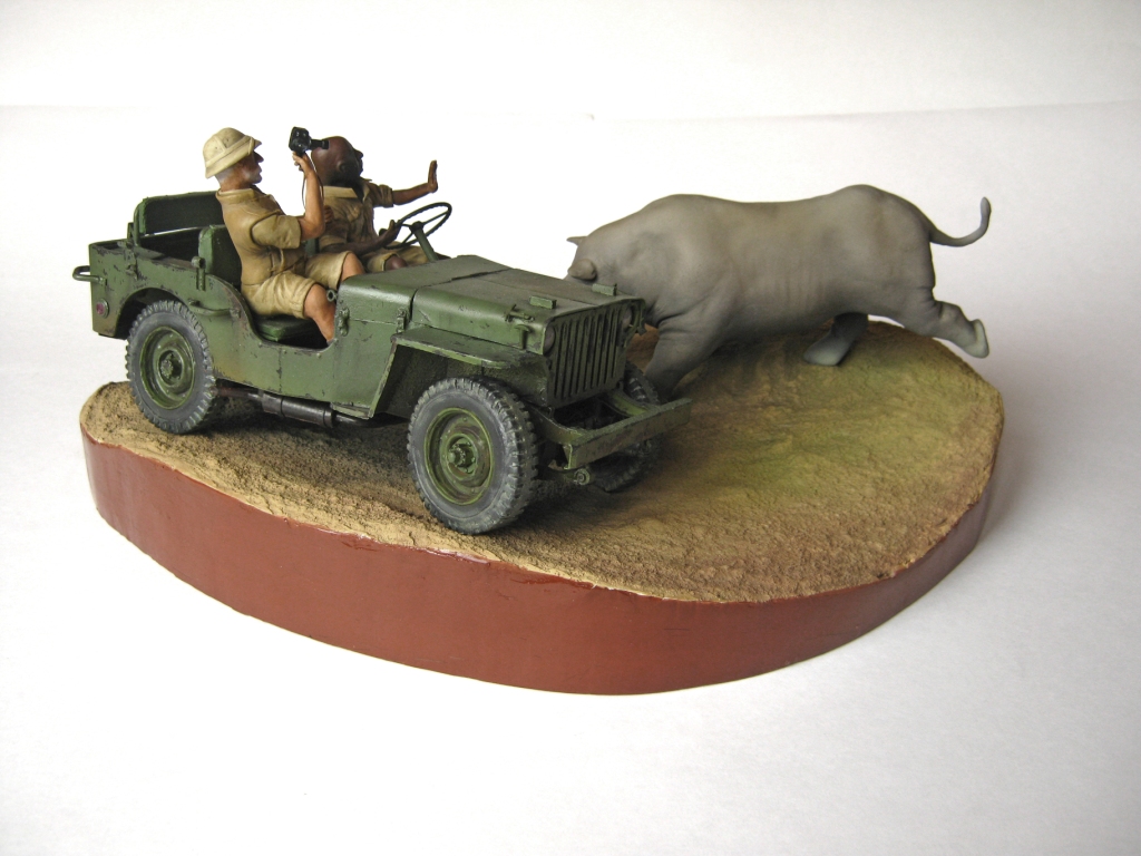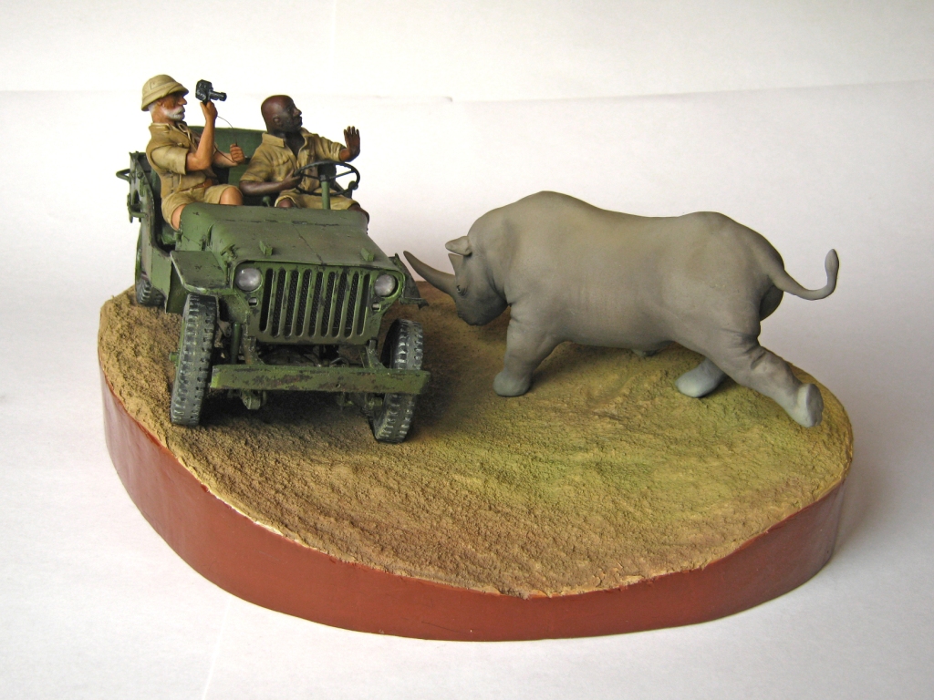 Обалденно! Объем работы впечатляет! Повидавший виды джип- ПОЛУЧИЛСЯ! Класс! Сюжет-мощь! Носорог классно получился- хотел бы я так ваять)))))))!!!!! Только маленький он- 2-2,5 метров в холке должен быть.