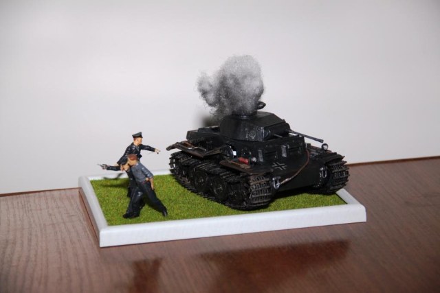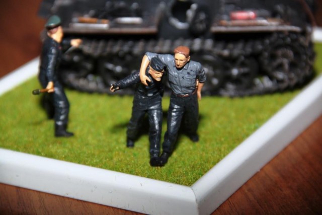 У меня тоже первой мыслью, ещё до прочтения комментариев, было "Да не доставайся же ты никому". Но разве не логичнее было бы бросить гранату в открытый люк? Вообще, производит впечатление серьёзной немецкой пьянки. Фриц с пистолетом, походу, поет... Всё-таки больше внимания нужно уделять сюжету. Успехов.