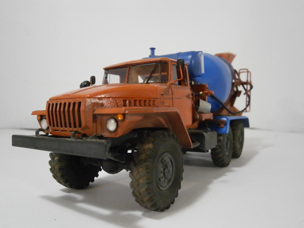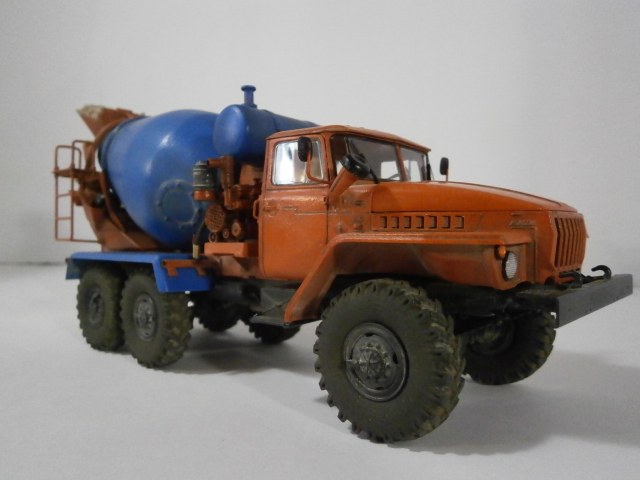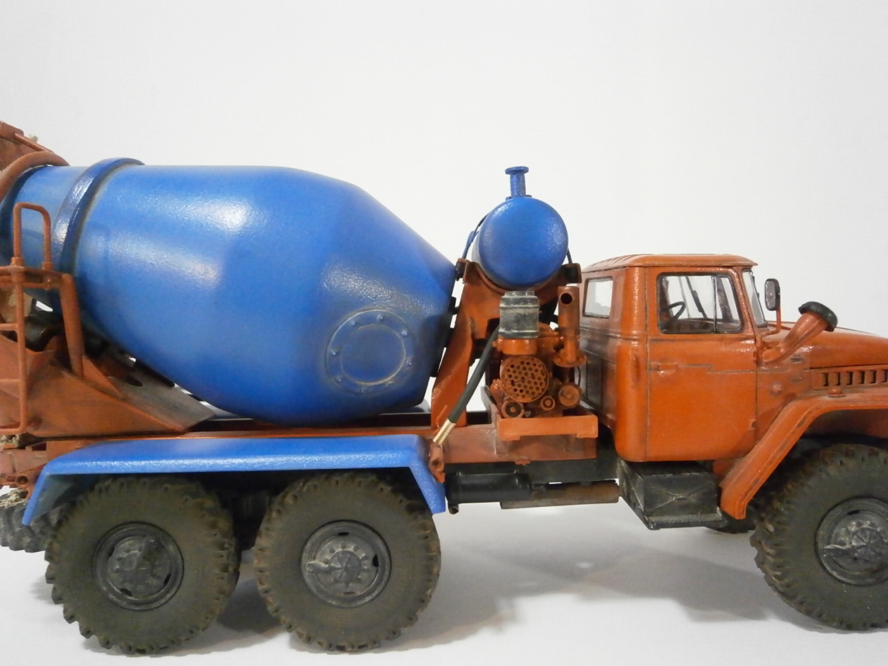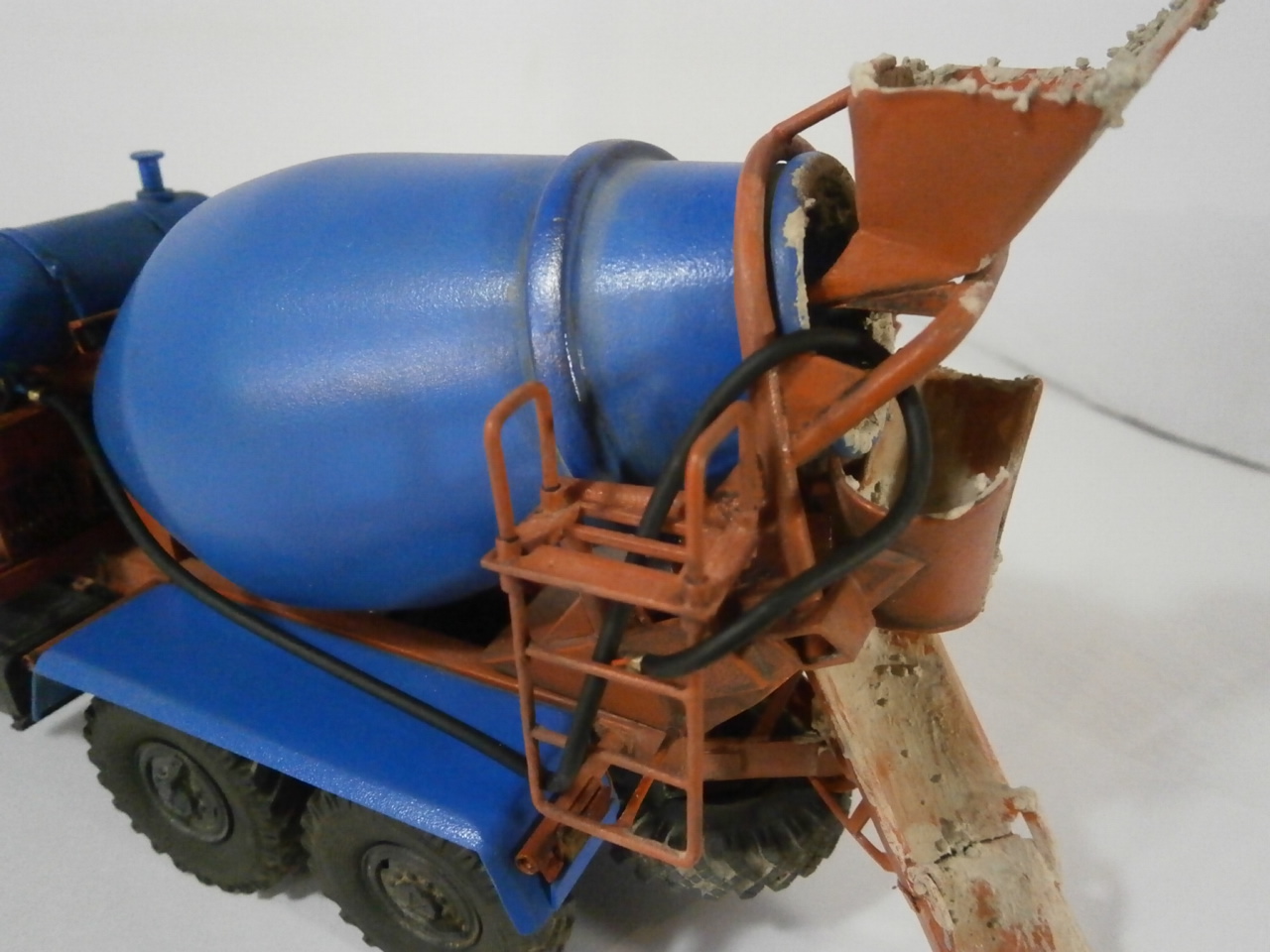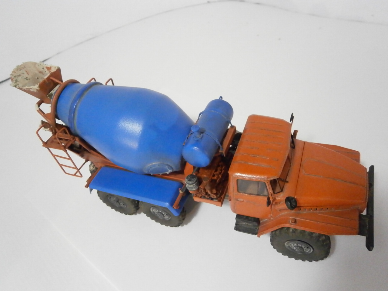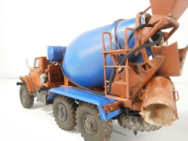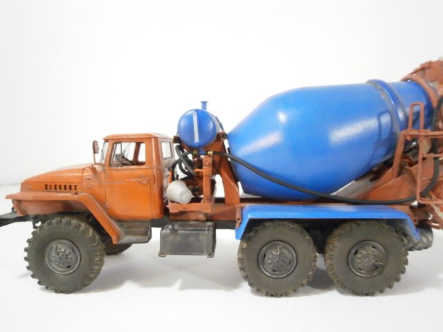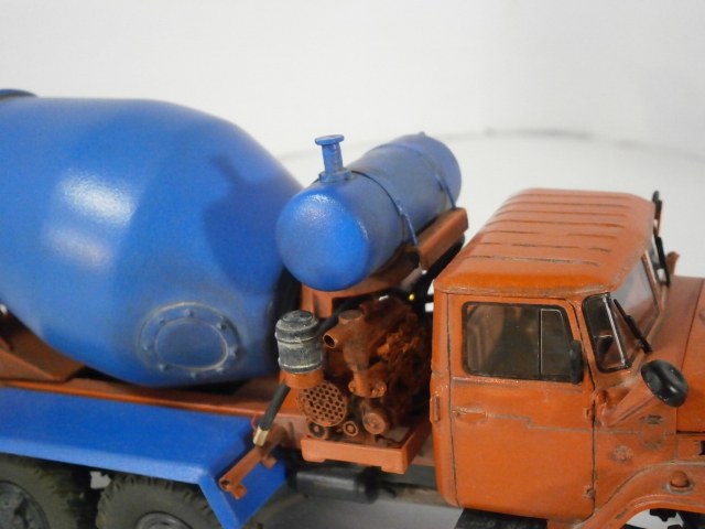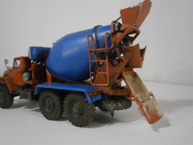 Товарищи и господа моделисты, доброе утро! Я не оставляю неуклюжих попыток "реанимировать" свои ранние "модели"... "КРОТом" снял краску и понеслось! Грузовик изкоробка, доработка лишь одна, но большая, это "миксер". Многие найдут массу недоделок, недочётов и т. д. и будут правы. Модель не привязана к конкретному автомобилю, лепил "от балды". Будем считать, что импортный "миксер" поставили на Урал. Использовал пластик 3мм. и всё тот же бытовой хлам. Смеситель и жёлоб подвижны. Грунтовка и шпаклёвка автомобильные, обычная аэрозольная краска. Химия:- Валехо, MIG, Zip market. Смотрите, обсуждайте, критикуйте!