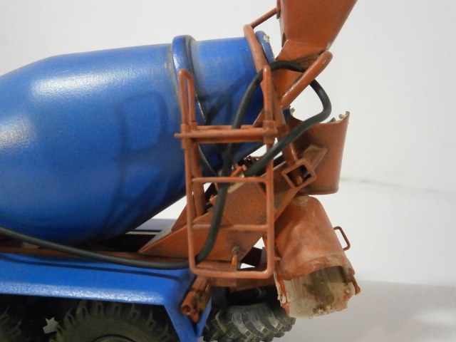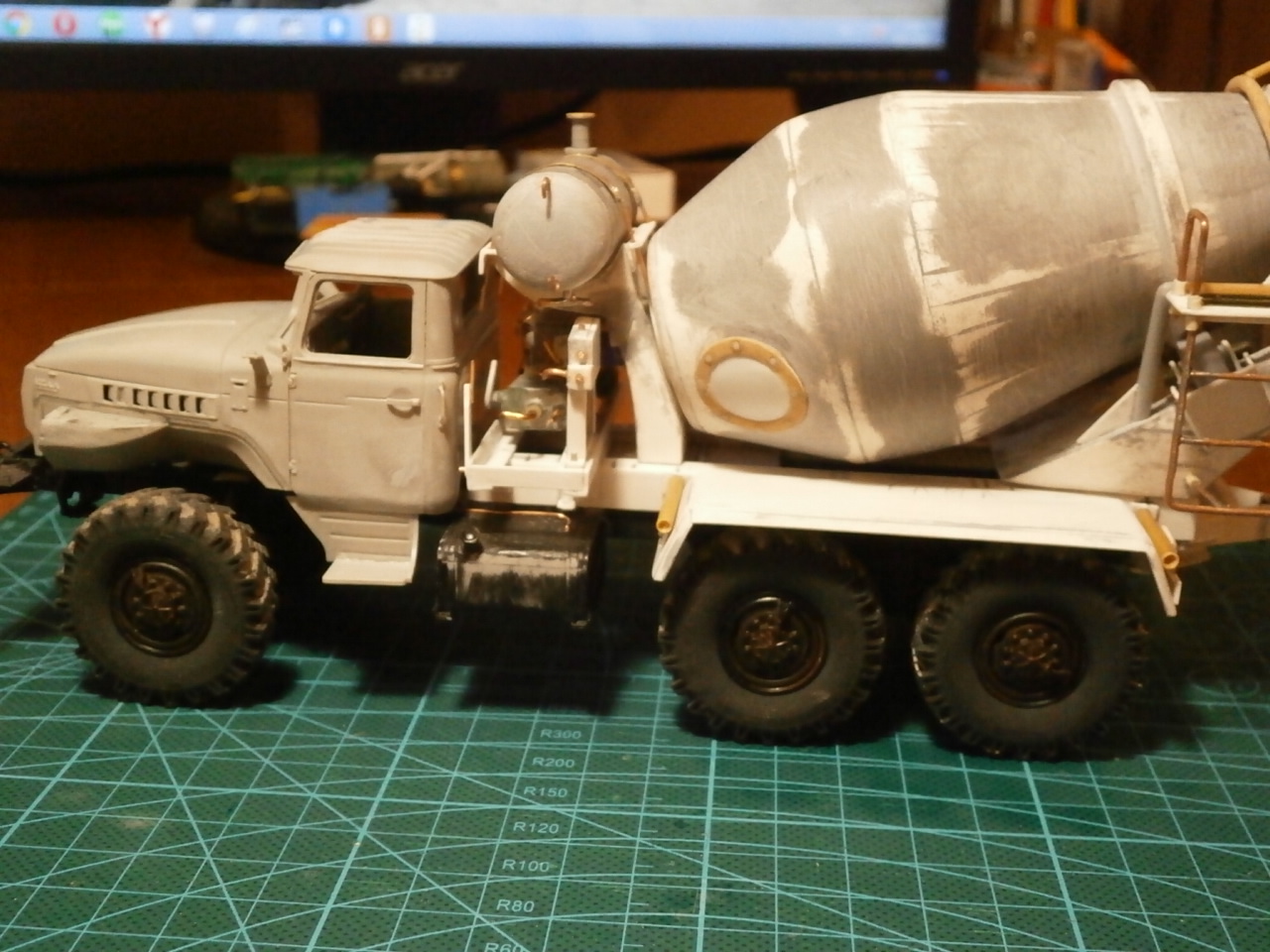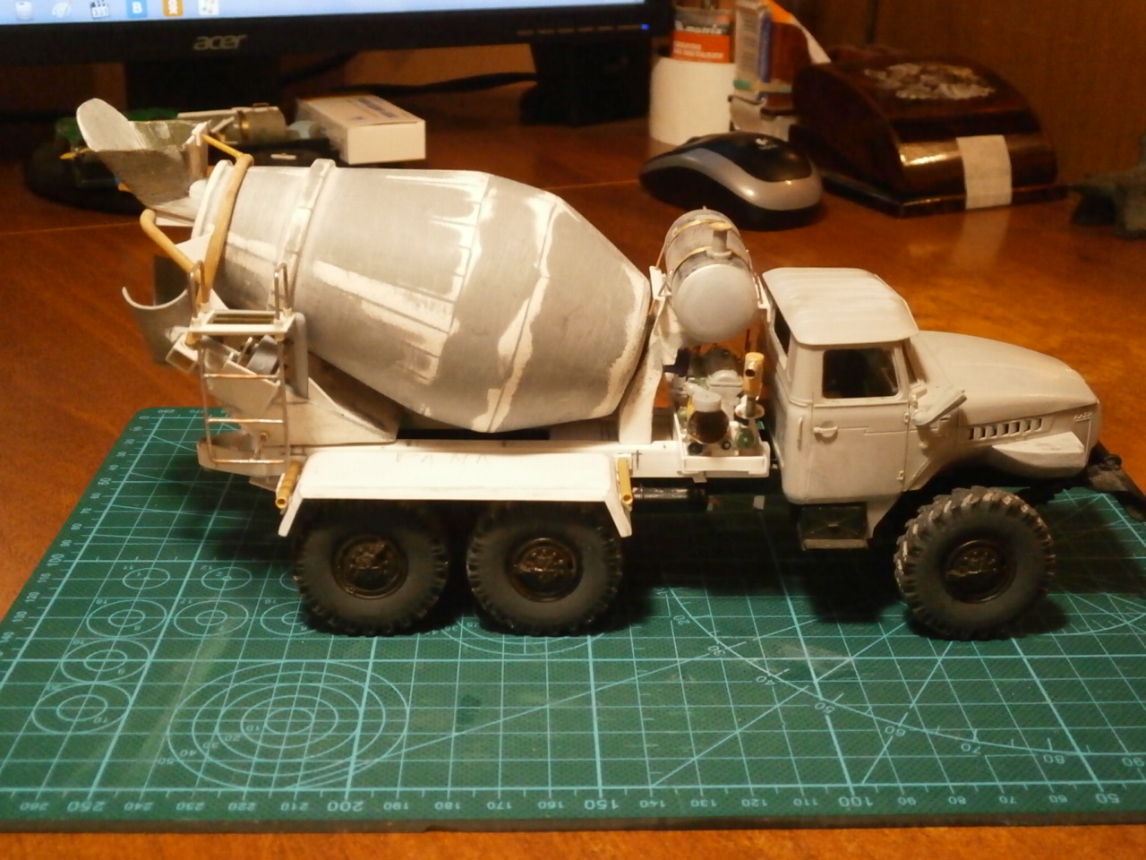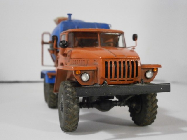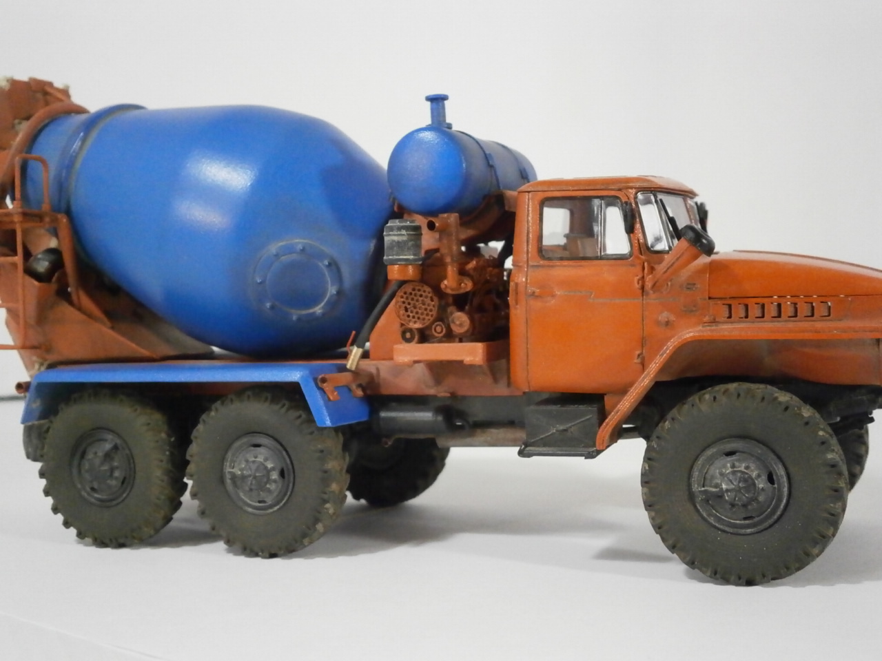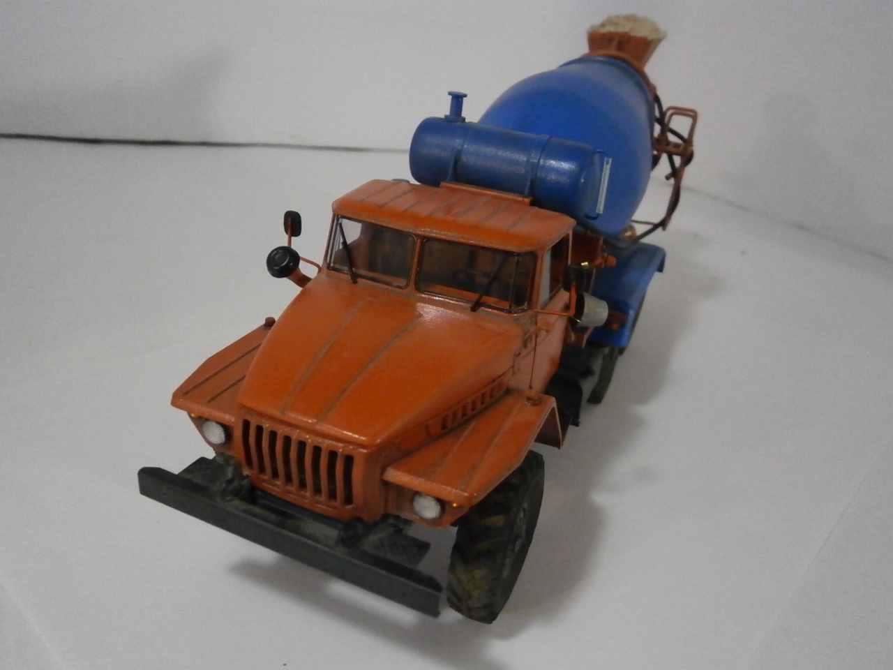 Товарищи и господа моделисты, доброе утро! Я не оставляю неуклюжих попыток "реанимировать" свои ранние "модели"... "КРОТом" снял краску и понеслось! Грузовик изкоробка, доработка лишь одна, но большая, это "миксер". Многие найдут массу недоделок, недочётов и т. д. и будут правы. Модель не привязана к конкретному автомобилю, лепил "от балды". Будем считать, что импортный "миксер" поставили на Урал. Использовал пластик 3мм. и всё тот же бытовой хлам. Смеситель и жёлоб подвижны. Грунтовка и шпаклёвка автомобильные, обычная аэрозольная краска. Химия:- Валехо, MIG, Zip market. Смотрите, обсуждайте, критикуйте!