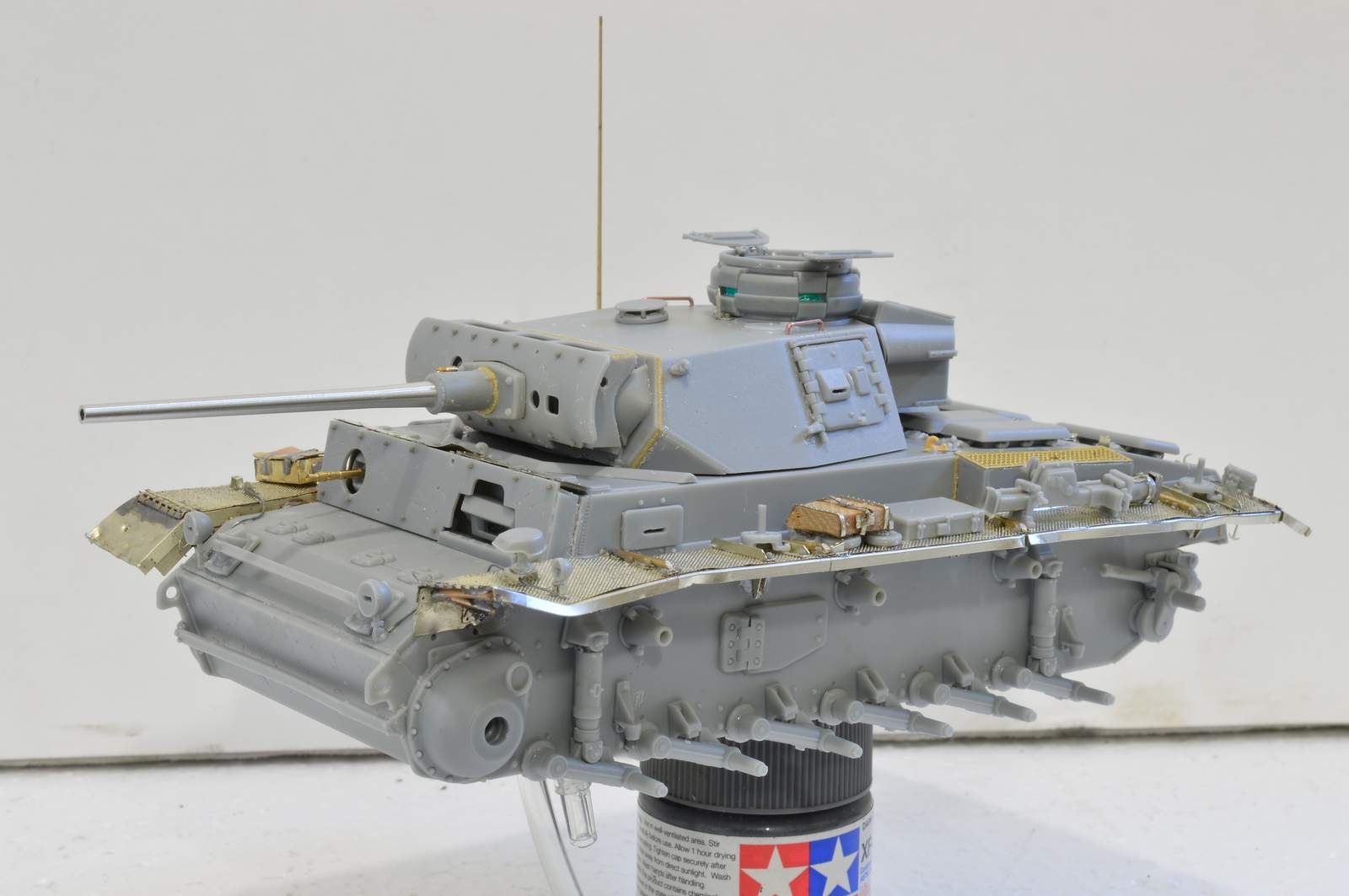 Танк получился хорошо,но есть некоторые нюансы. 1)Приклеены к борту ограничители хода боковых люков.(фото 1) 2)Антенна красилась в базу полностью.(фото 2) 3)Верхний лист разнесенной брони чем так можно было оторвать и загнуть?Сталь там не менее 5-ти мм.Еще вопрос,зачем немцу высовываться из люка ,когда у него открыты все смотровые щели на ком.башенке?Не акуратно приклеены боковые люки с правой стороны башни.И ИМХО конечно,немного не достоверно смотрятся куски травы на гусях,да и конец троса надо бы за что-то зафиксировать.Ну,а в целом хорошо.С уважением.