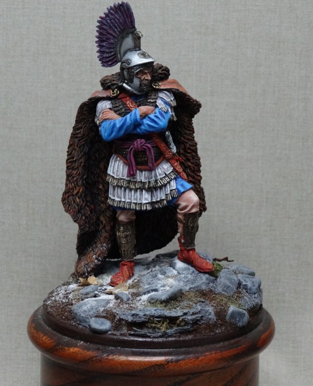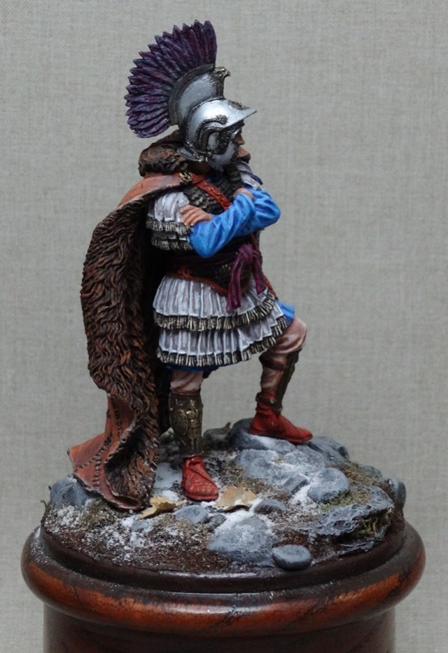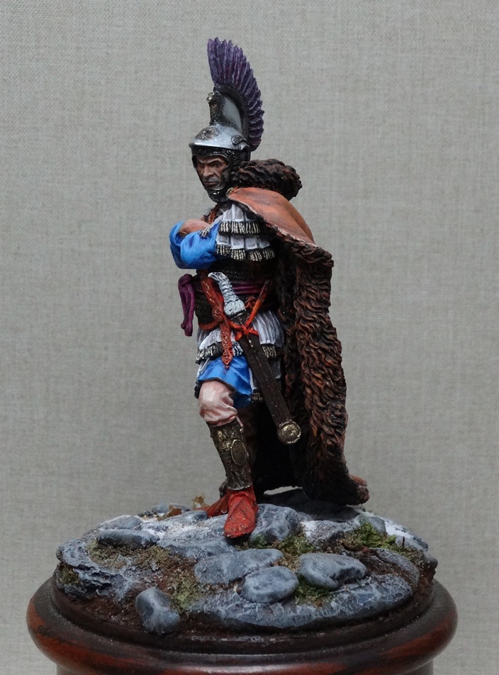 хорошая работа!мне очень понравилось! особенно покраска! мало у кого она на фигурках получается. особенно лицо понравилось. здорово! из вопросов... меч крупновато получился, рукоятка толстовата и вообще... шлем - есть такая находка или изображение или просто так, вольная фантазия... фактура шерсти крупновата. а что касается цвета, мол красного мало... а может это Караузий еще до провозглашения себя императором?) ну и вообще, вся эта тема, будто римляне, особенно в армии только красную одежду и носили, всё это изрядное преувеличение. так что и примененные цвета мне очень понравились!