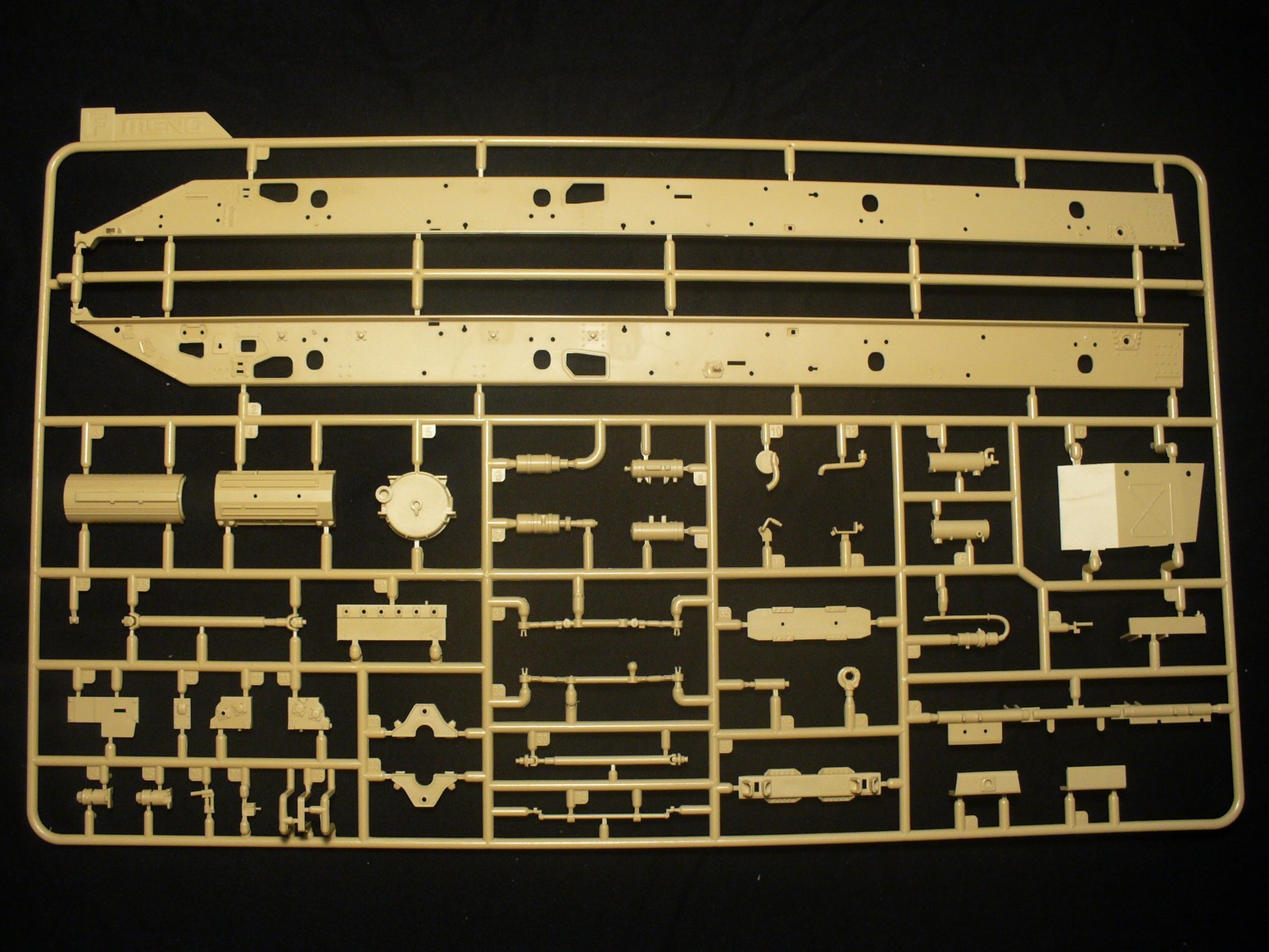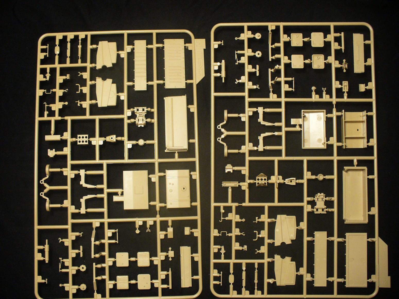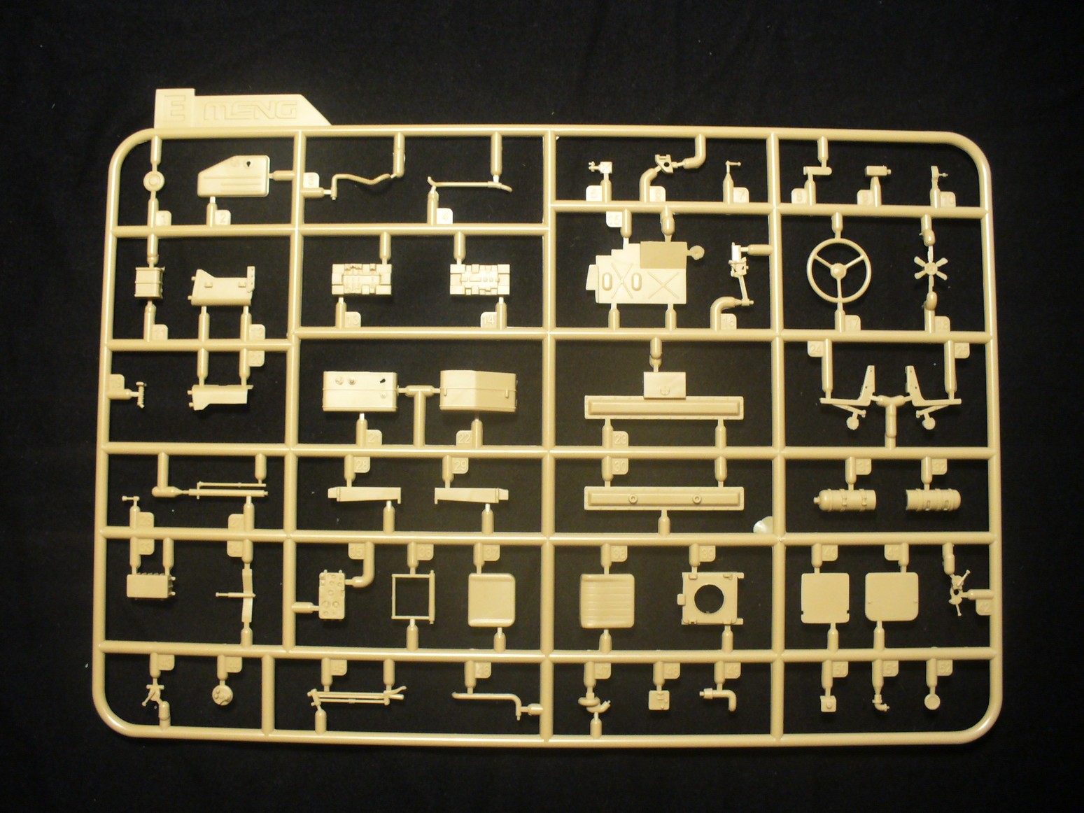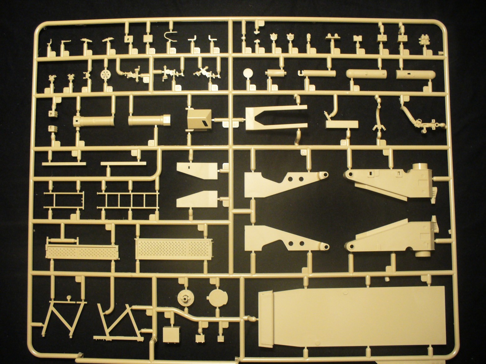 Модель производит приятное впечатление. по сравнению с моделью от трубачей более детализированный двигатель, гидротрансмиссия и раздаточная коробка. правильный угол переднего скоса рамы. Облоя нет. но много следов от толкателей (плюс видно на фотках как будто у толкателя работала только половинка хвостики торчат). насколько будут критичны будут следы, видно уже будет при сборке.
