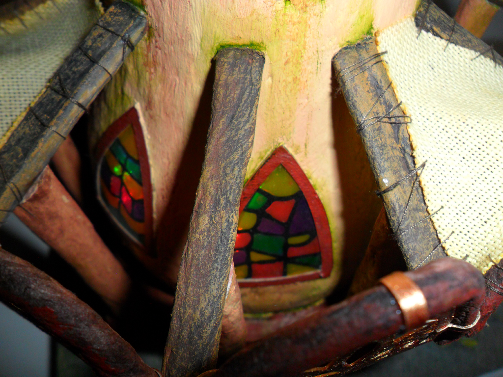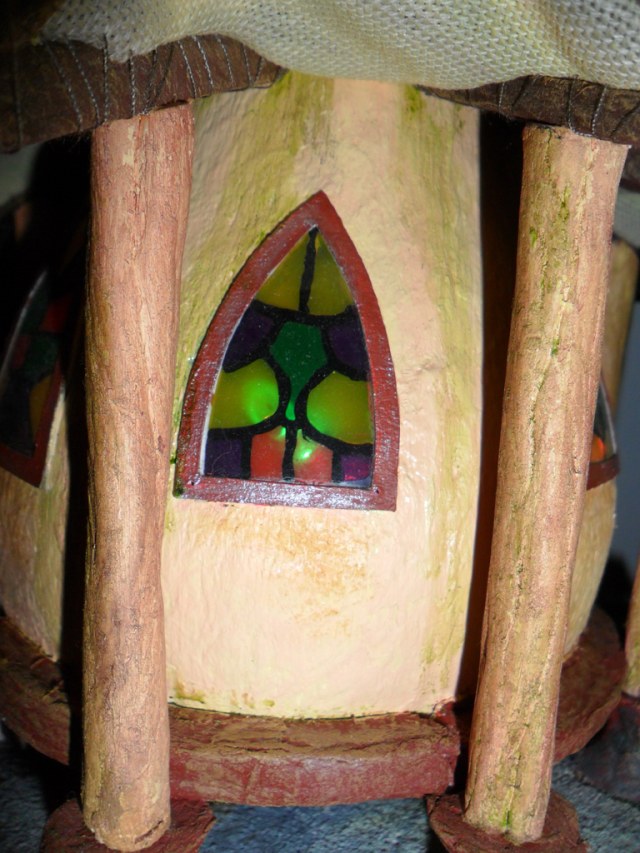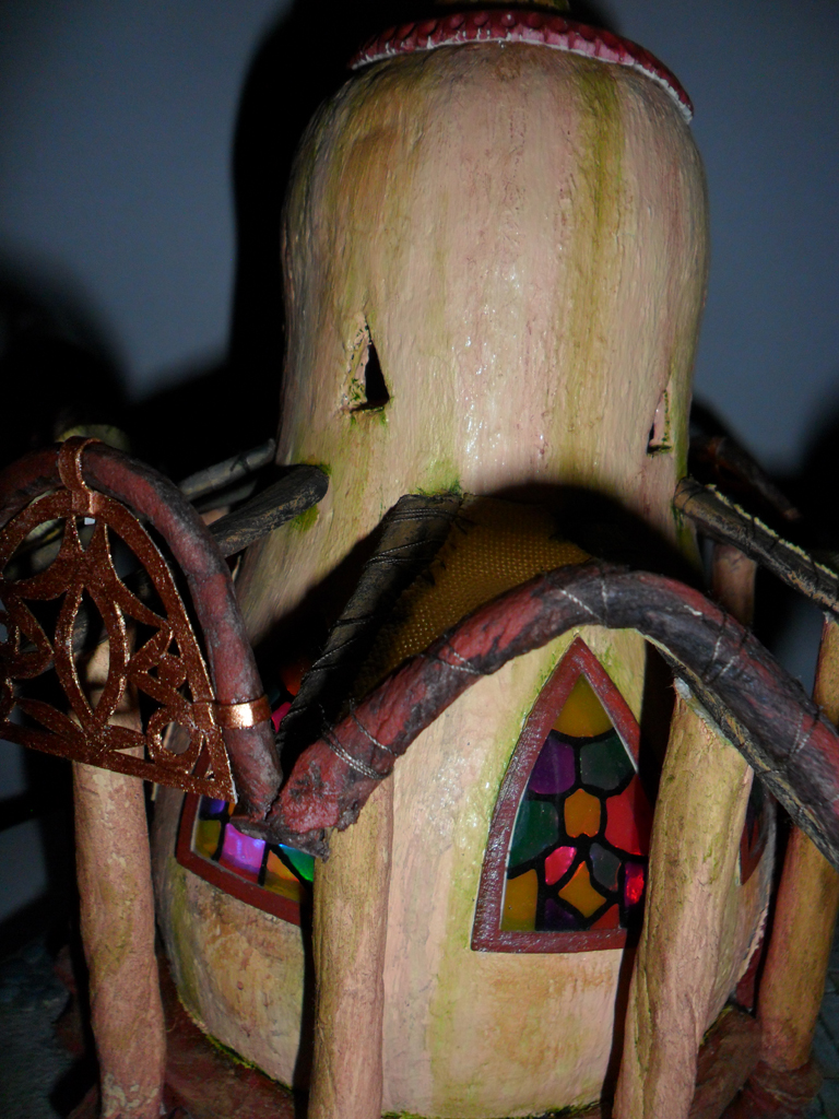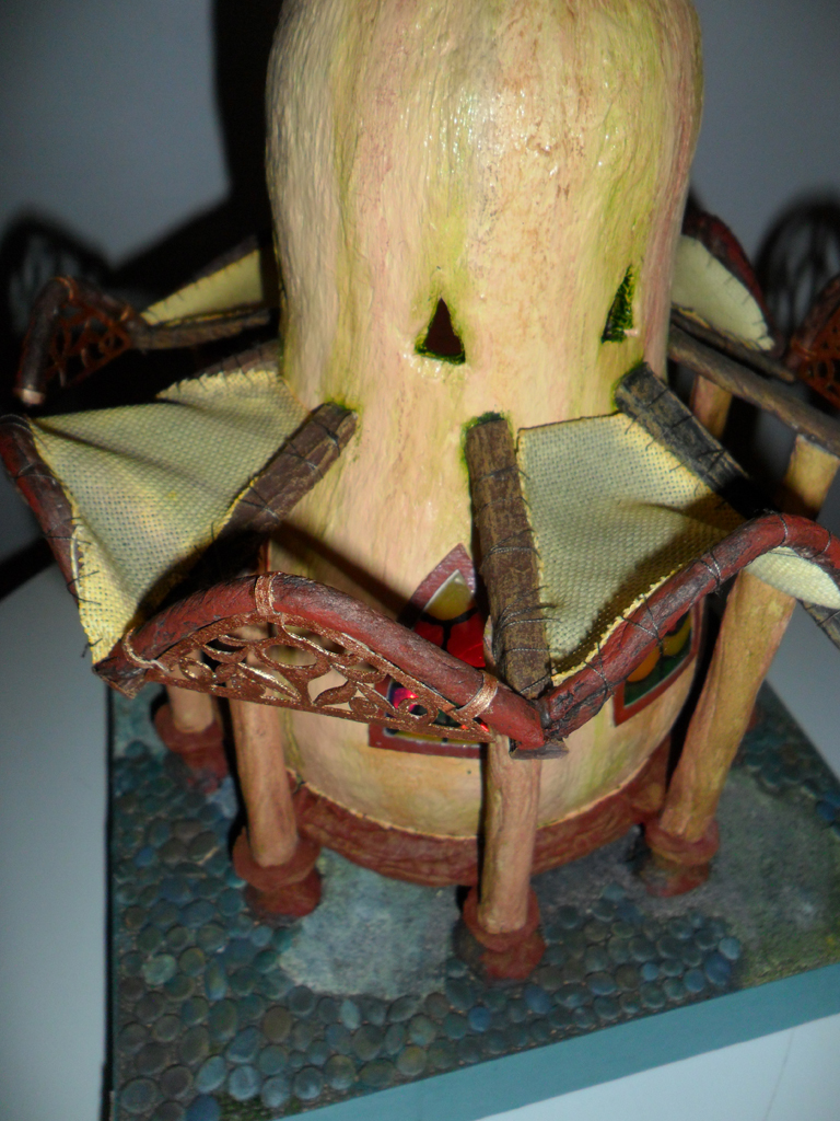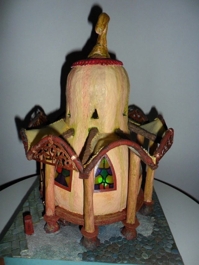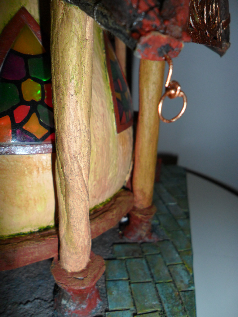 Доброго времени! Очередной домишко. Домик с колоннами. Мыслил еще круговой балкончик поверх колонн, но идея потом разонравилась. Материалы и методы те же, что и на предыдущих домиках:папье-маше- оригинальный болван, туалетная бумага, ПВА или акрил. Единственно, решил опробовать в красках художественное масло. Сохнет дольше, но запах приятный! И на подставке нет слоя туалетной бумаги, а только крашеный уголь из фильтра и камушки из глины. А плитка перед дверью из пивного картона. Узорчики резал из тонкого 0,5 мм картончика. Живые персонажи рядом с домиком, конечно, желательны, но видимо они появятся на других работах. Размеры домишки 21см Х 21см х 30см.