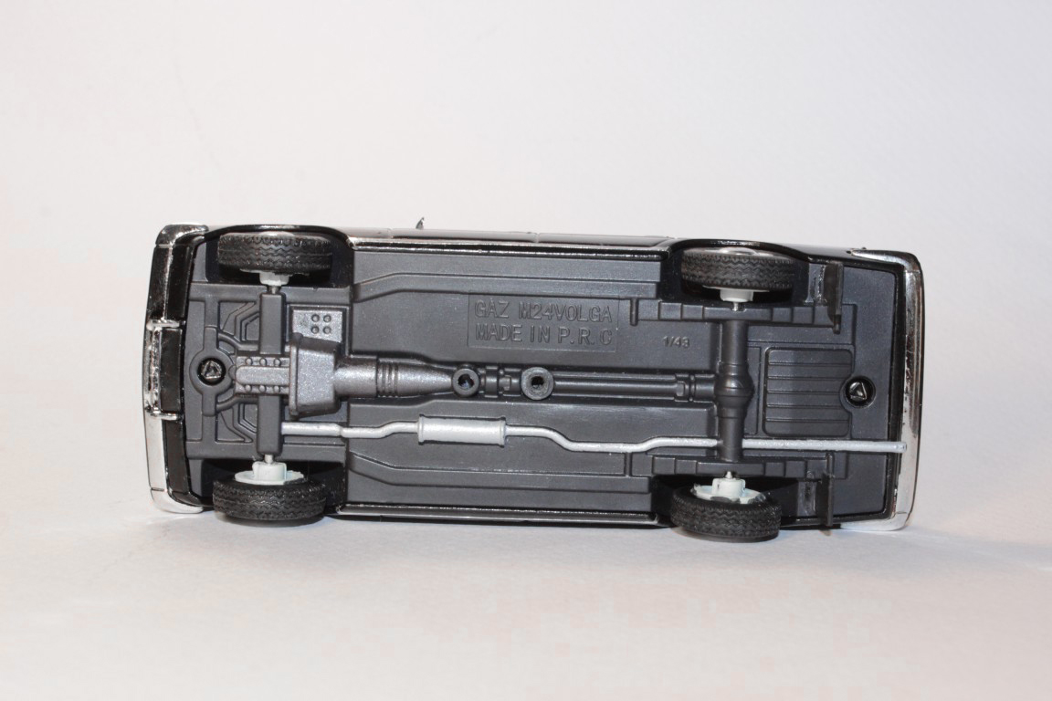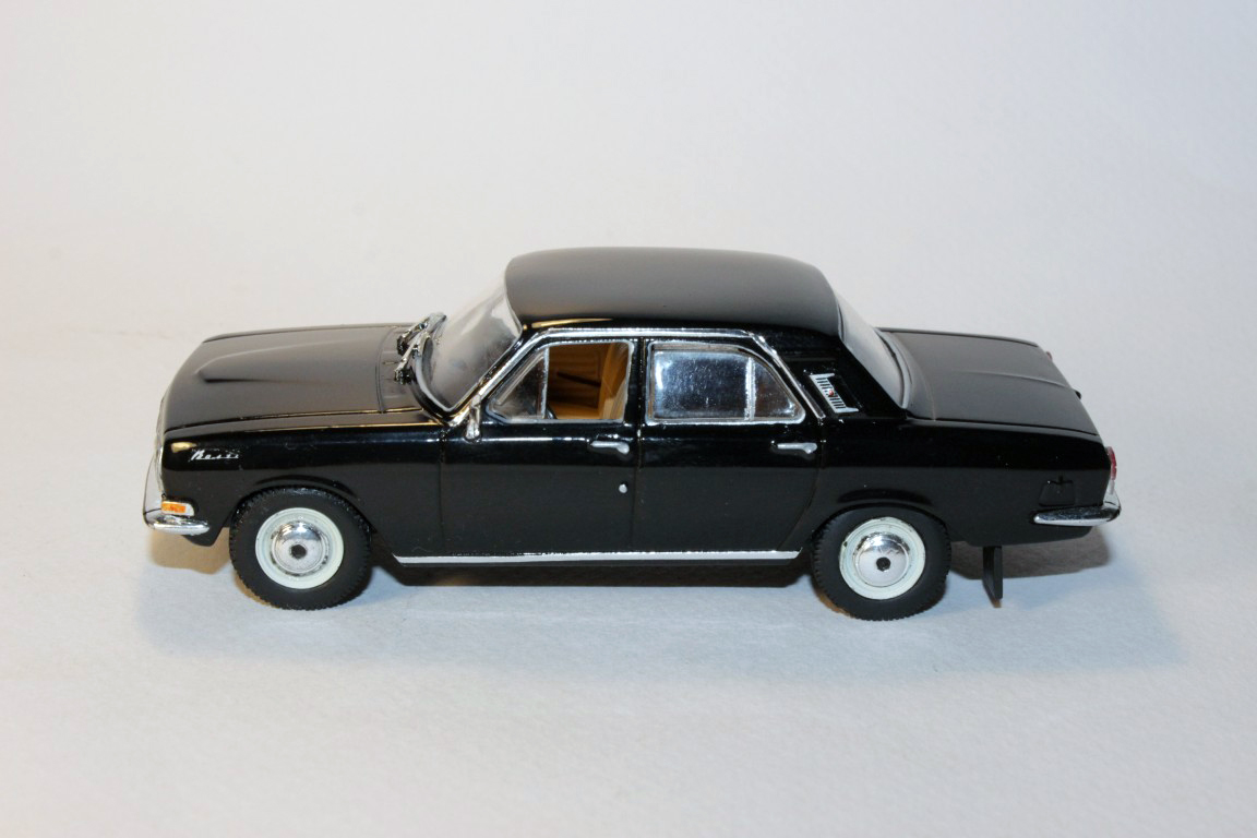 Модель из серии Автолегенды СССР (лучшее) Была подарена покоцаной и раскомплектованной. Перекрашена в черный; шильдики - травлением от мастерской Игоря Новикова; четырехфарная решетка - деталь Старт-43 (Украина). Салон покрашен бежевым; госномер пробный по прототипу черной машины; уменьшил колпаки колес сточкой по диаметру.