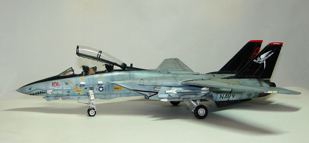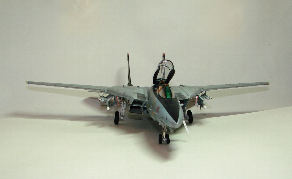 Да, так может быть (только при этом желательно чтоб крыло было сложено - автор по этому поводу написал в описании) и не только на F-14. Из мелких придиризмов - стабилизаторы ракет желательно делать тоньше, стачивать. Основной цвет ракет слишком серый, правильнее чуть светлее и немного другого оттенка (light ghost gray, FS36375 - под цвет низа). Чехлы над приборками правильнее выглядели-бы не коричневыми а faded olive drab/green или coyote tan. Лобовуха - чересчур зеленая. Те белые полосочки по бортам носовой части - formation lights - по цвету правильнее окрашивать в тускло-желтый, как перед стабилизаторами и на законцовках обеих частей крыла (там примерно правильно) - это если подразумевается что борт интенсивно эксплуатируется, ну он же грязный, а если их сняли и он стоит "на приколе", как на интернетных фото F-14A-140GR 162689, то тогда все нормально На некоторых фото основные стойки шасси разъезжаются слегка - это так на снимках получилось? "Прямоугольничек" перед пушкой чуть более темного металлика, раз уж ероплан загрязнен. Если в чем-то ошибаюсь то поправьте. А так работа очень красиво смотрится, видно что с душой сделано! Понравилась! А интересно, Фениксы Хася в комплекте даёт?