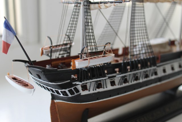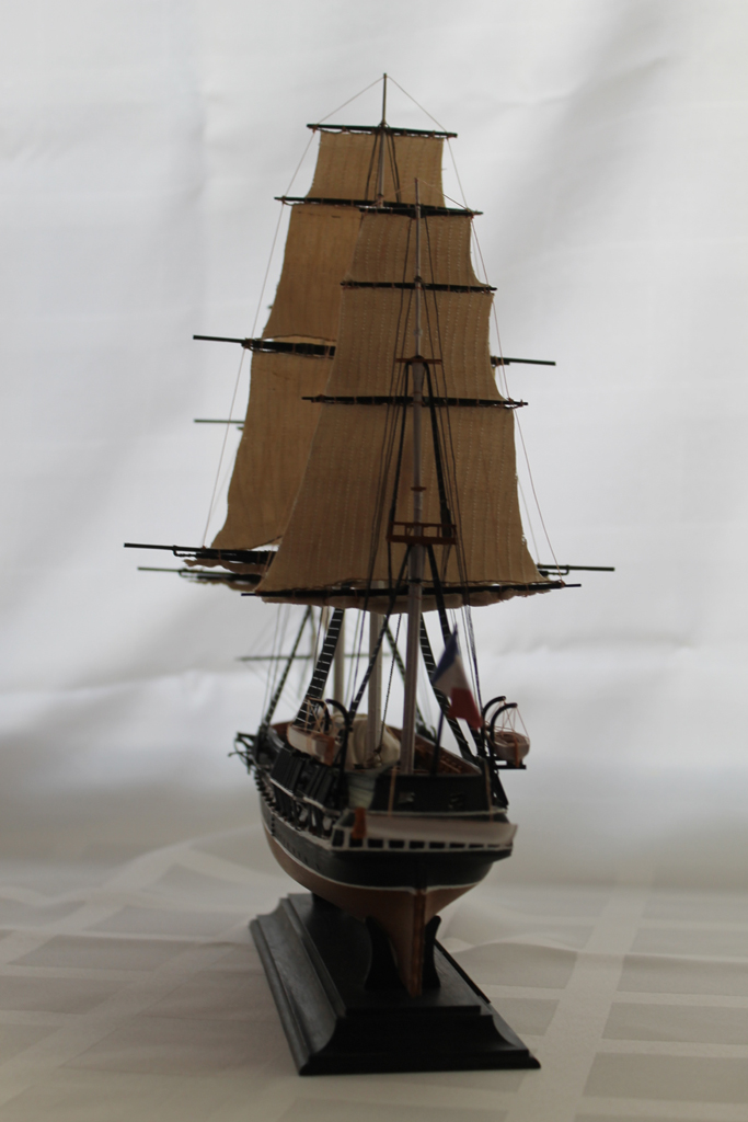 Матчасть комментировать не буду- не моя тема. А вот название... Кажется "Корабль Его (Её) Величества"(HMS) относится к кораблям Флота Его (Её) Величества, то есь Royal Navy и к французскому флоту ( а ваша модель несёт французский, причём далеко не королевский флаг)отношения не имеет.