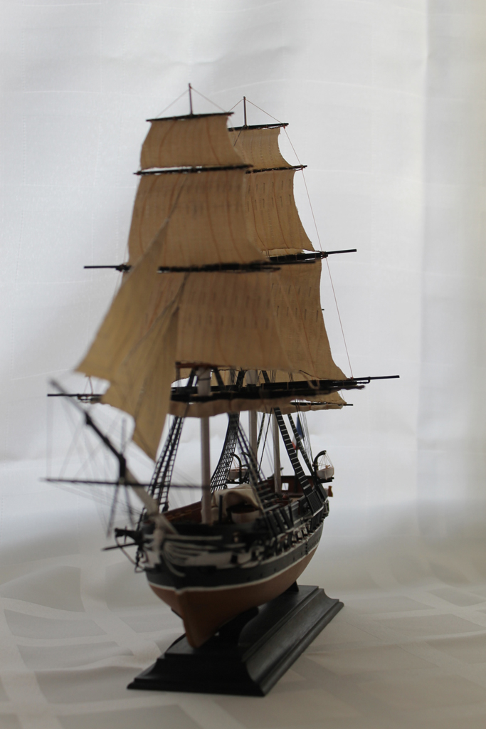 Приветствую автора! Мои замечания белая краска на бортах местами не совсем ровно нанесена, и на мачтах толстоватый слой краски. Фок мачта с заметным креном, но это бывает когда такелаж натягиваешь. А в остальном прекрасная модель мне понравилась