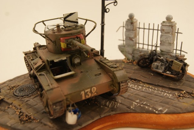 Ну скажу я вам зачем же вы танк пластиковым ведром назвали?,если вы имели в виду то ведро что висит спереди то оно ни чего пластикового ни по форме не по содержанию не имеет,а мотоцикл это антураж так как я с разу написал что ни какой исторической привязки диорама не несет его можно убрать!