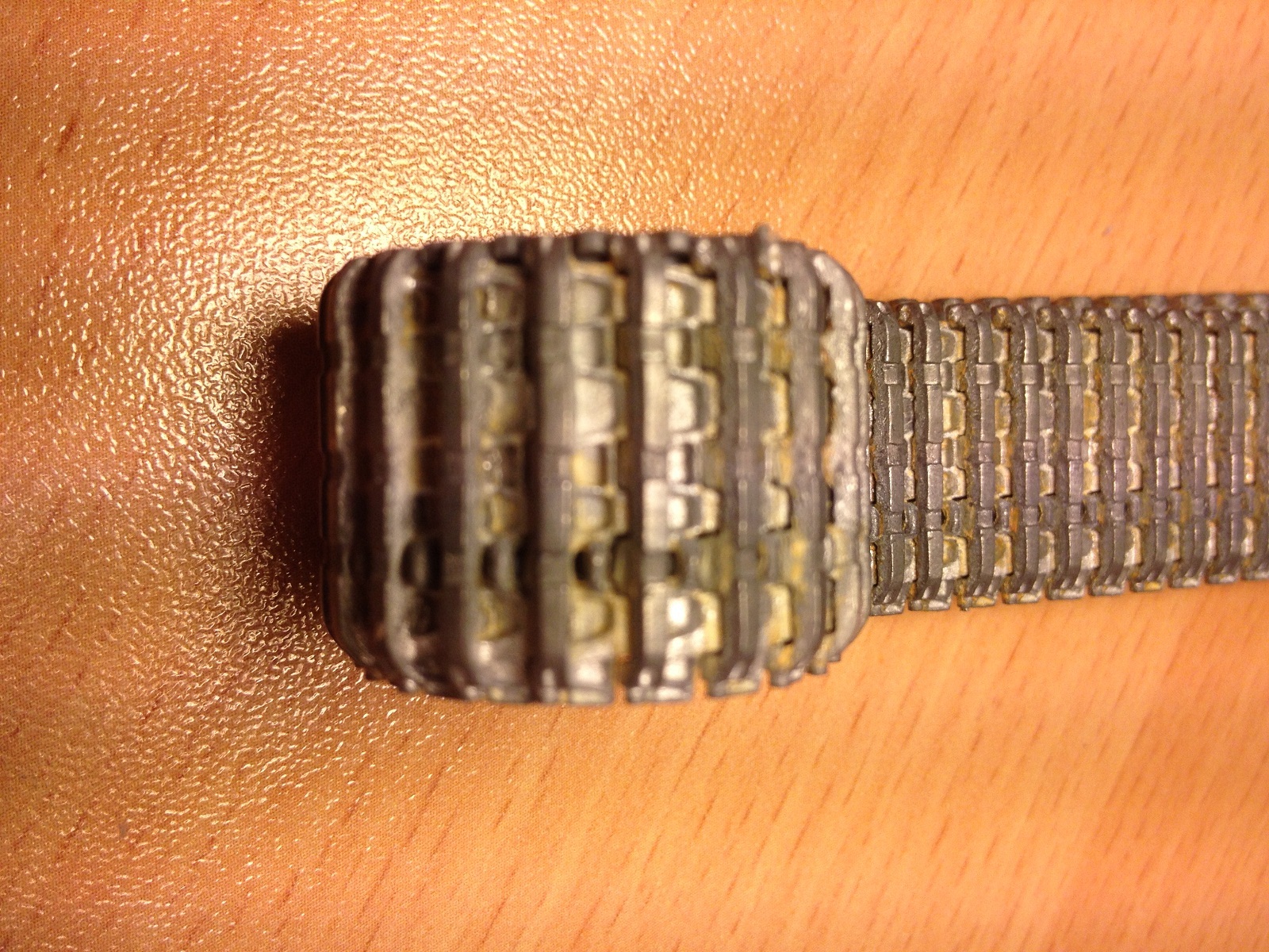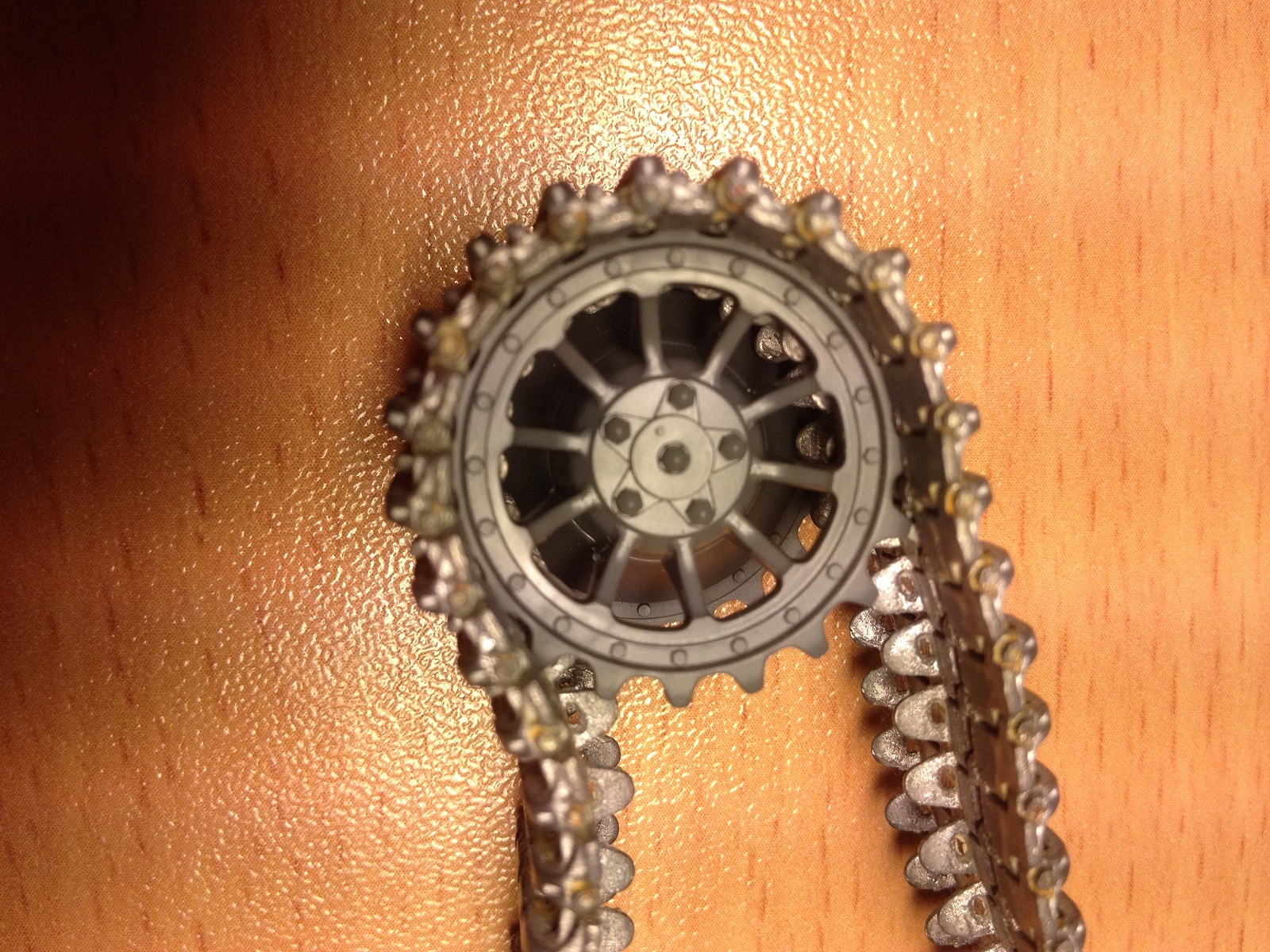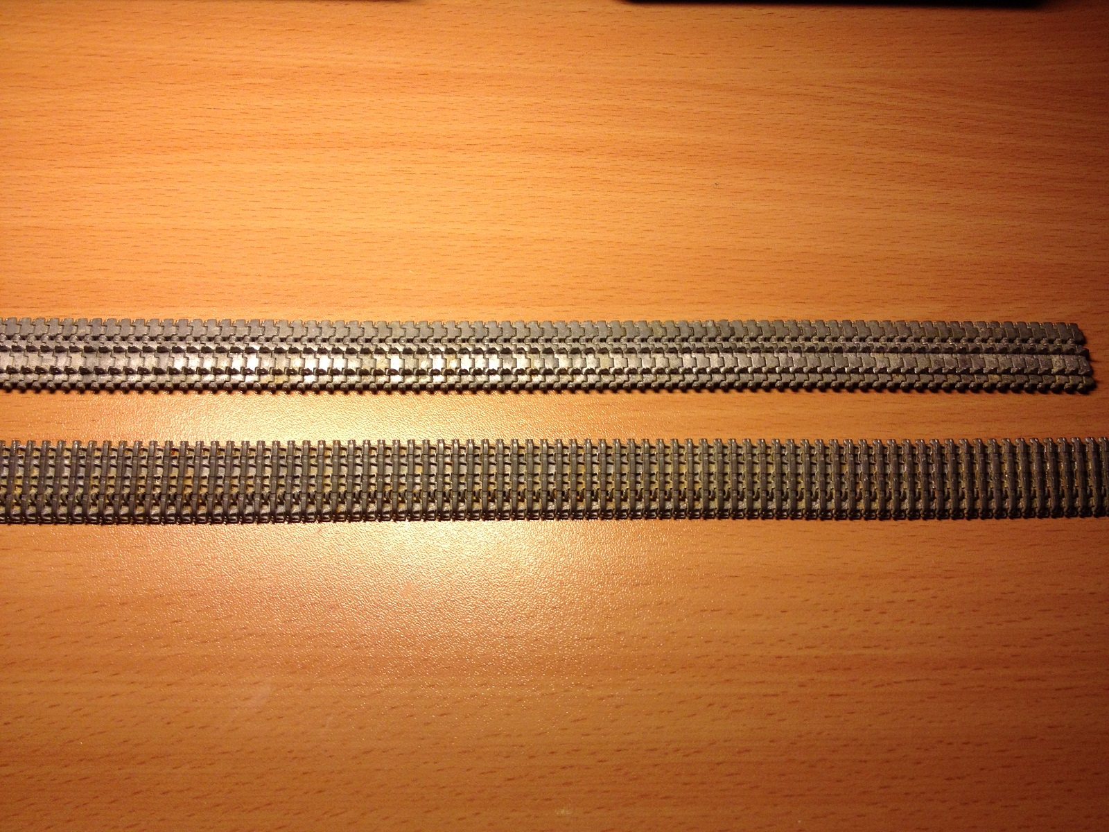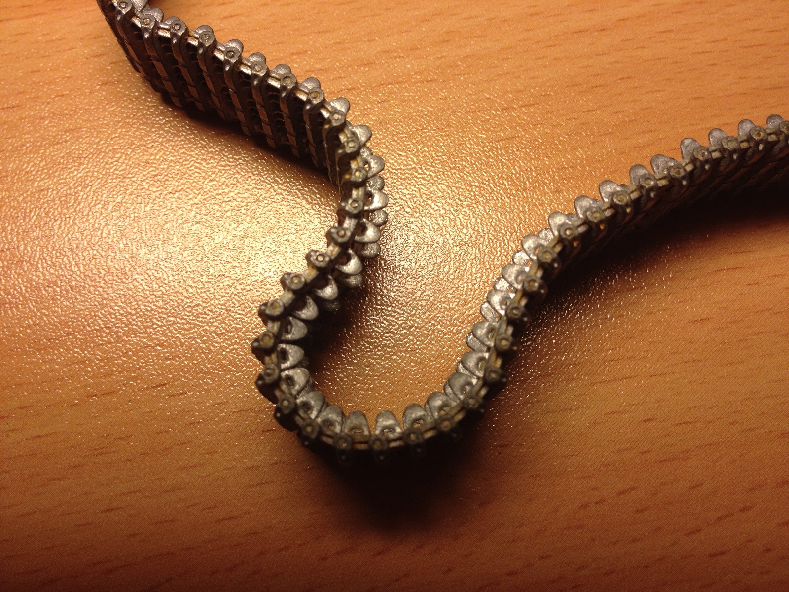 Комплект металлических траков для раннего Тигра от 5,45.Каталожный номер Т-018. Траки уже собраны в ленту, лента очень эластична и ложится на звездочку раннего Тигра от Тамии просто отлично. В ленте 96 траков - все как в реальности. Есть небольшой запас траков - около 30 штук, хвати т и на башню и на лобовой лист повесить.Тяжелые, легко будет сделать провис. Рекомендую для использования