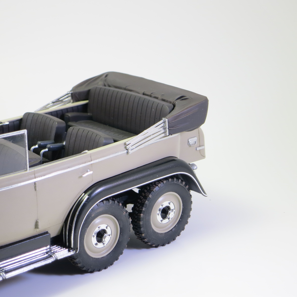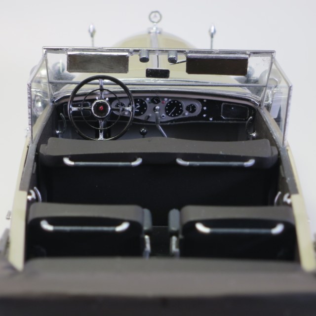 Добавлено: зеркало заднего вида, обтянул чехол складного верха мед. перчаткой, "хром" - алюминиевая фольга сама клеящаяся, краска на кузове vallejo 70.986 deck tan, лак тех же, в конце future, интегрировал светодиоды в фары.