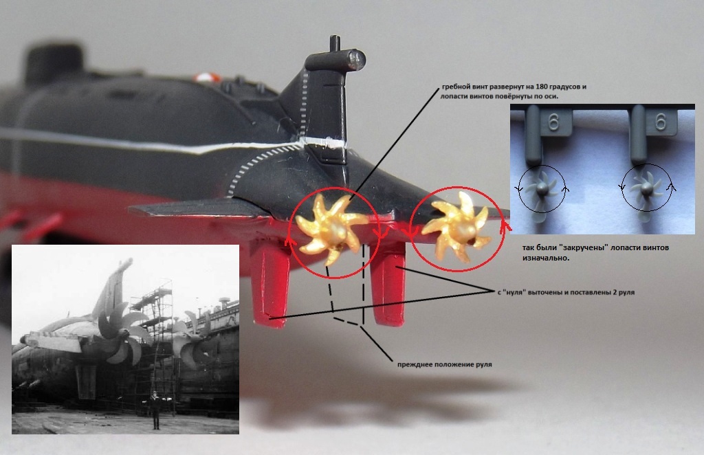 Я устранил "косяки" которые нашёл и которые бросались в глаза, сильно запилом заниматься не хотелось, в мат части не силён, да и как то не особо по этому поводу заморачивался. Нижние кормовые рули долго пилил, пристраивал и выравнивал, вроде ровно стоят, наверно фото не много искажают реальность