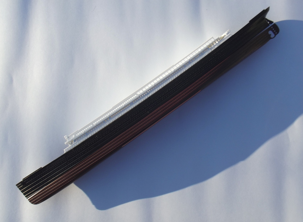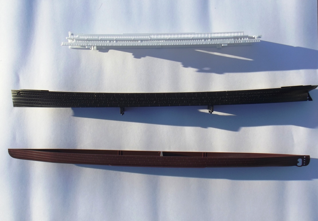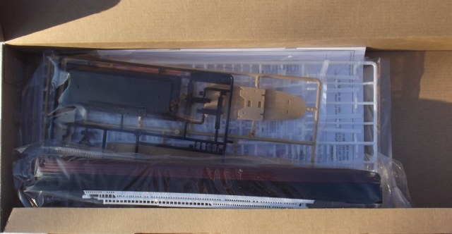 Про модель; Во внушительных размере (610*203*60 мм) коробке (хотя можно было на 200 мм. меньшую по длине коробку всё это впихнуть) из плотного картона с верхней загрузкой, находятся упакованные в отдельные пакеты пять литников разного цвета и сам корпус корабля из трёх частей, тоже разного цвета. Литники с деталями тех цветов в которые должны быть окрашены детали каробля, поэтому по сути корабль можно и не окрашивать (для тех кому не охота, или не чем, ну или если модель будет собирать ребёнок). Литники из прочного пластика, хорошо детализированы, смещения пресс форм нет, утяжин и облоя не обнаружено, следы от толкателей находятся на внутренних сторонах деталей. Так же в наборе имеется подложка с декалями и чёрно-белая инструкция по сборке и окраске модели на 8 страницах, на русском языке. В мат.части не силён, поэтому не могу пояснить на сколько близка данная модель к оригиналу. Про стыкуемость; на счет всех деталей не знаю (не пробовал пока собирать), но части корпуса стыкуются идеально. Цена набора 1200 руб. Вот вроде бы и всё, всем приятного просмотра !