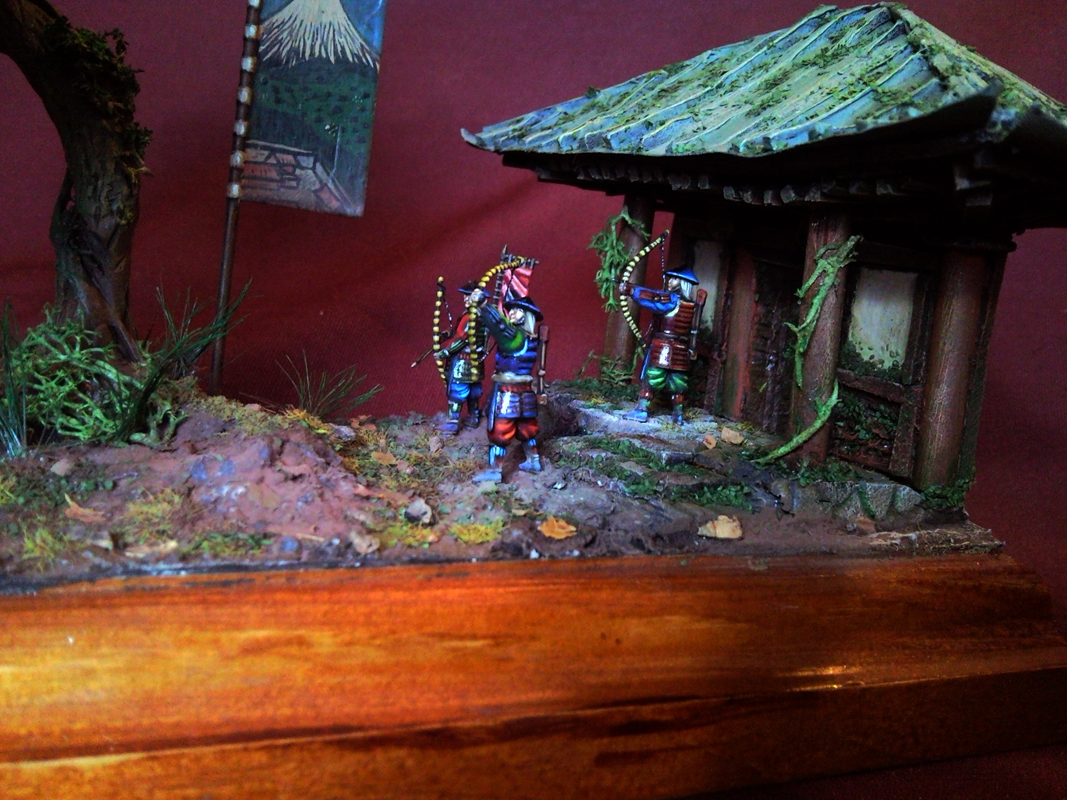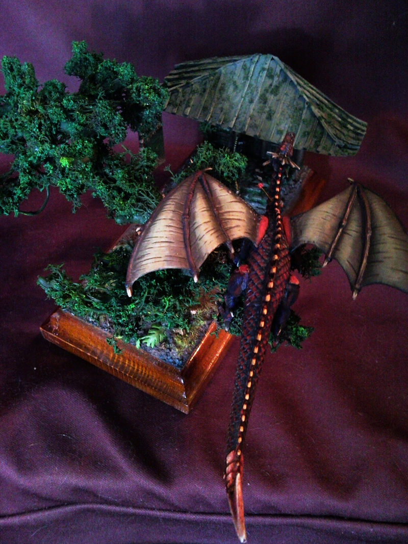 Недавно товарищ решил отдать мне свои запасы наборов "Кольцо Власти" (в чем я ему очень благодарен). Кавалерия проклятых, проклятый легион, зомби, чародей, берсеркер (может что то забыл) и 2 дракона. Единственный минус - все было окрашено. По этому я просто задул все поверх краски грунтом. Тут я решил сделать простенькую диораму. Естественно решил начать с дракона. Дракона решил окрасить в Китайском стиле. Китайский дракон нападает на Японских воинов. Так как фигурка дракона не вписывается в масштаб 28мм. я решил переиграть с масштабом 1:72. Главное то что я хотел "победить" окрас таких маленьких фигурок. До этого я красил викингов, но не был доволен качеством окраса (да и фигурок тоже). В начале окрасил я дракона и лучников. Дракона красил первым. Моей ошибкой было то-что я поленился окрасить его аэром. Пришлось повозится с ним не один день. Дракона сделал слегка блестящим. Добавил 2 стрелы в районе шеи. Пришло время 1:72. Лучникам сделал тетиву и начал красить. Чутка подзалил фигурки грунтом из баллона (не сильно). Таких мелких лучше покрыть грунтом из аэра, что дает должный уровень контроля за процессом. Но росписью восстановил все детали. Как всегда все фигурки покрашены по разному. Красил по одной фигурке. Время уходило (На фигурку) чуть ли не больше чем при окрасе 54мм. Окрасом остался очень доволен. Далее подставку. Все самодел. Деревья - проволока + пластика Fimo и Сонет. Лучше подойдет Сонет для таких мероприятий. Запекалось все минут 30 в духовке, при температуре 130 градусов. Дом строил из палочек деревянных, картона, полистирола (Который при грунтовке скукожился и все покривилось еще больше. Тут мой энтузиазм закончился из-за огорчения.) и т.д. Диорама вышла простенькая (проходная). В будущем упор надеюсь сделать на создание более сложных и интересных диорам. Решил японский штандарт впендюрить. Чет там даже нарисовал. Пришлось отверстия заделать "Маджик Скульптом", по моему, и прошпаклевать после зачистки (Многократно).