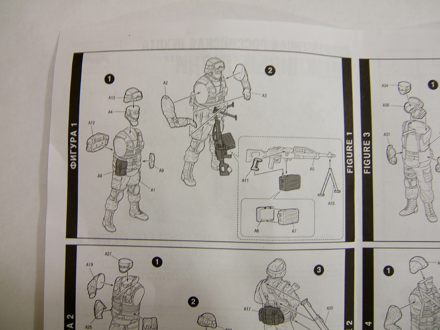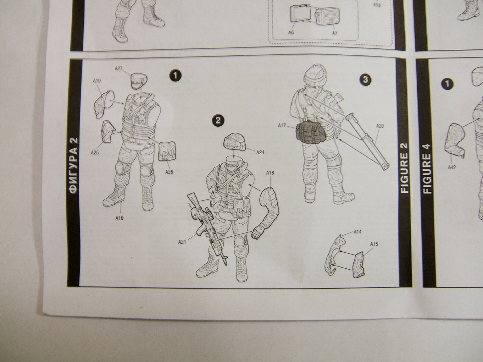 Набор содержит инструкцию в виде одного листа формата А4 отпечатоного с обейх сторон. 2 литника на которых размещено 4 фигуры солдат и 1 фигурки кота.