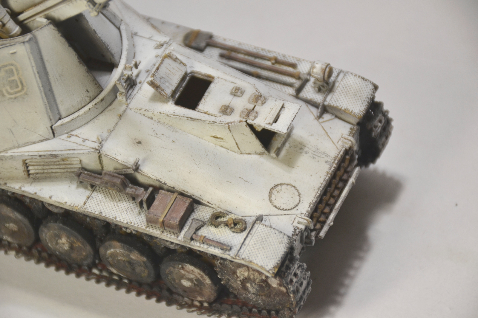 модель в таком окрасе смотрится лучше, чем в предыдущей версии. соглашусь с критикой по вопросу ощущения 72 масштаба, копоть на дульном тормозе смотрится как базовый цвет (т.е. мне кажется надо было покрасить ствол весь, включая дульный тормоз и потом поверх него нанести копоть (а лучше сколы белой краски до тормоза), запасные траки спереди сильно выбиваются (рабочие гусяки белые а запасные не снежинки) побольше бы сколов белой краски, немного фильтра и модель оживет. Очень хорошая ссылка по покраске зимнего камуфляжа.