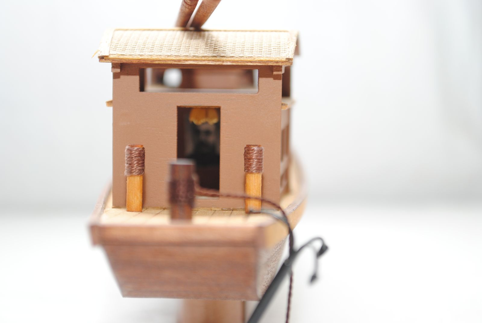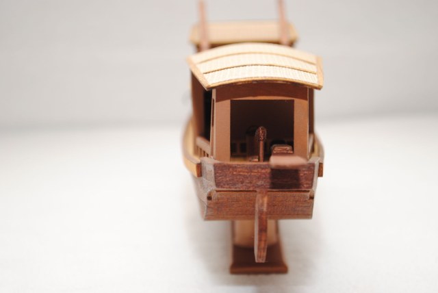 Модель потребовала множества доработок, набор совсем пустой. Если бы я нашел чертеж, можно было бы попробовать сделать «с нуля». Ну а так набор послужил основой для обшивки и практически всех элементов, благо запасы материала позволяли). Материал для меня традиционный – картон, ПВА, шпатлевка, шпации заполнены строительным пенопластом. Рейки разных пород деревьев. Масло грецкого ореха. Краска надстроек – «Звезда - Охра». В идеале хотел получить цвет под дерево, но навыков и опыта не хватило, поэтому покрасил готовой краской. Есть к чему стремиться…)