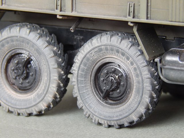 На "родных" колесах не хватает, для достаточно законченного вида, самой малости - выпуклостей в виде окружностей (что между протектором, и собственно, самой плоскостью покрышки). Очевидно, при сборке своего ЗиЛа, вырежу их имитацию из бумаги, к примеру, пропитаю их "Моментом", а после, тем же клеем, приклею.