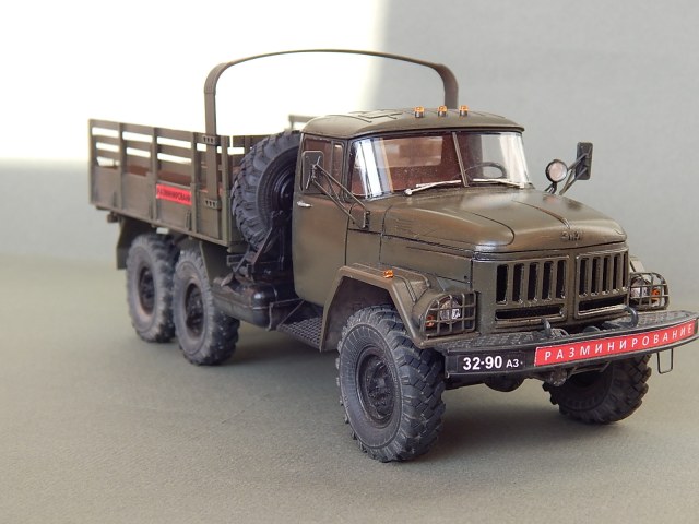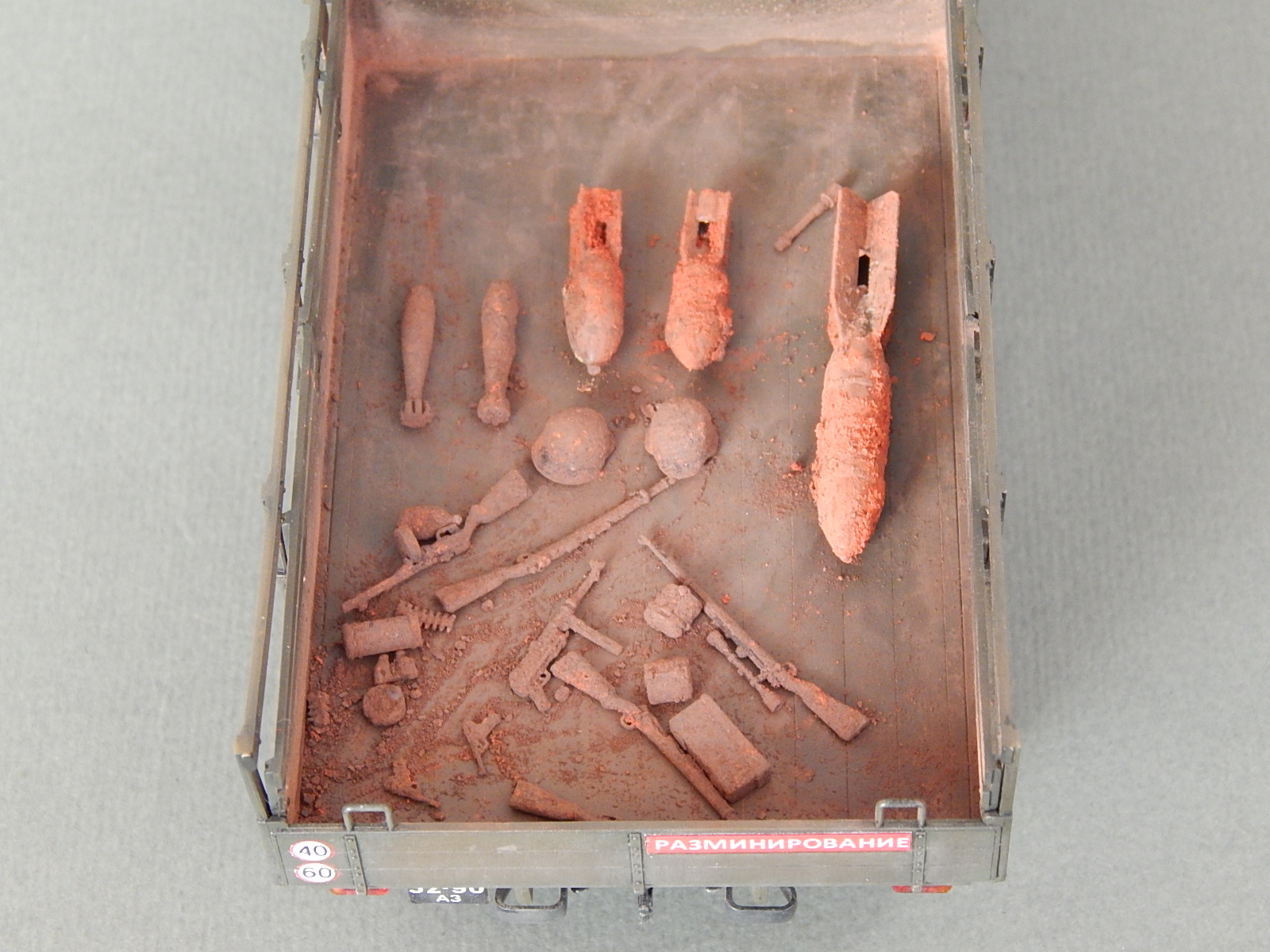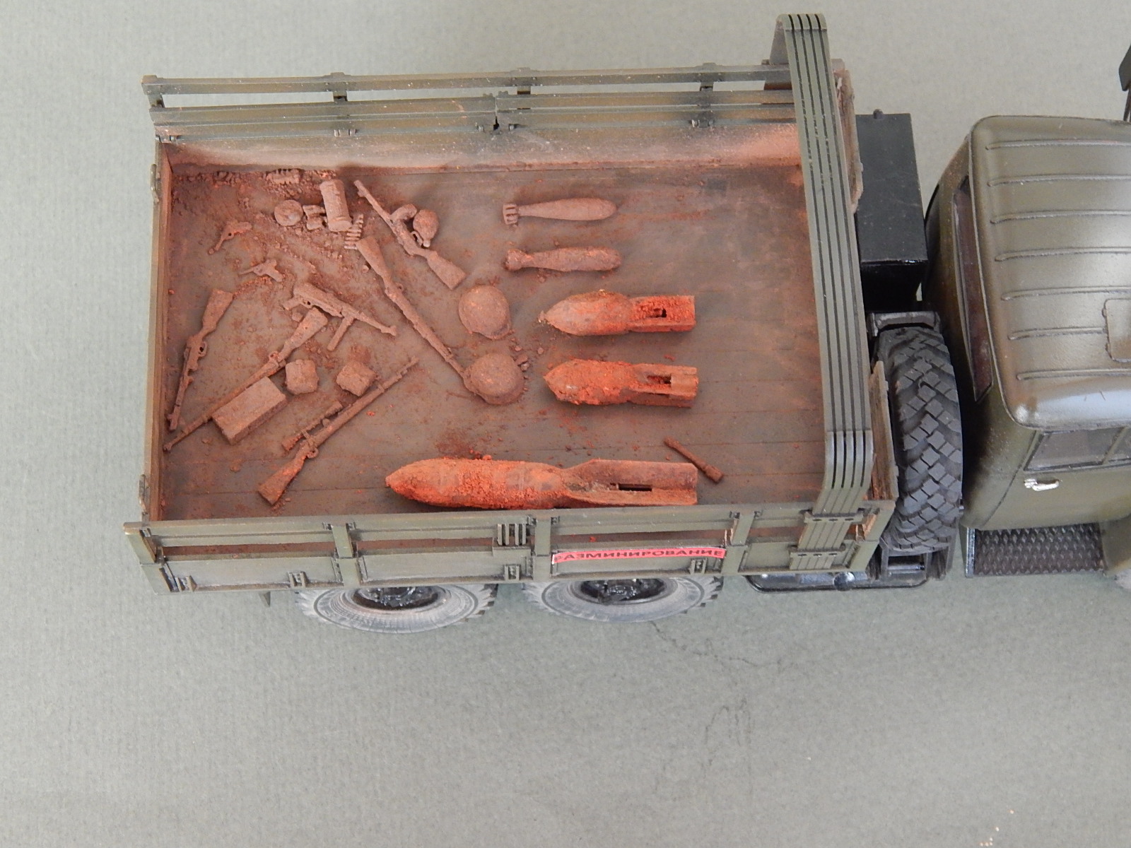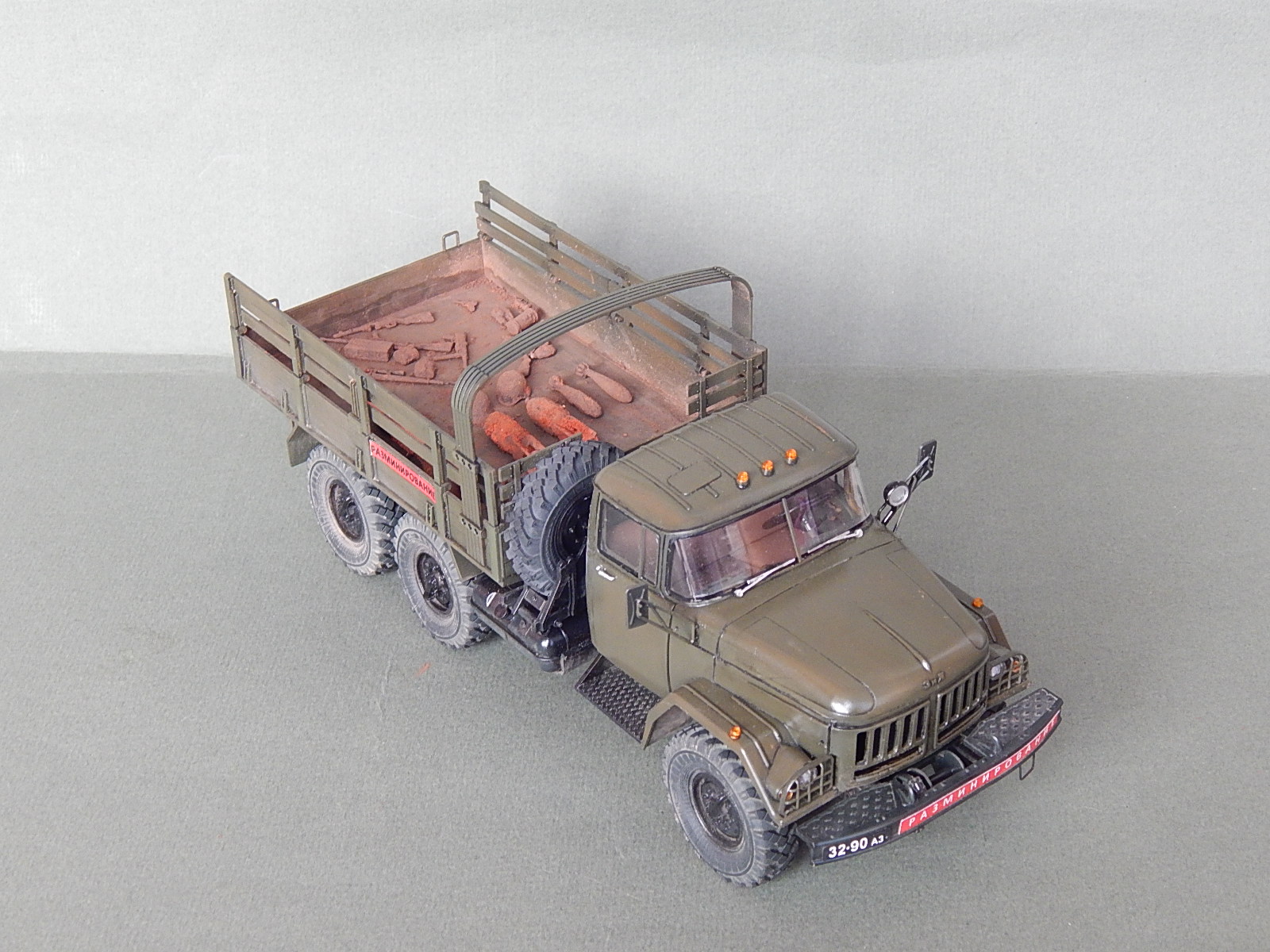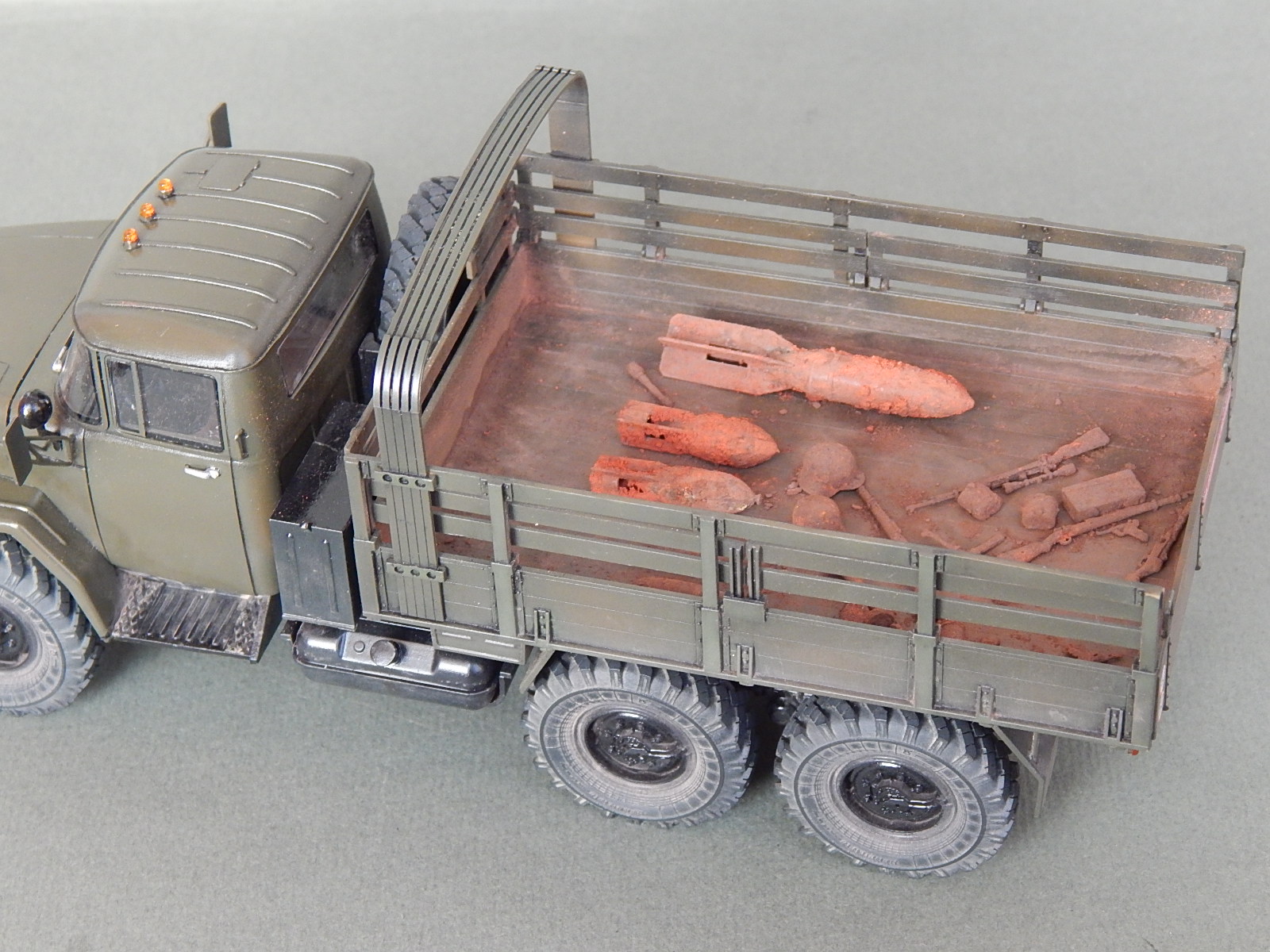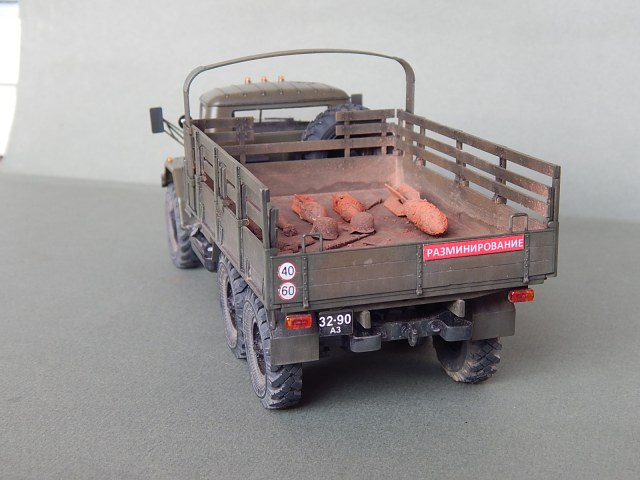 Красивая работа! Но надо было имитировать песок в кузове. Когда-то видел фильм о разминировании. Там в кузове зилка был толстый слой влажного песка. Снаряды и прочую взрывчатку буквально впечатывали в песочек.