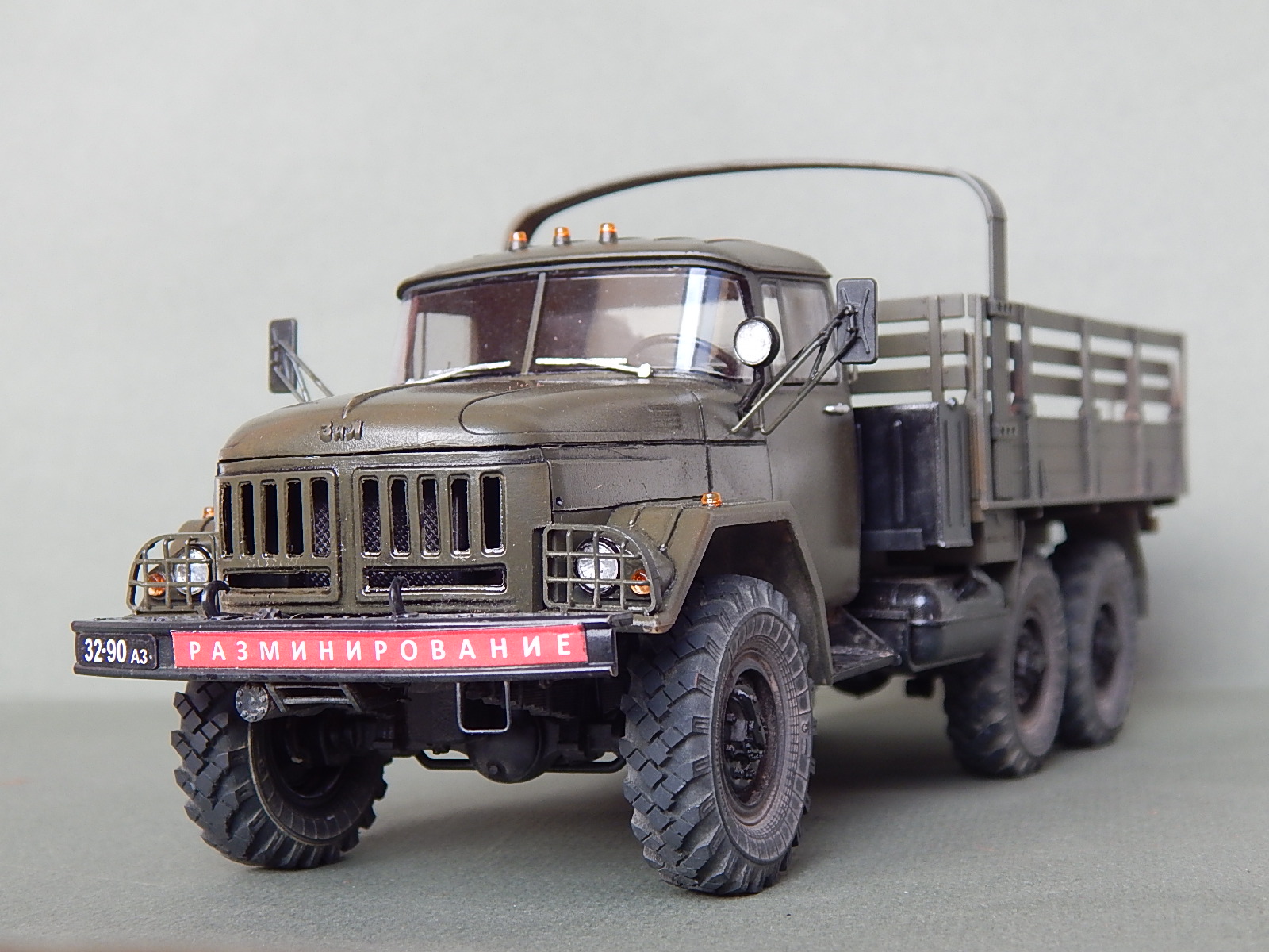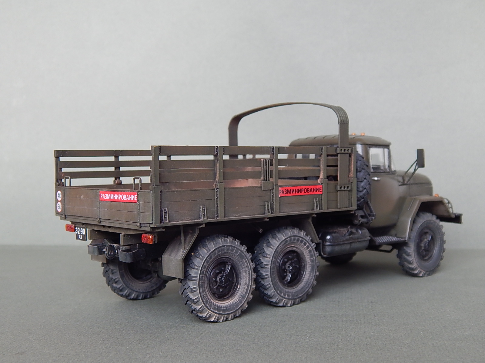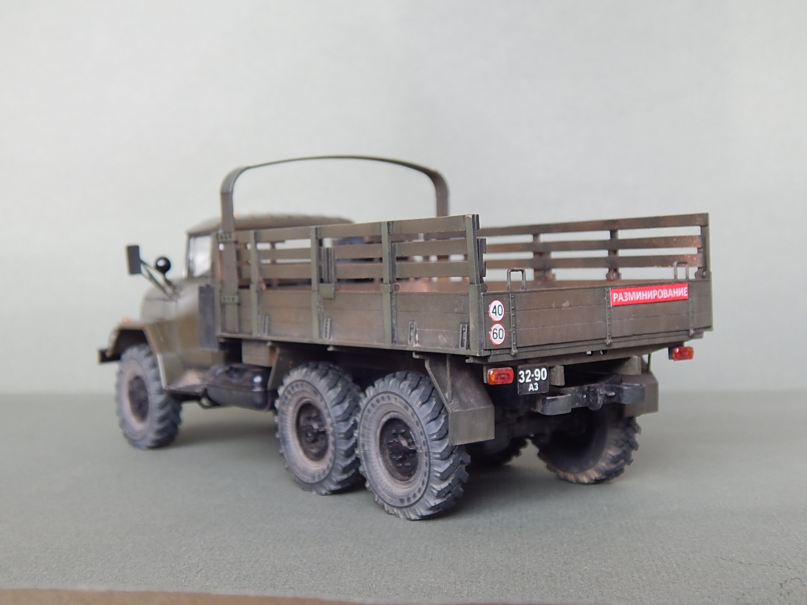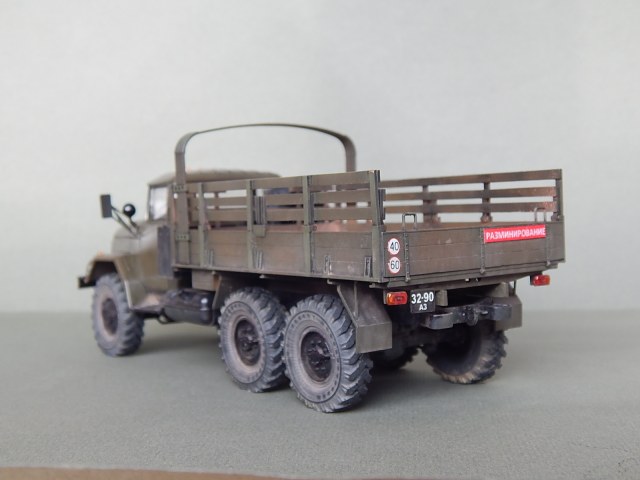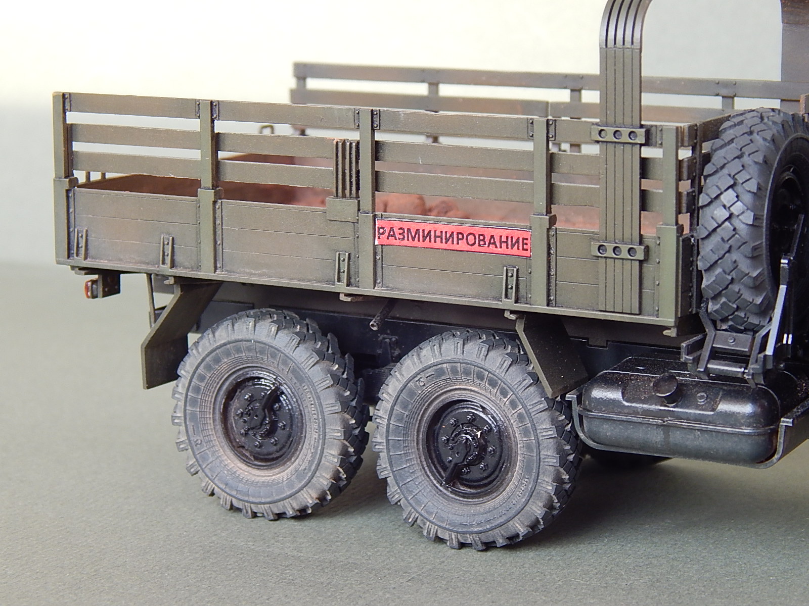 Красивая работа! Но надо было имитировать песок в кузове. Когда-то видел фильм о разминировании. Там в кузове зилка был толстый слой влажного песка. Снаряды и прочую взрывчатку буквально впечатывали в песочек.