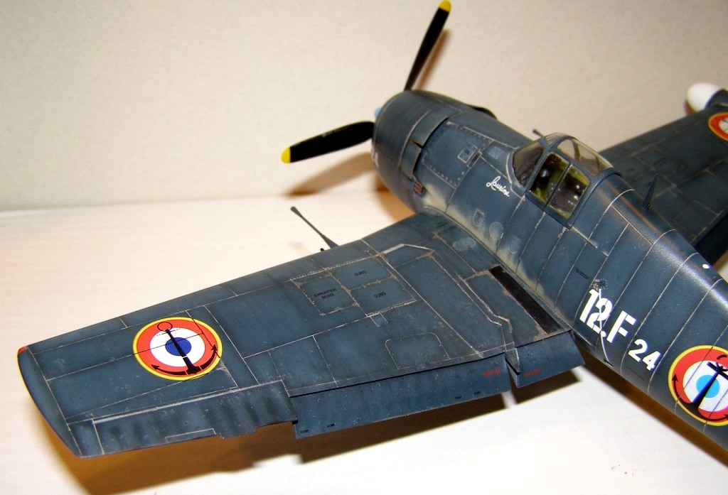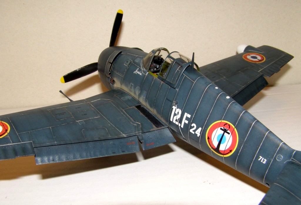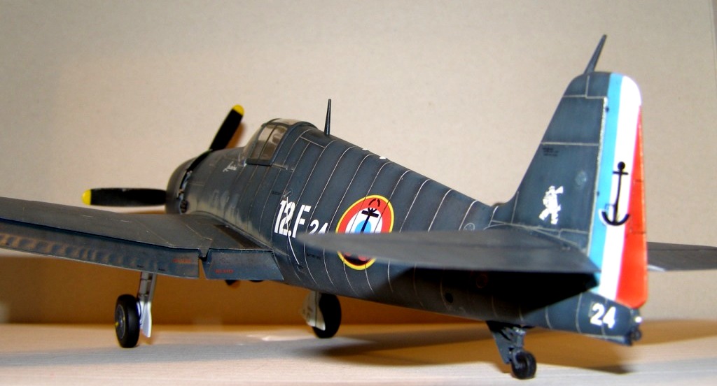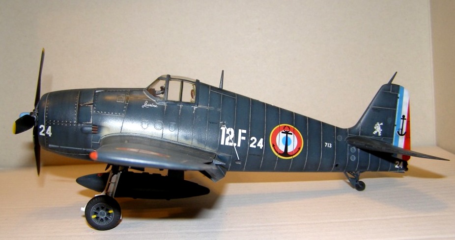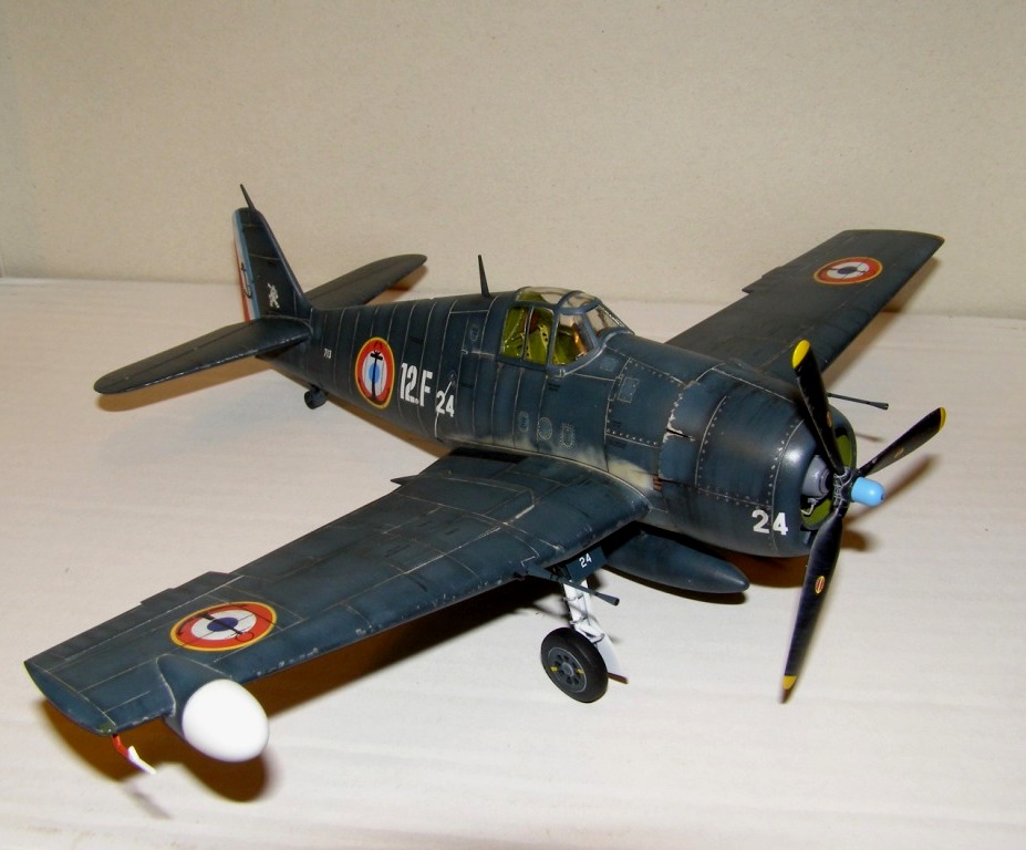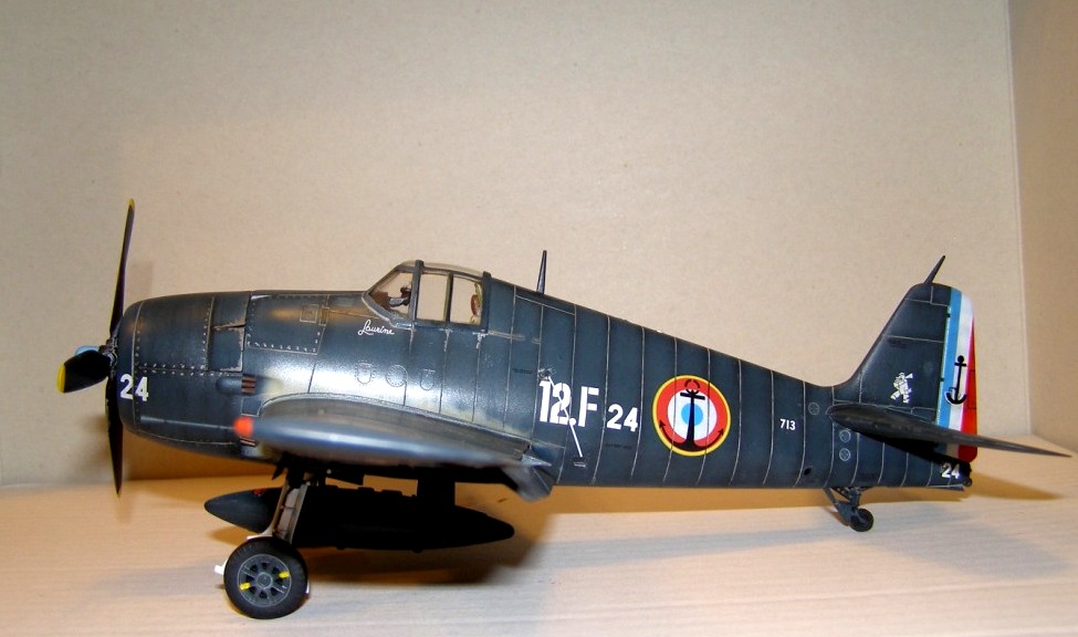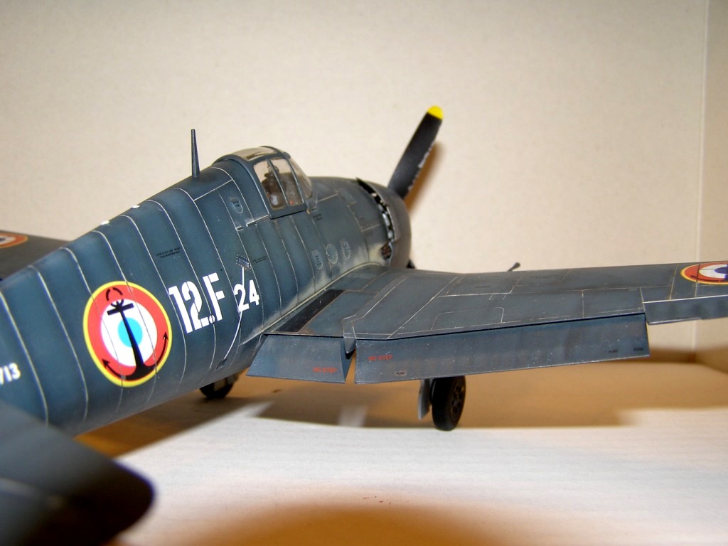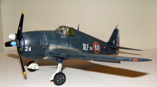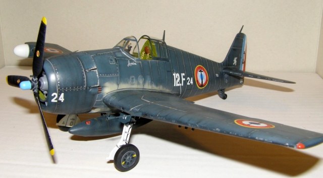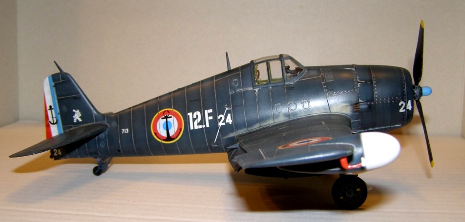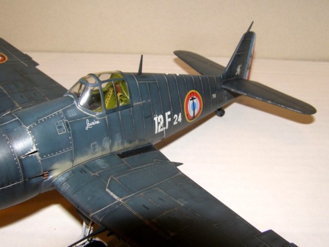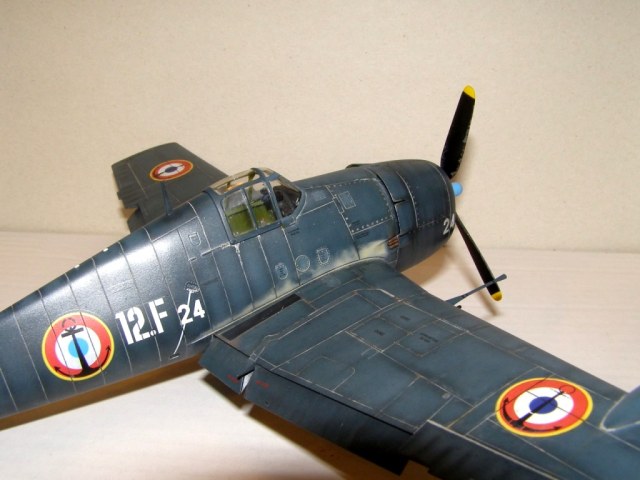 Позвольте высказать свои соображения по поводу окраски модели. По американским стандартам самолеты морской авиации окрашивались в "Navi Blue" или по другим источникам в "Gloss Sea Blue", и тот и другой оттенок были синими и глянцевыми. Истребители действующие ночью как правило окрашивались в черный цвет. Французы получали самолеты "как есть" и только наносили свои ОЗ.
