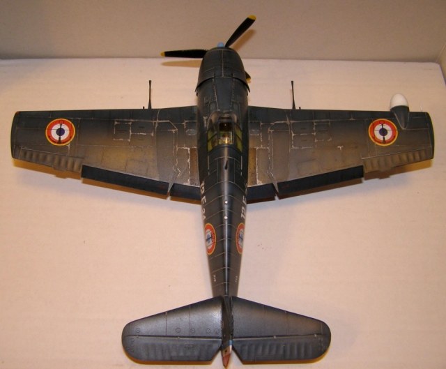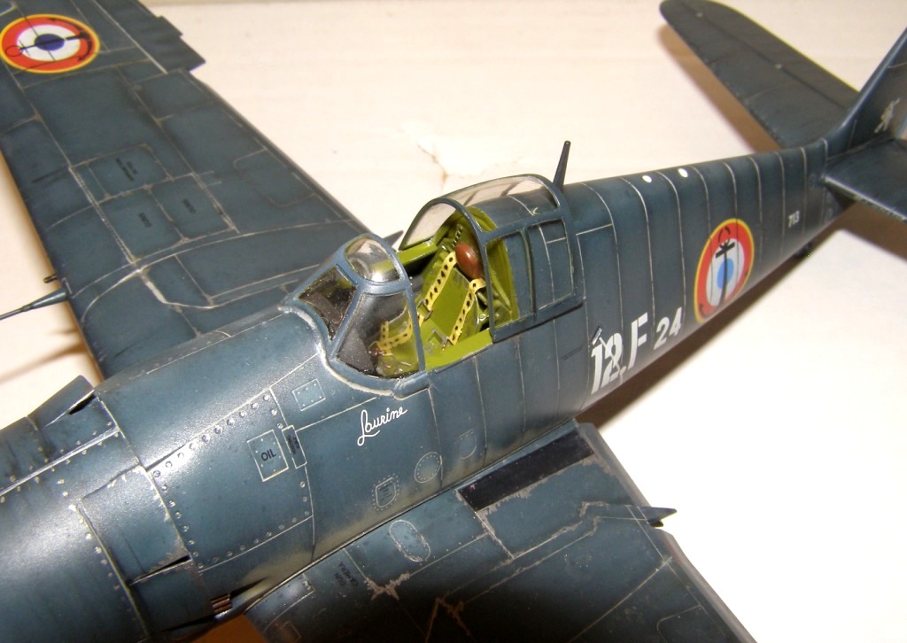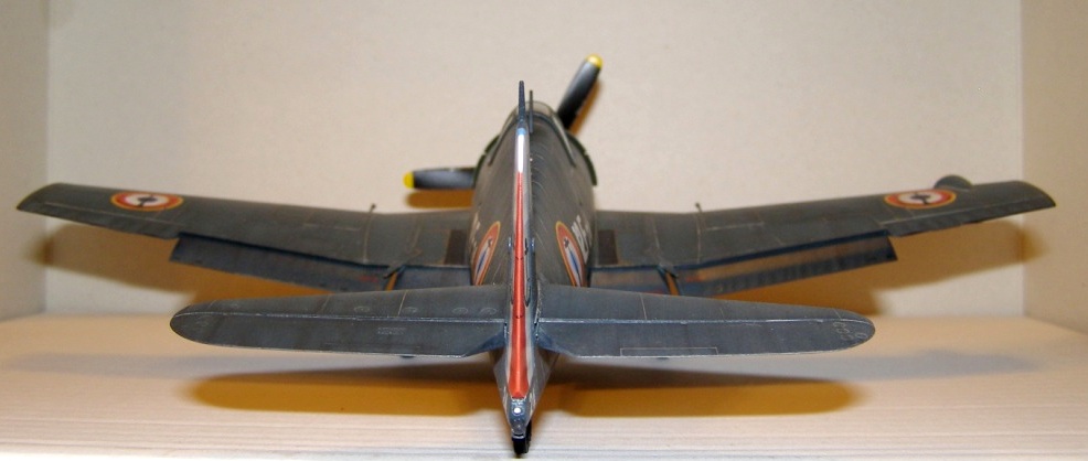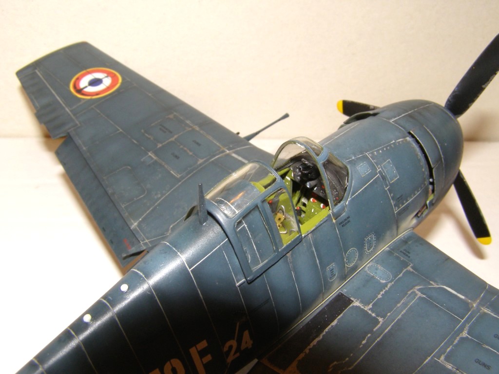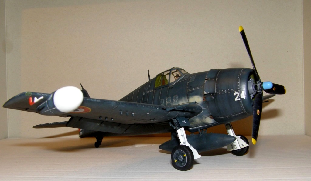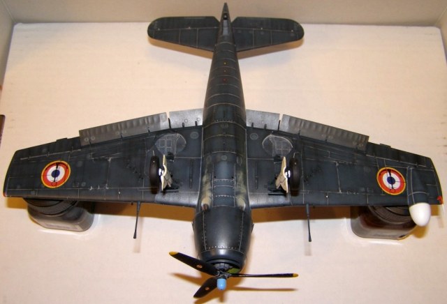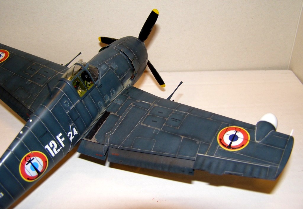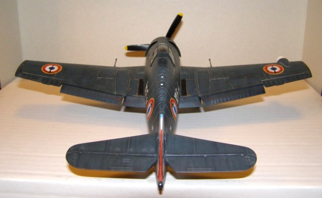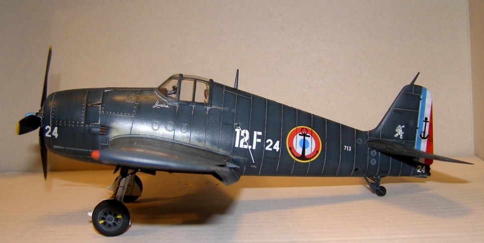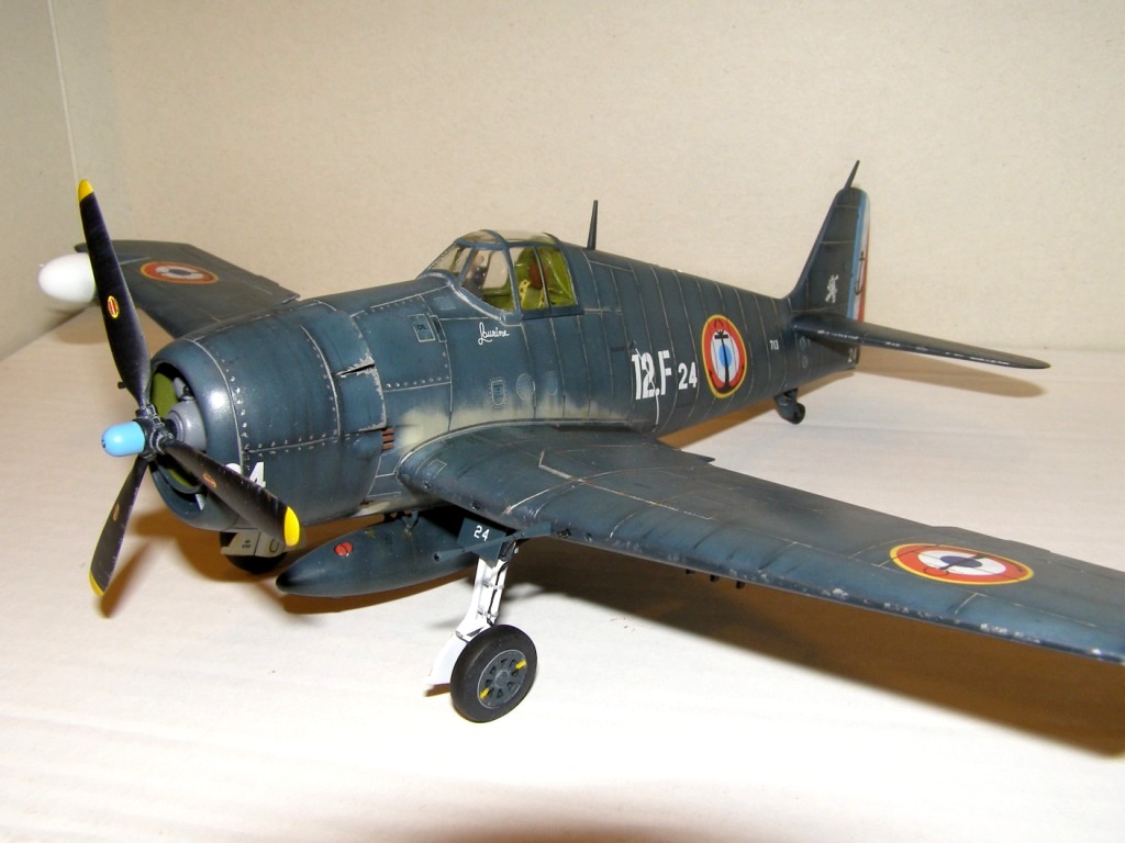 Позвольте высказать свои соображения по поводу окраски модели. По американским стандартам самолеты морской авиации окрашивались в "Navi Blue" или по другим источникам в "Gloss Sea Blue", и тот и другой оттенок были синими и глянцевыми. Истребители действующие ночью как правило окрашивались в черный цвет. Французы получали самолеты "как есть" и только наносили свои ОЗ.