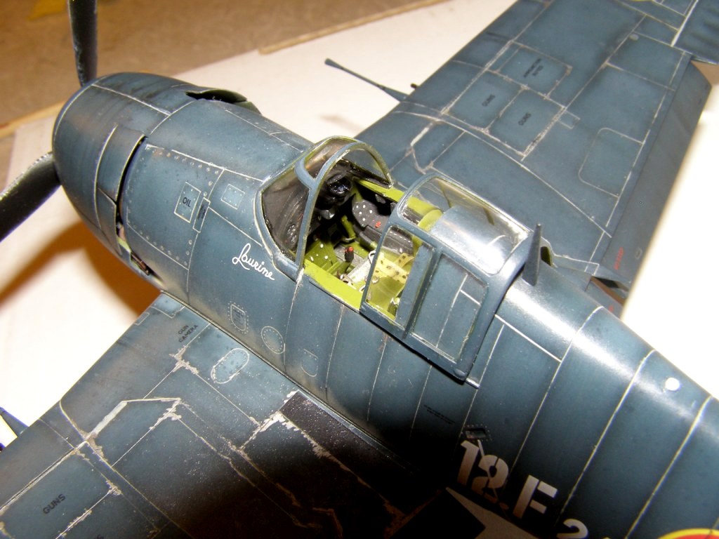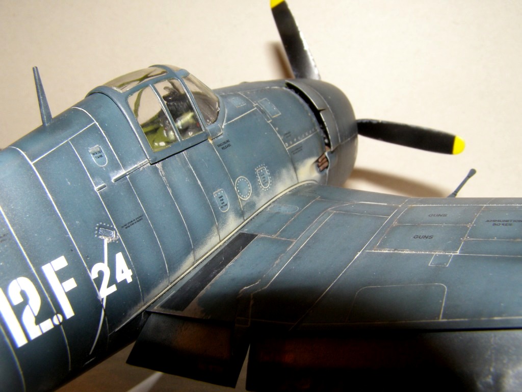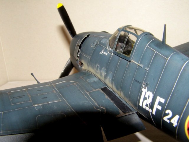 Про мелочевку. В 50х годах на Хеллкетах снизу и сверху уже торчали тонкие штырьевые антенны, проволочки. На брюхе скорее всего должен быть "светофор". Сверху на крыльях - круглые "дублирующие" АНО. Сверху на фюзеле один из огоньков красный. (Не помню, передний или задний). На хвосте под рулем направления два белых огня. Откидная посадочная фара - большая, круглая и довольно таки заметная под крылом (Она откидывается одновременно с выпуском шасси). В носке крыла - маленькая "обтекаемая" рулежная фара. А у ночника еще, скорее всего, были и "строевые" синие огни по бокам в районе козырька фонаря (но не факт). Хеллкет как и многие американские палубники вообще иллюминацией обвешан как новогодняя елка! В 48м все это "блескучее безобразие" можно здорово изобразить! А еще и зеркальце в фонаре, на козырьке...