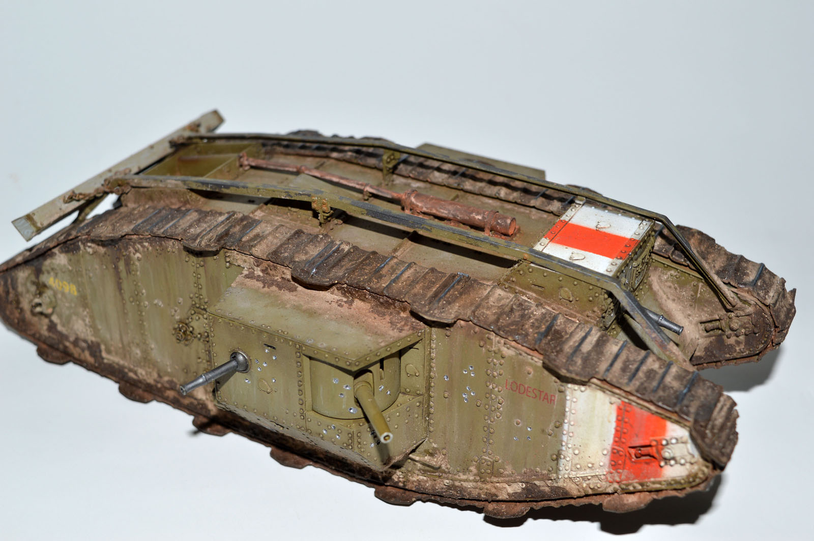 Этот цвет по-разному описывают ветераны и как «Серый Коричневый», и как «Грязно Коричневый», или даже как «цвет молочного шоколада». Цветные фотографии неизвестны, и интерпретация Черный/Белый в изображениях проводится с большими трудностями. Другие источники, особенно картины, могут быть полезны с обычной осторожностью. Художник WB Adeney написал две акварели, одна озаглавлена "Танки проходят вдоль дороги во Франции", а другая акварель называется "Maрк V вступает в действие". В обеих картинах, изображение Mk IV и Mk V Самка чрезвычайно подробные и точные, и, следовательно, можно с полным основанием предположить, что оба основных цвета использованы (светло-коричневый в обоих случаях) и порядковый номер, показал (9891 , цифра находится в правильном диапазоне танков Maрк V) также являются правильными. В последнем случае, это была возможность сравнить картину с фотографией того самого танка, чтобы рассматривать работу Adeney, как надежной. Другие художники изображали похожие оттенки, в том числе некоторые из них сейчас находятся в распоряжении полкового штаба Королевского танкового полка. Этот коричневый не шоколадного цвета, как мы думаем об этом, но несколько более светлого оттенка - его даже можно описать как темный загар. Это не любой из коричневый / хаки цветов, упомянутых выше, поэтому будем использовать название "Танковый коричневый", чтобы описать это. Конечно, контраргумент против этого рассуждения о том, что Adeney просто учитывал покрытие пылью, которая смягчила темно-коричневый! Тем не менее, еще одна форма поддержки доказательство исходит из модели локомотивной компании North British, паровоз Mk Vlll, на выставке в танковом музее Бовингтона. Он никогда не был перекрашен, и как эта фирма на самом деле делала танки, вероятно, это дает лучшее представление истинного цвета, который является на сегодняшний день.