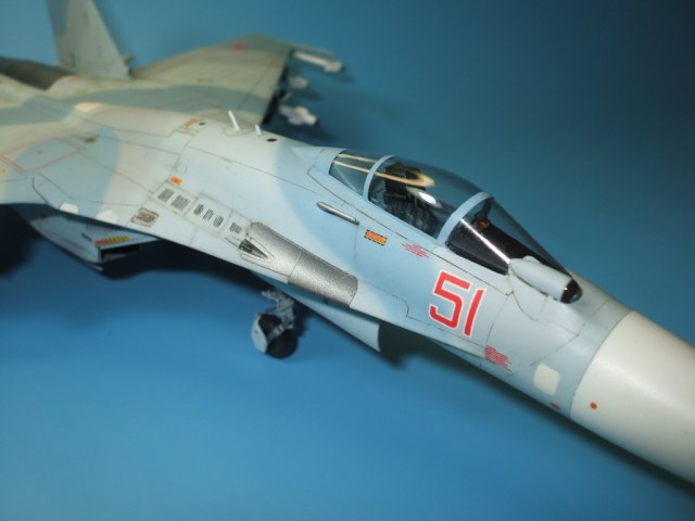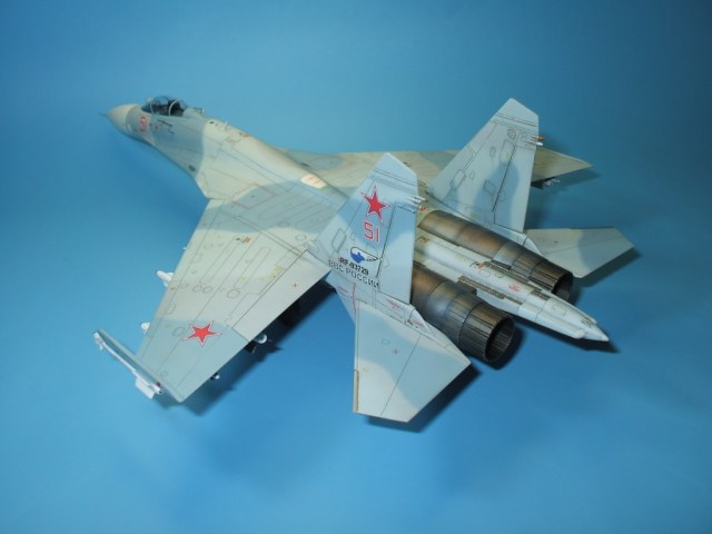 Доброго времени суток, уважаемые каропчане. Хочу предоставить вашему вниманию модель российского истребителя Су-27СМ от всенародно любимой фирмы «Звезда». Модель выполнена на заказ из коробки с упором на покраску и близость с оригиналом – борт красный 51 (фотки борта прилагаются).Для облегчения труда, вместе с моделью заказчик передал тематический набор водорастворимых красок АКАН для Су-27. Как и обговаривалось изначально модель собиралась изкоробочно, хотя на мой взгляд модель вполне самодостаточная и изготовлена на таком уровне , что пихать в нее какой либо автомаркет решиться разве что модельный маньяк, или заставит суровая жизненная необходимость. В сборке модель очень понравилась – сборка не простая но крайне интересная – качество литья, деталировка, стыкуемость, все на высшем уровне! Но и пройти мимо некоторых «нюансов»и не поворчать не могу… При всей шикарности модели есть минус который бросается в глаза – расшив. Он прекрасно выполнен на плоскостях и на стабилизаторах, на задней части фюзеляжа и на килях… , а вот на передней части фюзеляжа и на носовой части он сильно замылен, на передней нижней он практически теряется. Хотя конечно это все мелочи, и при желании все элементарно восстанавливается при помощи острого скальпеля. Сюрприз преподнесла декаль: прекрасная печать, тонкий лаковый слой, без смещений, НО… будьте готовы к тому, что практически все элементы декали переразмерены, места для нанесения технички не везде указаны верно, и часть ее вообще неуказанна … хотя данный недостаток модели устраняется проще всего, - путем приобретения отдельной декали, благо выбор широк. В первые в своей практике использовал краски АКАН, первые впечатления очень положительные, не HobbyColor конечно, но я несколько ожидал худшего. Единственное что, так я несколько скорректировал цвета. Камуфляжный темноголубой и серый были одного тона, поэтому пришлось несколько затемнить голубой и высветлить серый, что на мой взгляд больше соответствует прототипу на фотографиях. Сопла и остальной «металл» красил смесями на основе Silverи Steel от HobbyColor с добавлением синего и красного лака от того же производителя. Модель собиралась без доработок, но ведь так не бывает – не смог удержаться и сделал из фольги фары на переднюю стойку и из мед. игл носовой ПВД , и то только по тому, что в процессе работы несколько раз сломал оригинал.